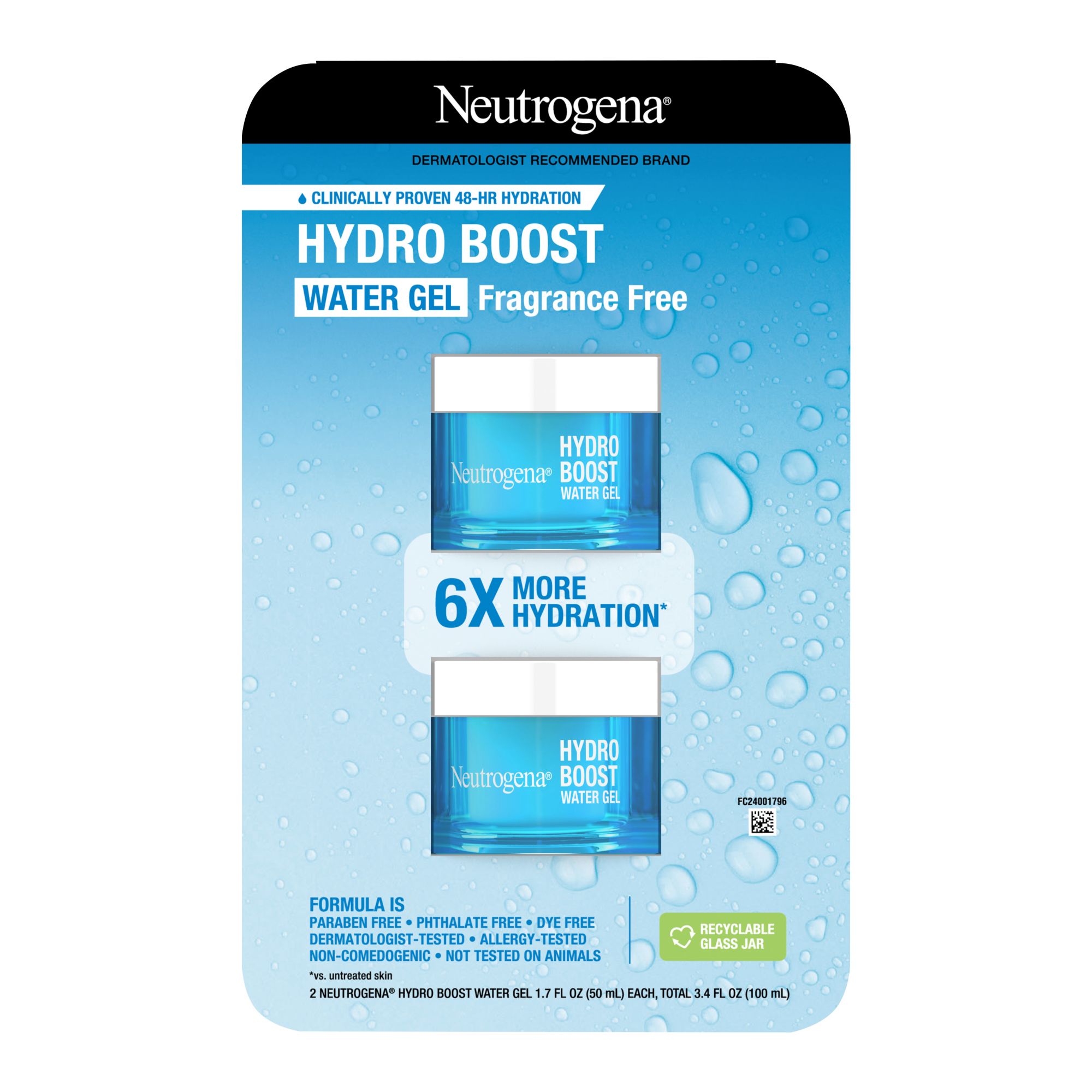 Neutrogena Hydro Boost Water Gel Face Moisturizer with hyaluronic acid delivers a refreshing burst of hydration to reveal glowing skin. Ideal for dry, sensitive, and acne-prone skin, this facial moisturizer from a dermatologist-recommended skin care brand instantly delivers 6x more hydration compared to untreated skin. The face moisturizer is formulated with hyaluronic acid, a dermatologist-recommended hydrator that binds to water and holds it within skin's surface, plus Natural Moisturizing Factors, including amino acids and electrolytes to help attract water and restore skin's moisture balance. The water gel is clinically proven to hydrate skin for 48 hours, leave skin looking healthier after two weeks and more radiant after four weeks. The gentle formula of the daily moisturizer is free of fragrance, dyes, parabens, phthalates and non-comedogenic, so it won't clog pores. To use as part of your daily skin care routine, apply the hydrating gel to face and neck daily after cleansing.