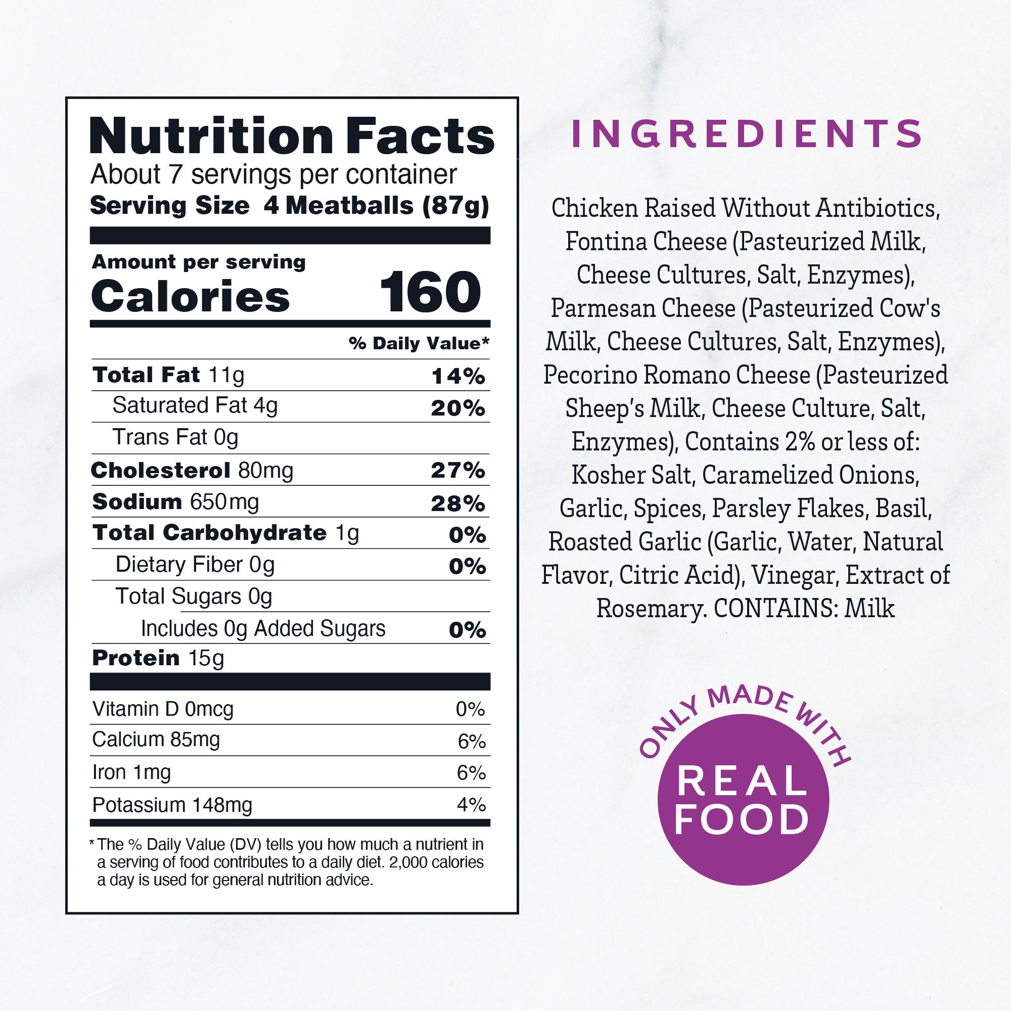 Ingredients: Chicken Raised Without Antibiotics, Fontina Cheese (Pasteurized Milk, Cheese Cultures, Salt, Enzymes), Parmesan Cheese (Pasteurized Cow's Milk, Cheese Cultures, Salt, Enzymes), Pecorino Romano Cheese (Pasteurized Sheep’s Milk, Cheese Culture, Salt, Enzymes) , Contains 2% or less of: Kosher Salt, Caramelized Onions, Garlic, Spices, Parsley Flakes, Basil, Roasted Garlic (Garlic, Water, Natural Flavor, Citric Acid), Vinegar, Extract of Rosemary. CONTAINS: Milk