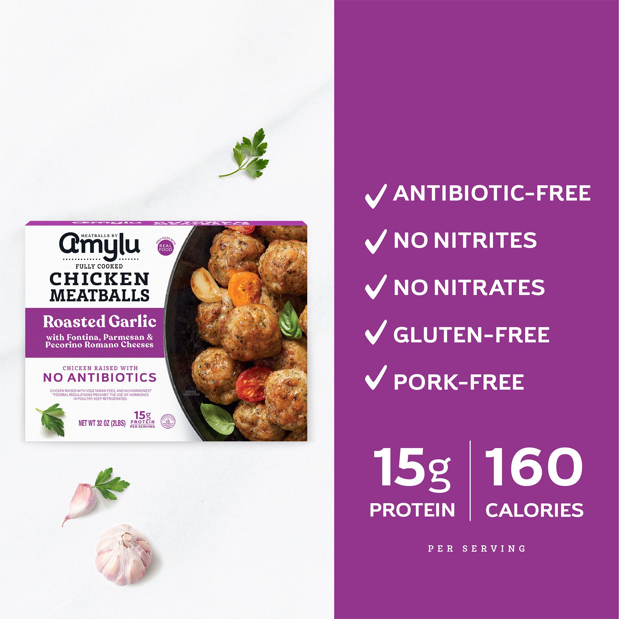Enjoy the rich and flavorful taste of Amylu Foods Roasted Garlic Chicken Meatballs. Made with antibiotic-free chicken, these premium meatballs are crafted with simple, clean and high-quality ingredients, are gluten-free, pork-free, and have no fillers or preservatives. The carefully crafted and savory blend of roasted garlic paired with a trio of cheeses – Fontina, Parmesan, and Pecorino Romano, brings authentic culinary taste and depths of flavor to your kitchen. Each serving packs 15g of protein and 160 calories, making it a perfect choice for healthy quick meals, snacks, or appetizers. Our meatballs are fully-cooked, allowing you to prepare high-quality and nutritious dishes quickly – combining premium ingredients and gourmet flavors with unmatched convenience. Whether you’re eating clean or just want a satisfying meal or snack, these meatballs bring full flavor with wholesome ingredients you can trust and feel good about feeding the entire family.