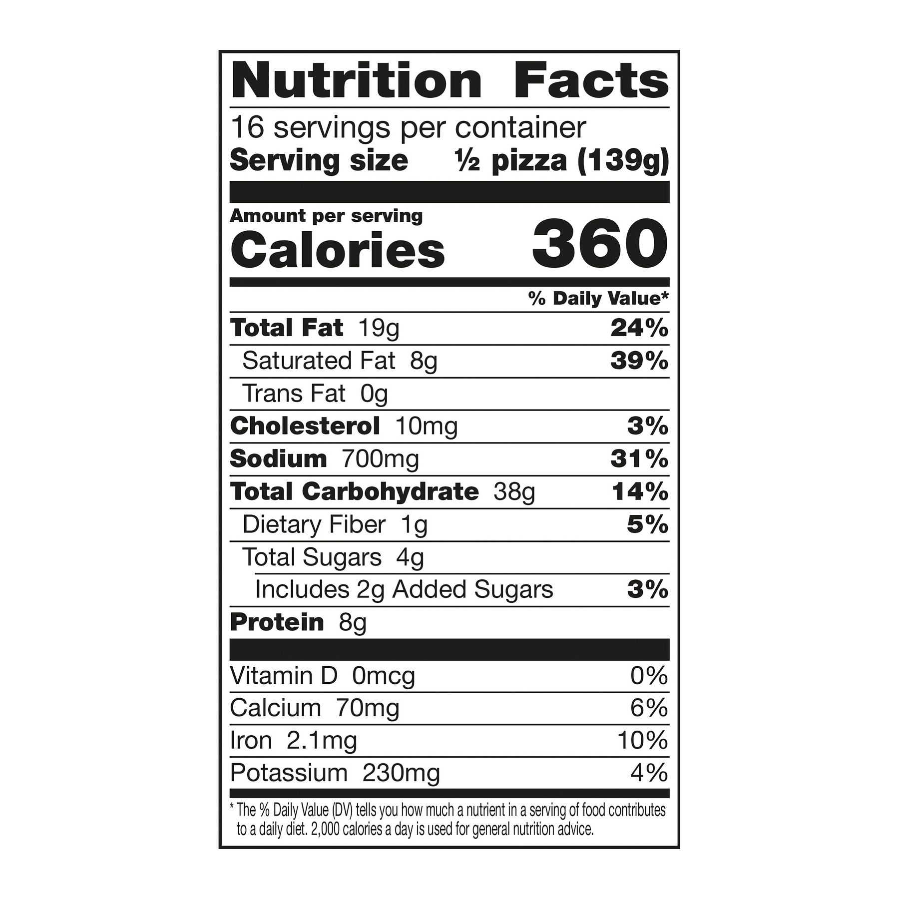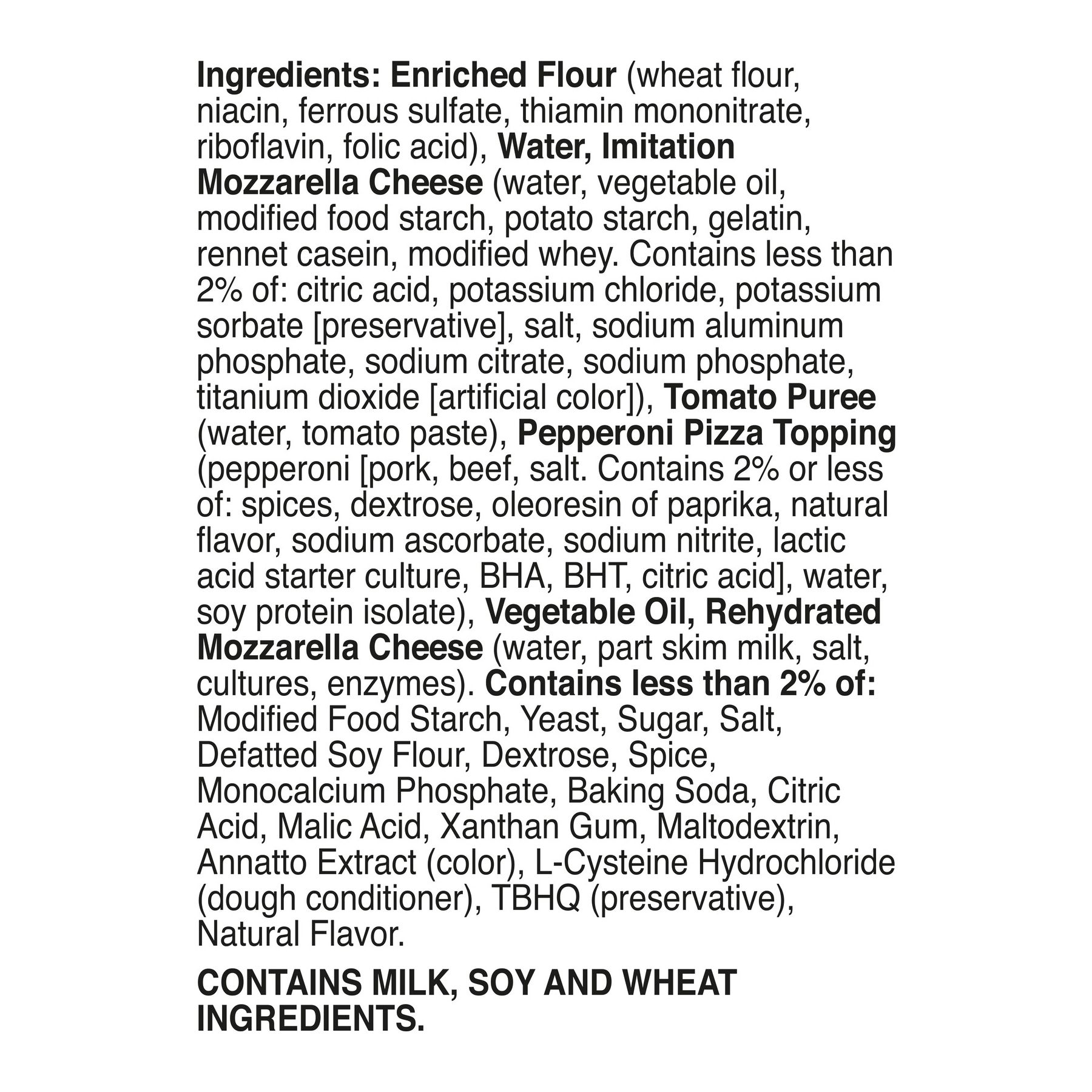 Ingredients: Enriched Flour (wheat flour, niacin, ferrous sulfate, thiamin mononitrate, riboflavin, folic acid), Water, Imitation Mozzarella Cheese (water, vegetable oil, modified food starch, potato starch, gelatin, rennet casein, modified whey. Contains less than 2% of: citric acid, potassium chloride, potassium sorbate [preservative], salt, sodium aluminum phosphate, sodium citrate, sodium phosphate, titanium dioxide [artificial color]), Tomato Puree (water, tomato paste), Pepperoni Pizza Topping (pepperoni [pork, beef, salt. Contains 2% or less of: spices, dextrose, oleoresin of paprika, natural flavor, sodium ascorbate, sodium nitrite, lactic acid starter culture, BHA, BHT, cirtic acid], water, soy protein isolate), Vegetable Oil, Rehydrated Mozzarella Cheese (water, part skim milk, salt, cultures, enzymes). Contains less than 2% of: Modified Food Starch, Yeast, Sugar, Salt, Defatted Soy Flour, Dextrose, Spice, Monocalcium Phosphate, Baking Soda, Citric Acid, Malic Acid, Xanthan Gum, Maltodextrin, Annatto Extract (color), L-Cysteine Hydrochloride (dough conditioner), TBHQ (preservative), Natural Flavor.