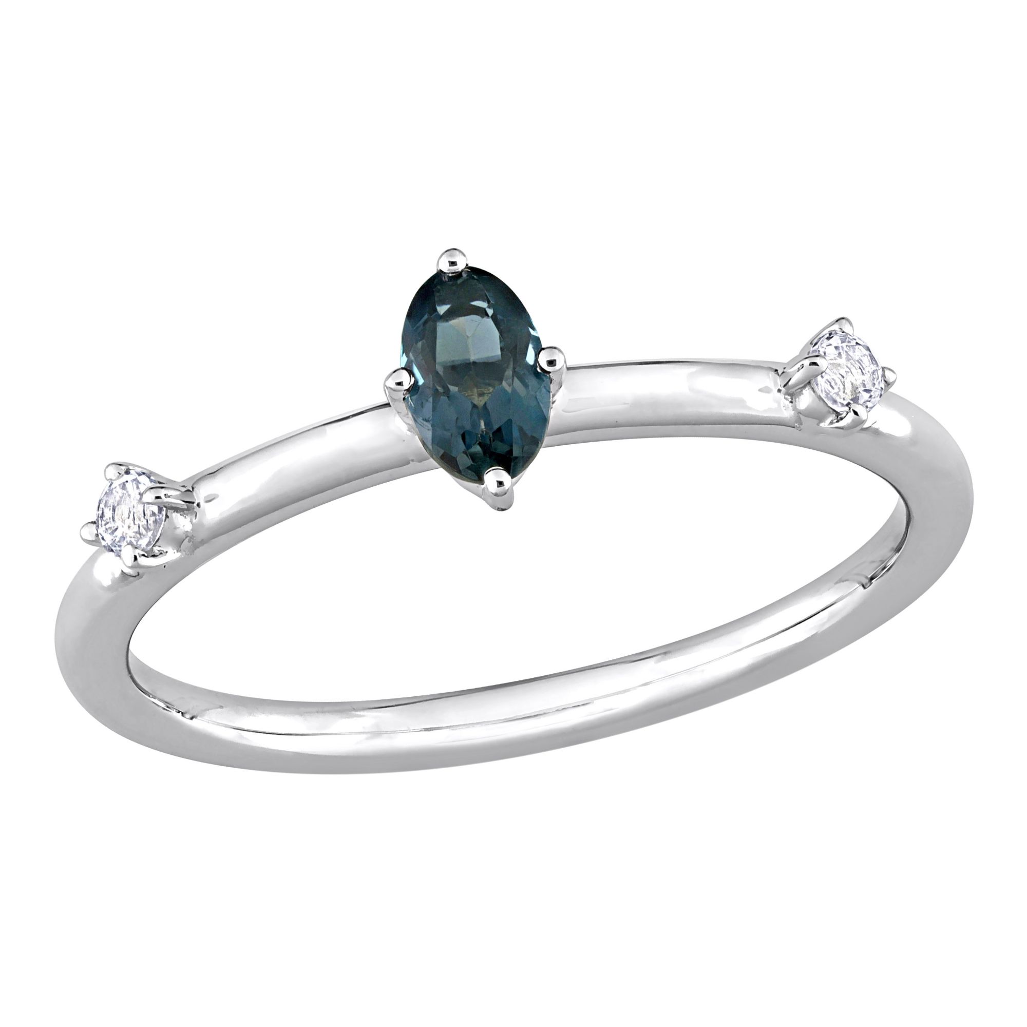 This pretty 3-stone stackable oval ring is crafted in 10k white gold and features an oval-cut, prong-set London blue topaz gemstone studded at the center with two round-cut, prong-set white topaz gemstone augmented on its band in station style. Enhanced with a high polished finish, this stackable ring is the perfect addition to any jewelry collection. Pair this trendsetting ring with any outfit and look elegant.