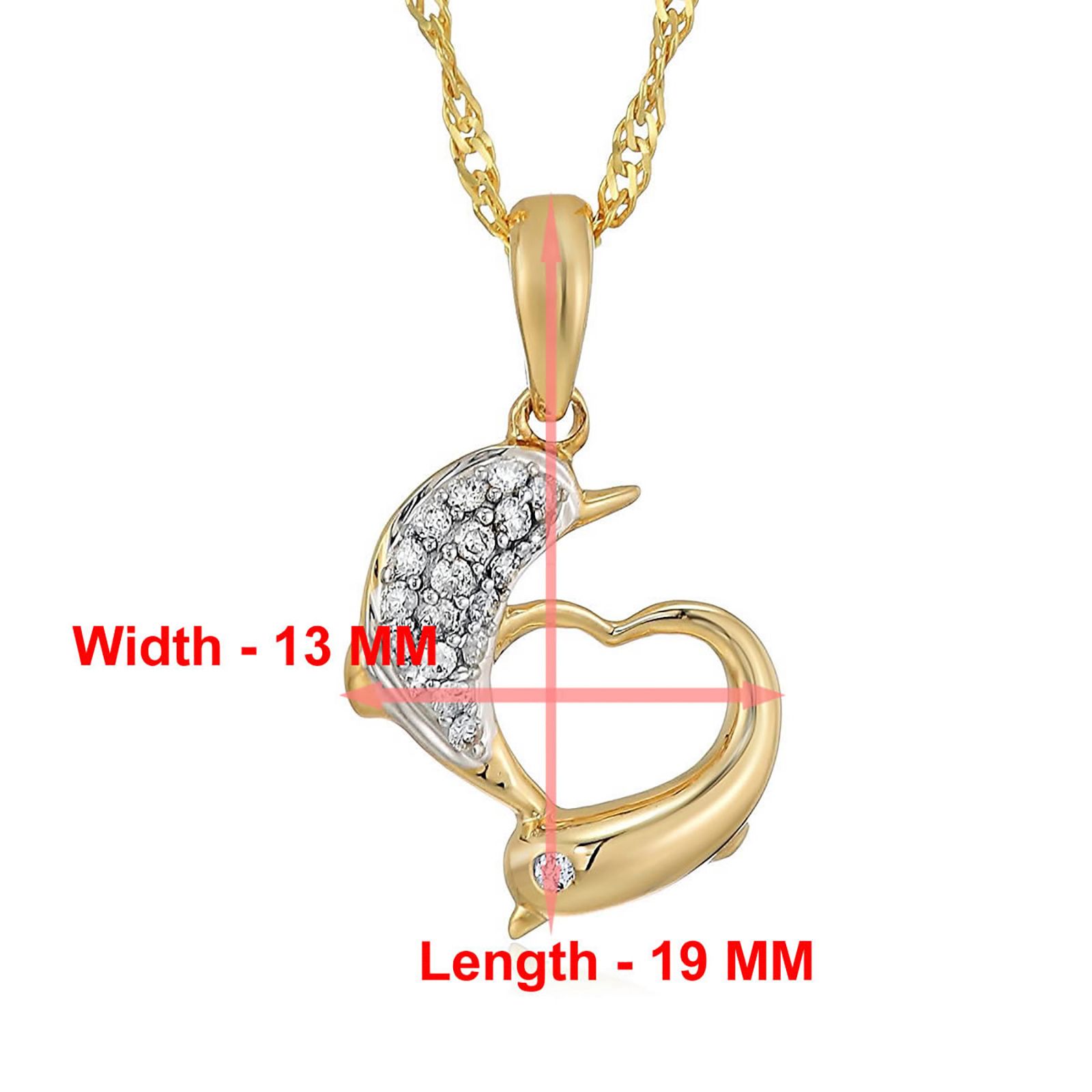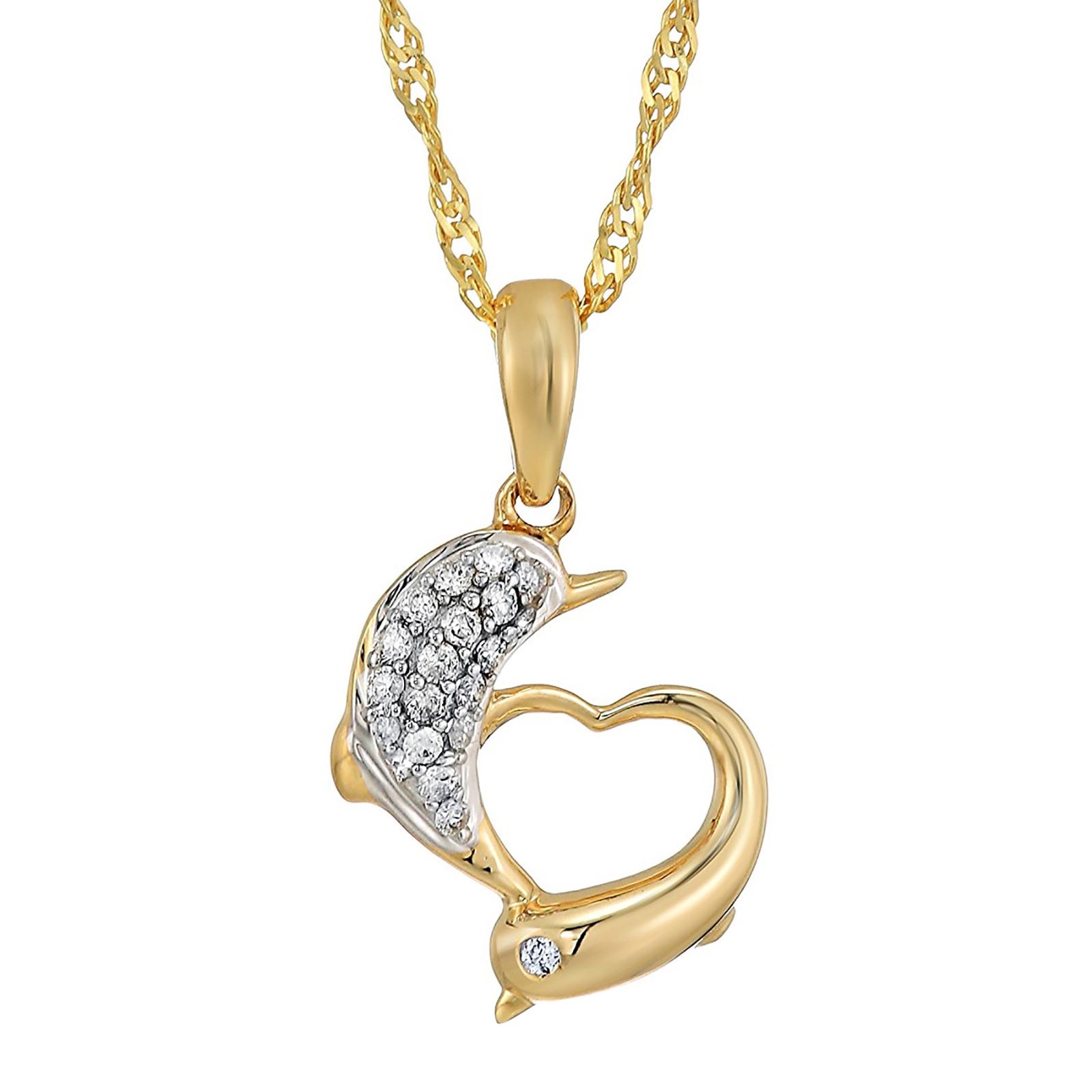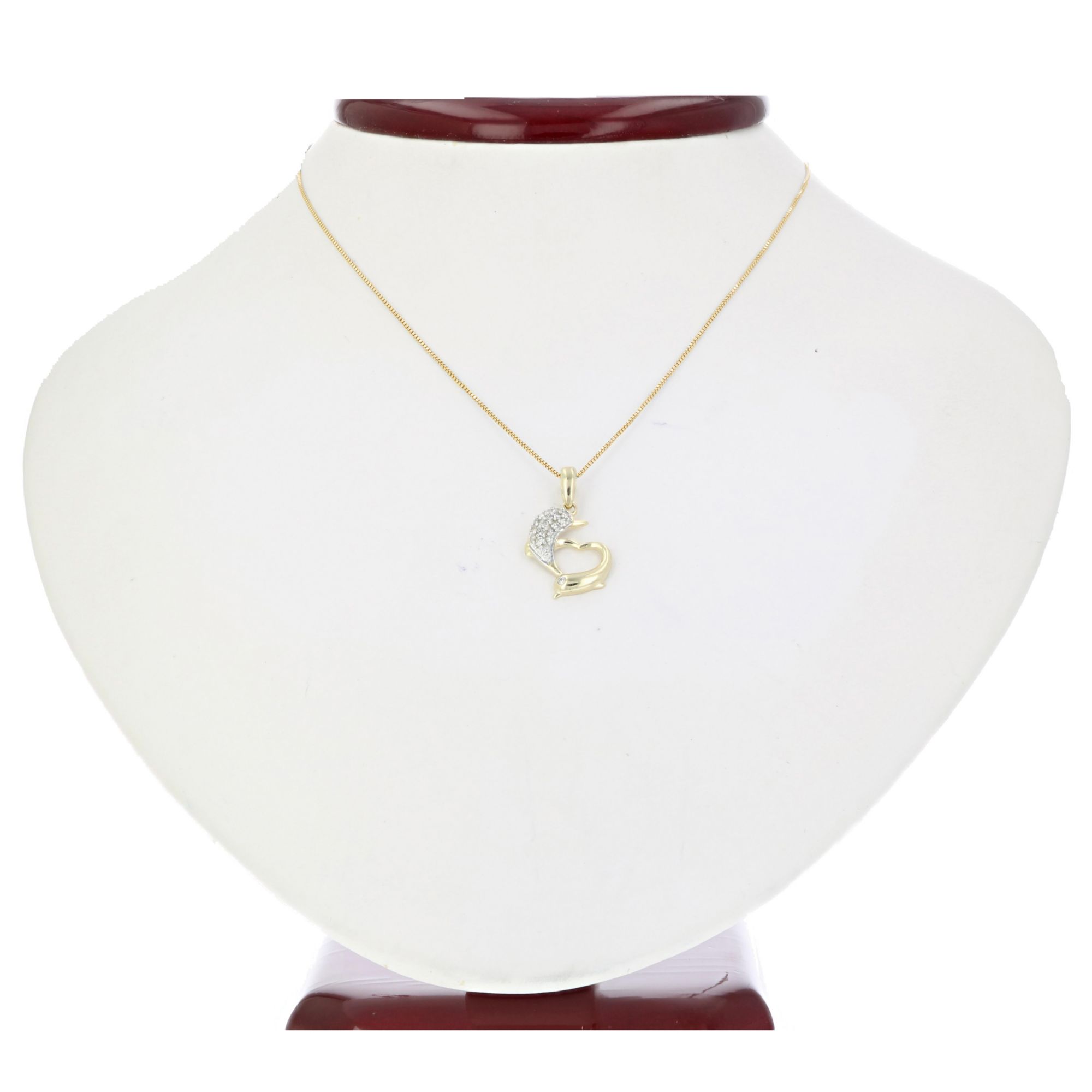 Playful dolphins leap together to make a beautiful heart of 14k gold and glittering diamonds. The pendant hangs on a beautiful sterling silver 18-inch box chain.