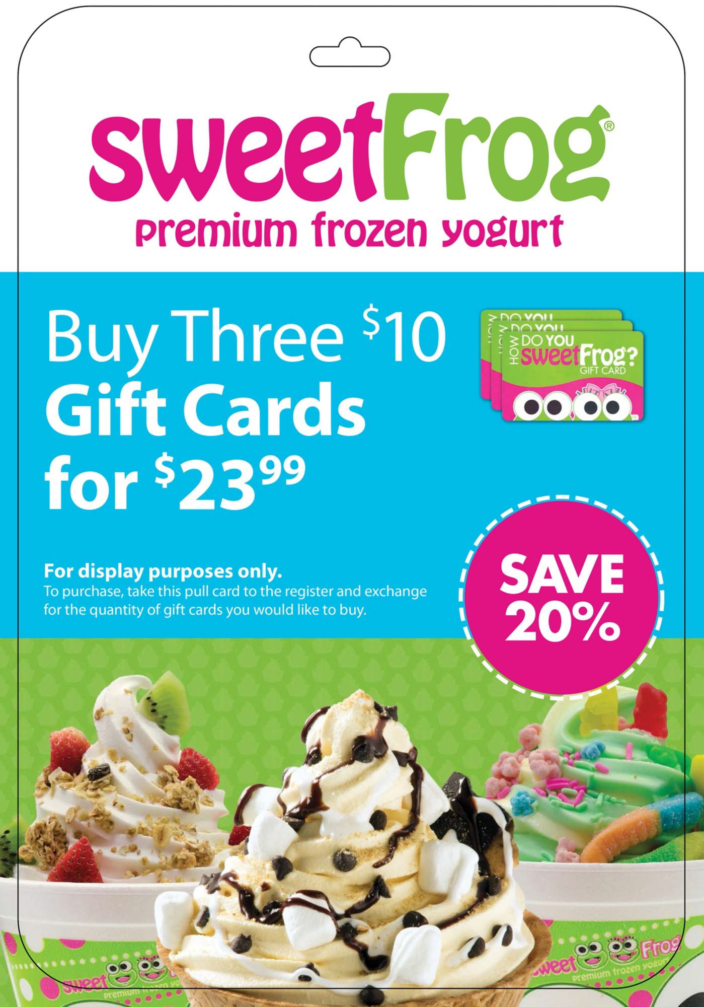 Named Best Frozen Yogurt in the USA by The Daily Meal in 2014 and 2016 Visit www.SweetFrog.com/giftcards for a list of participating locations Value: $10 each Includes 3 gift cards