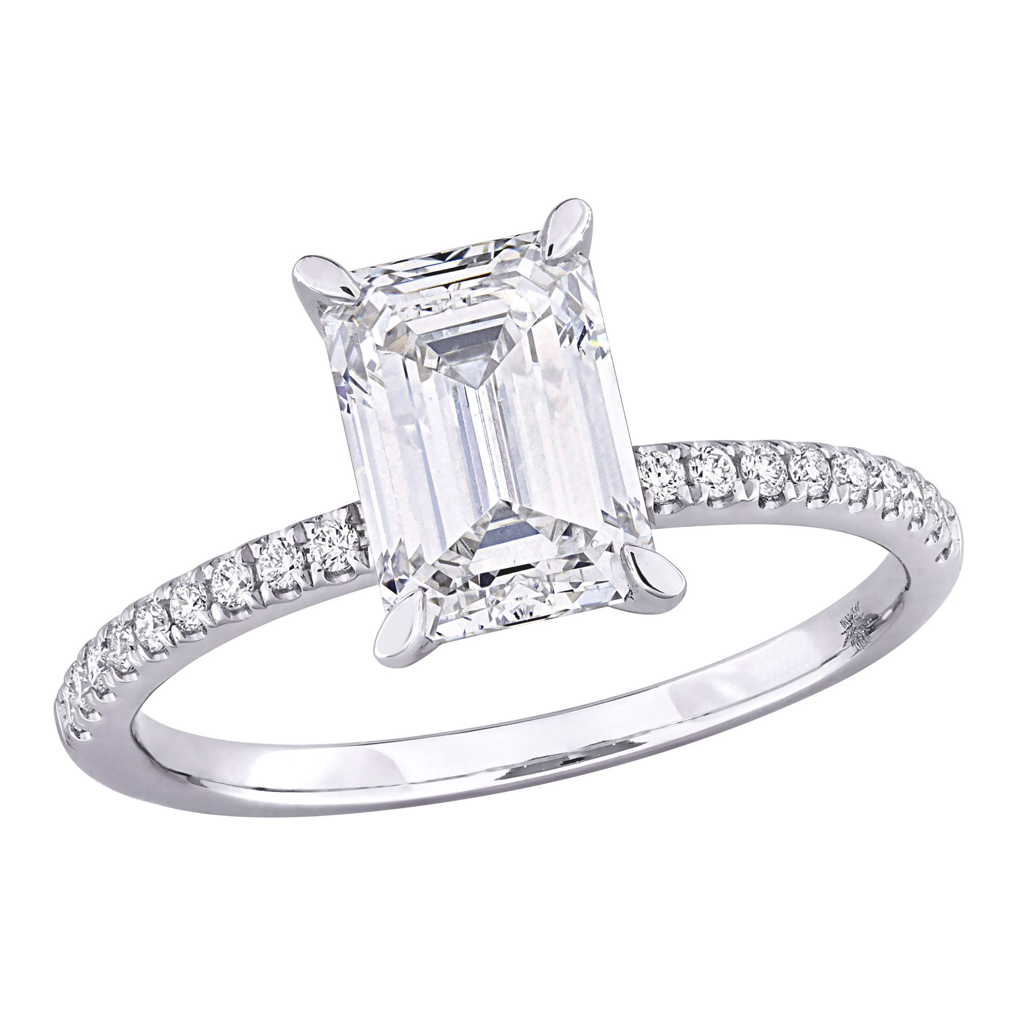 This beautiful solitaire ring is crafted in 14-karat white gold and showcases an emerald-cut lab-grown diamond at the center with additional smaller lab-grown diamonds along the slender band. This ring is enhanced with a high polish finish.