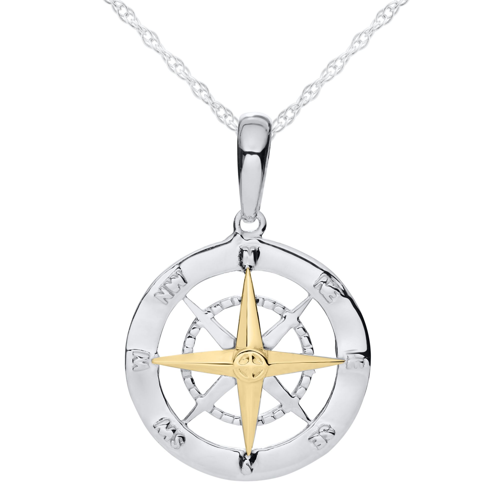 14K Gold and Sterling Silver Compass Rose Pendant Necklace with 18" Chain