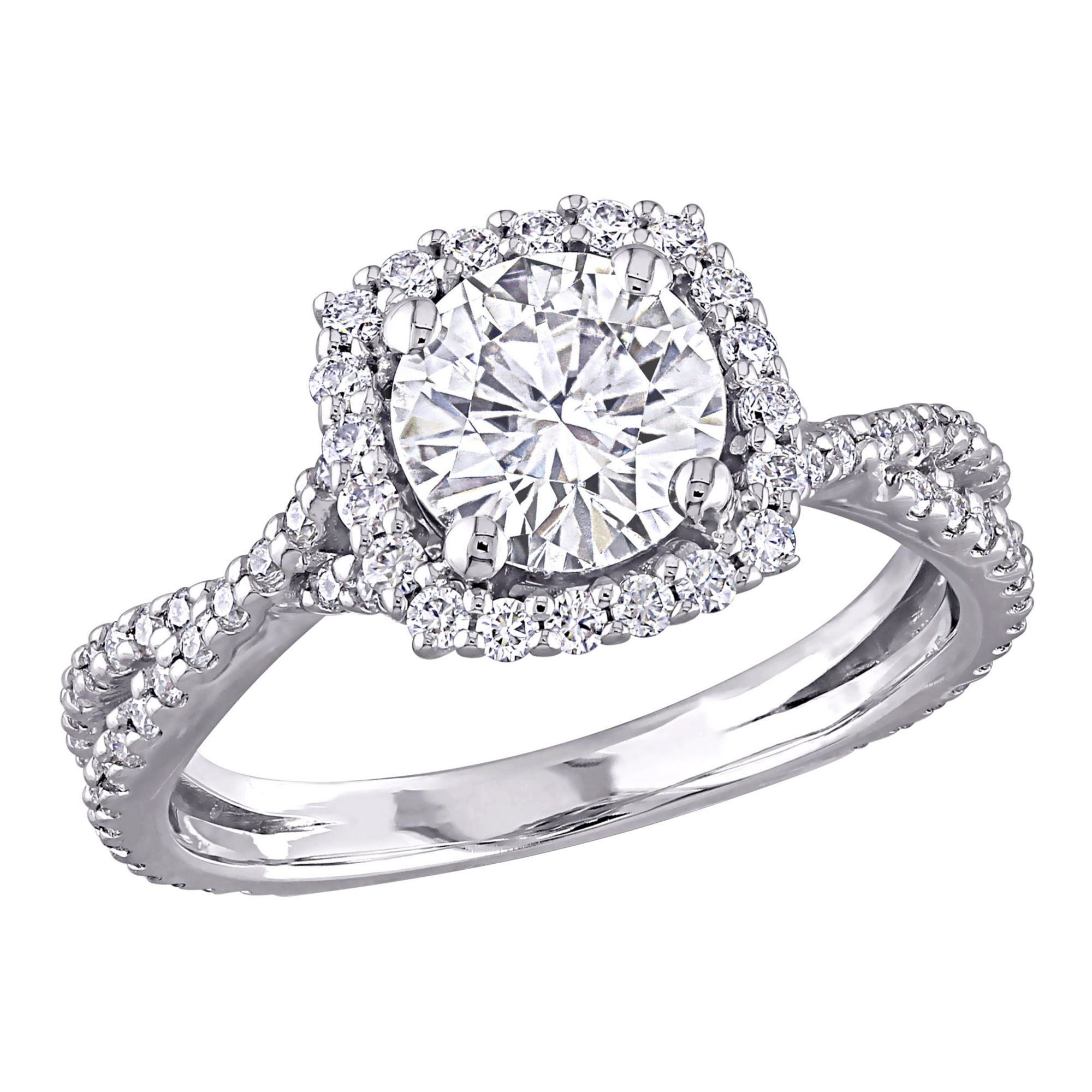 This trendsetting moissanite crossover engagement ring is crafted to perfection in lustrous 10k white gold and features a round-cut, prong-set shimmering created moissanite gemstone at the center along with 88 round-cut, prong and buttercup-set created moissanite gemstones set in a unique crossover square halo design. This ring is a perfect choice for today's contemporary woman with an elegant and sophisticated sense of style. Choose this piece for the woman you love as you celebrate this special milestone and begin the next chapter of your lives together.