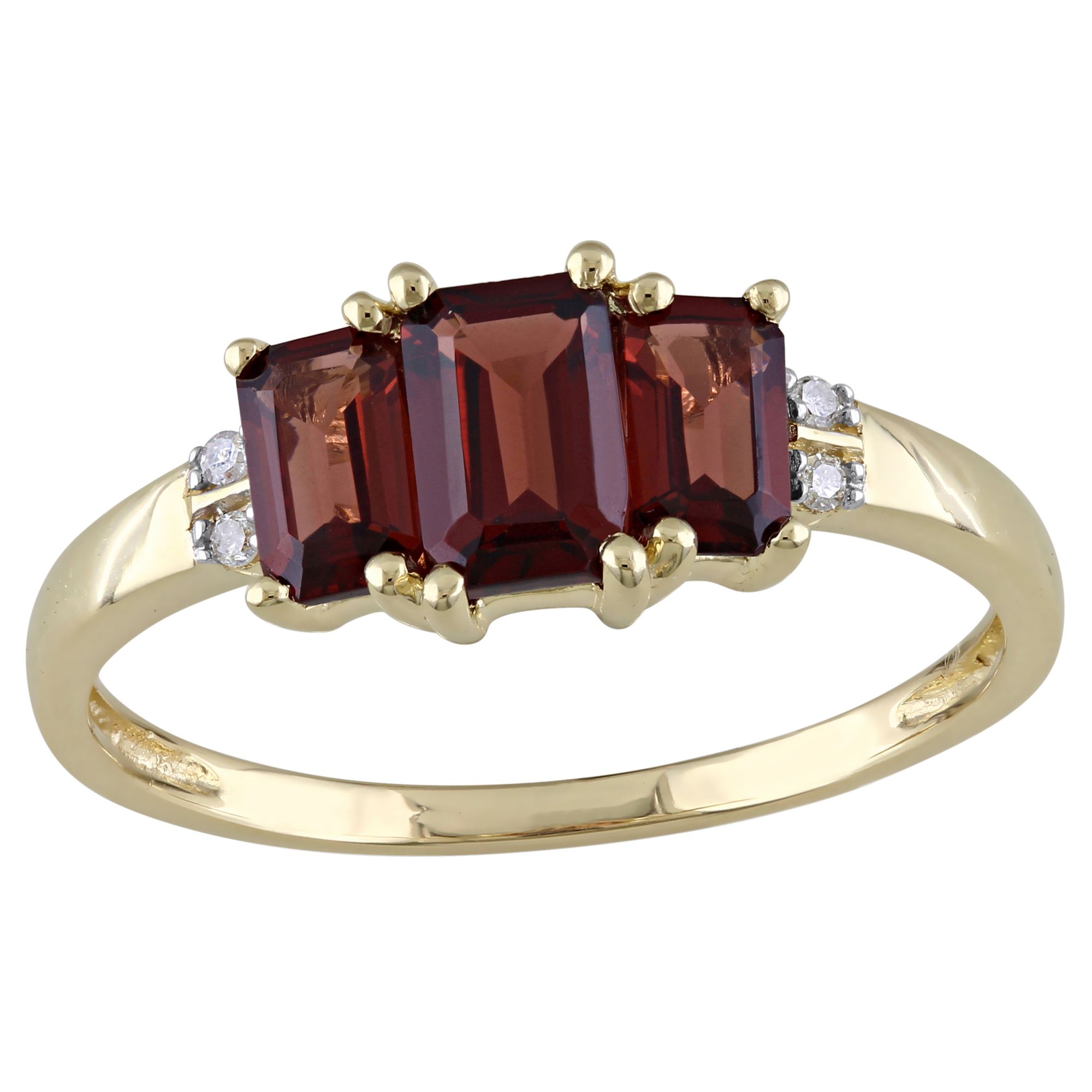 Set in 10k yellow gold 1.5 ct. t.g.w. garnet 0.02 ct. t.w. diamond Diamond quality: G-H/I2-I3 Includes 1-pc. 3-stone ring in 10k yellow gold