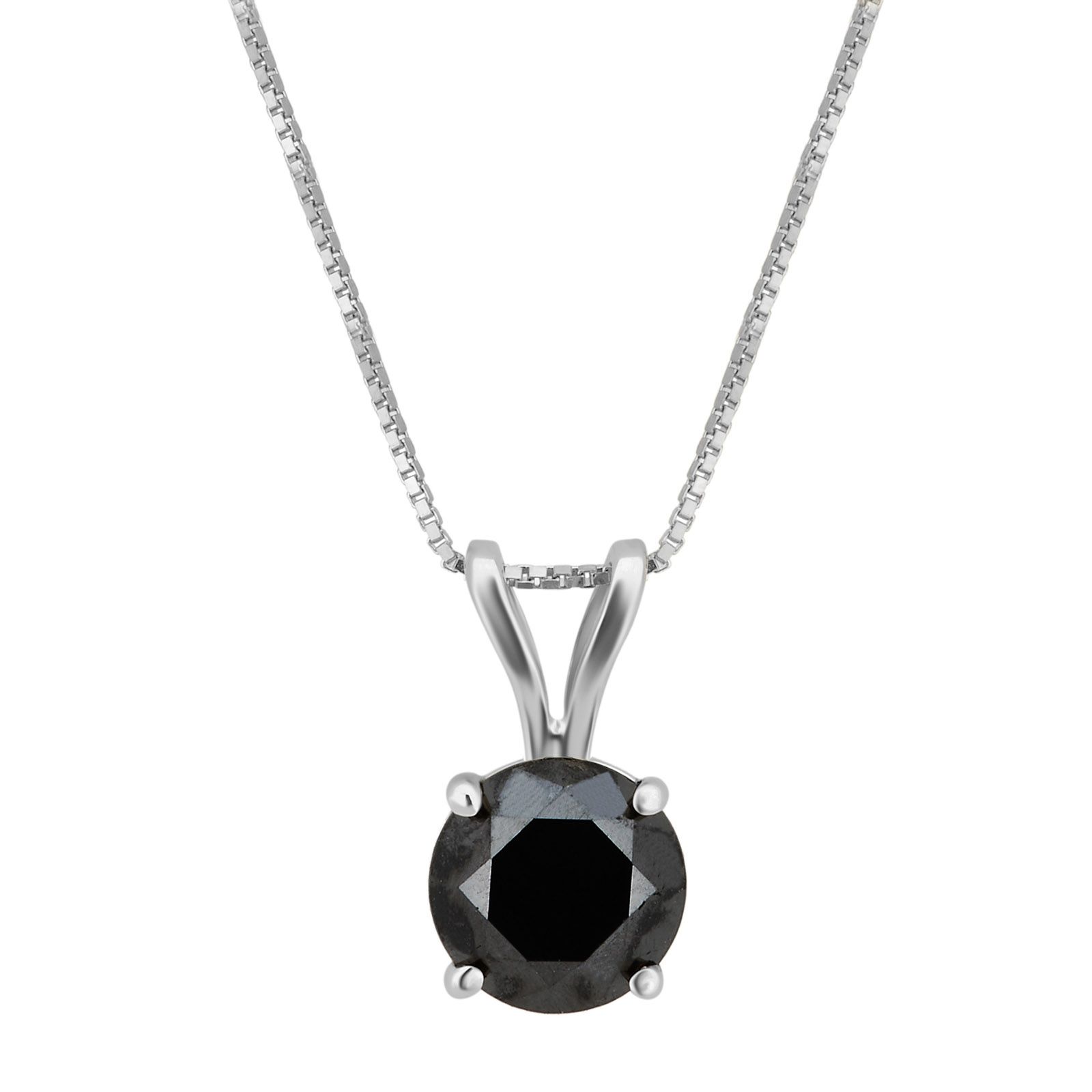 Style: Solitaire Necklace Carat/ct. t.w.: 2.00 ct. t.w. Cut: Round Color: J Count: 1 Gemstone: Black Diamond Lab Created: No Metal: 14k White Gold Finish: Polished Chain: Box Chain Clasp/Closure: Spring Ring Warranty: limited