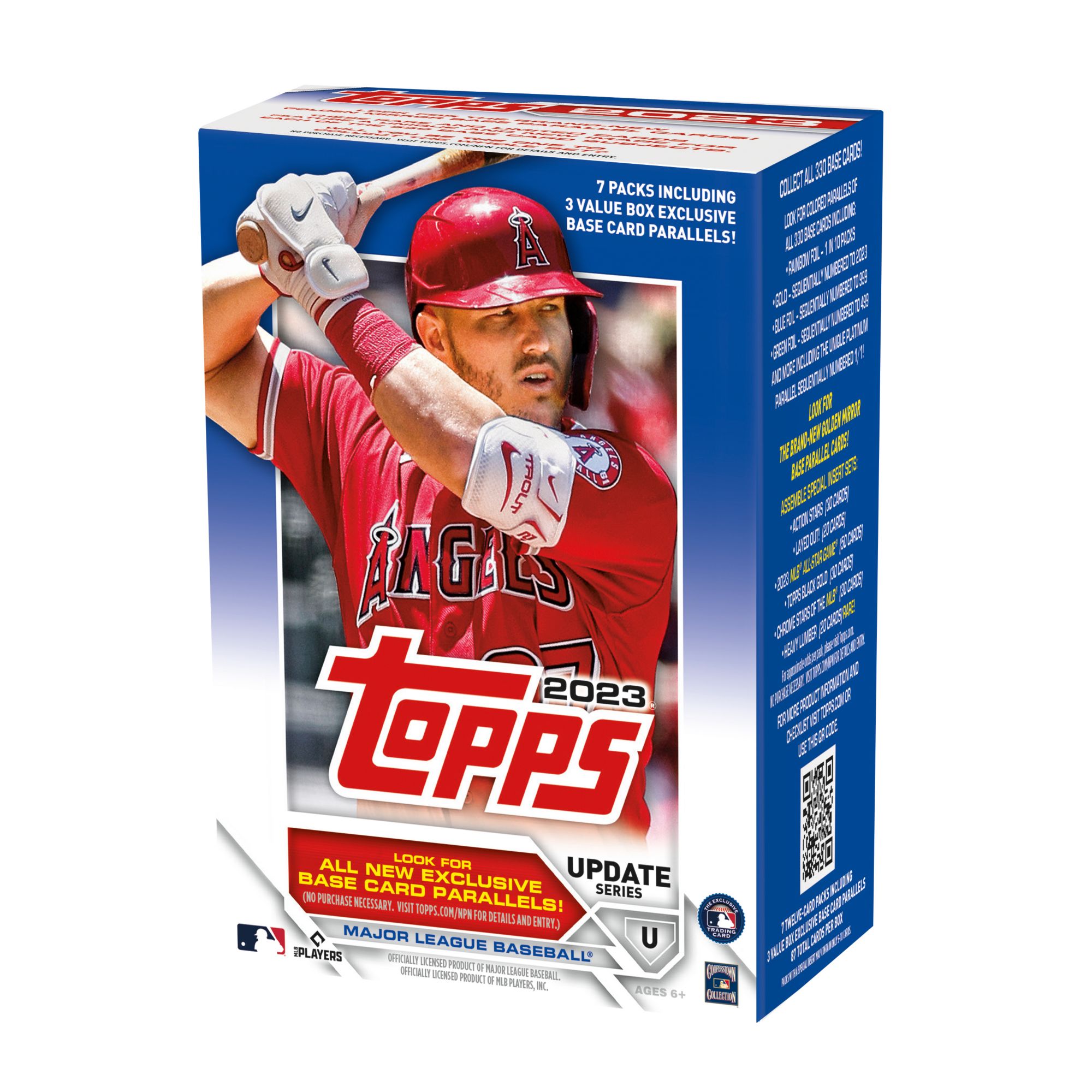 Includes 12 cards per pack. Seven packs per box. Each pack contains eleven 2023 Topps Baseball Updates Cards, one retail exclusive insert card. Each box is guaranteed three value box exclusive base card parallels