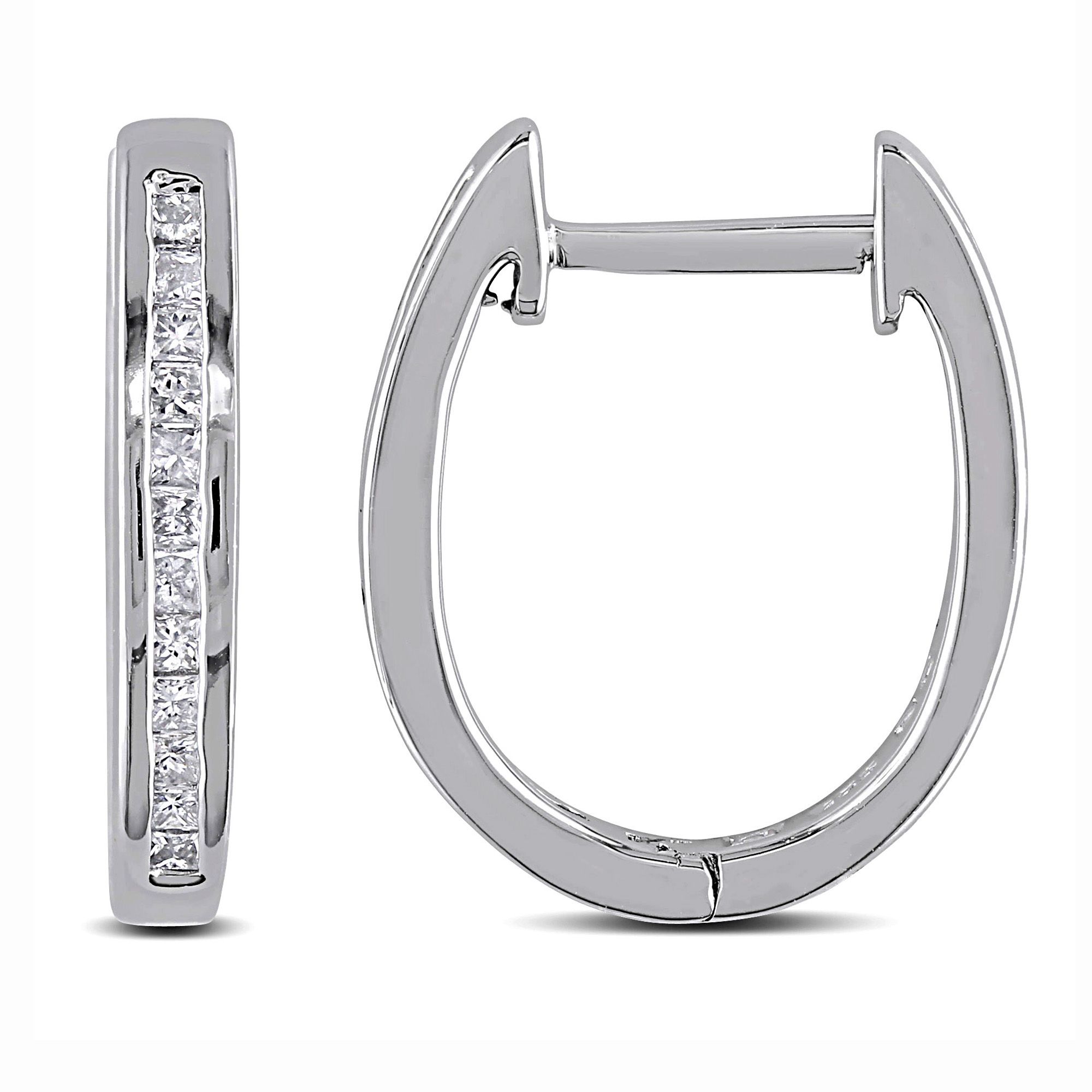 A classic and simple style, these sterling silver clip-back diamond earrings feature a slightly elongated hoop design channel set with a total of twenty-four shimmering princess-cut diamonds (G-H, I2-I3). Clip-back closures secure the earrings.