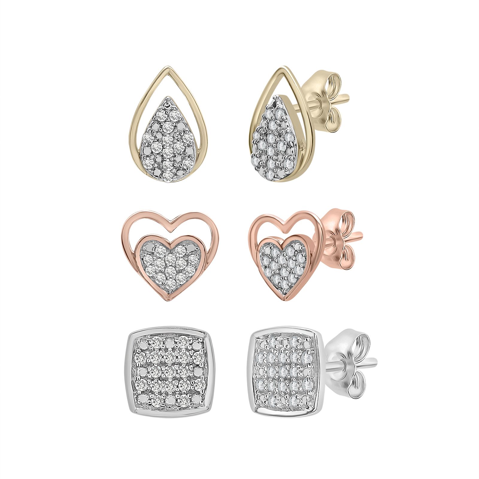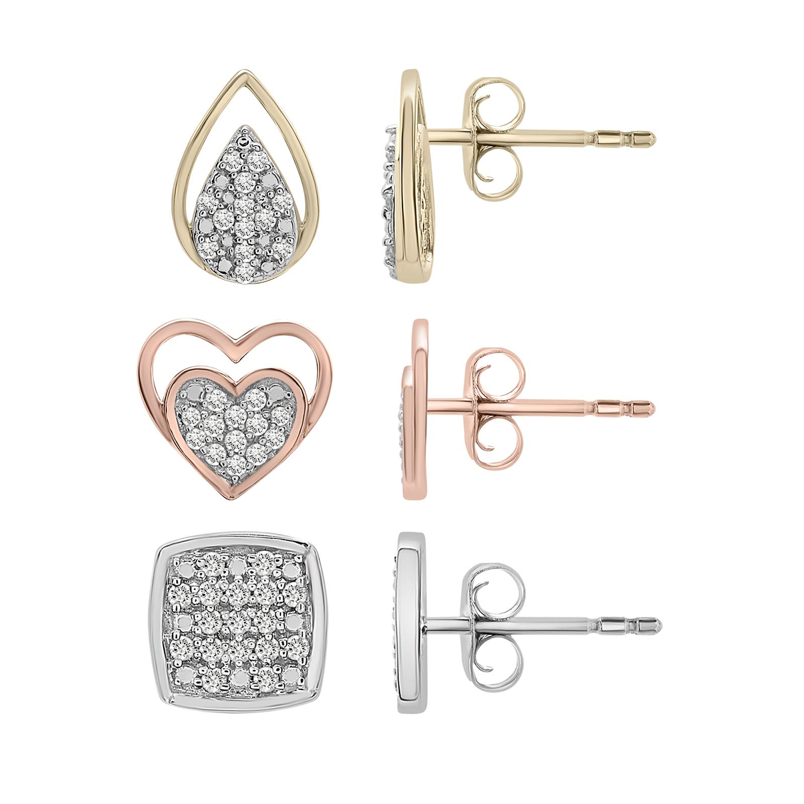 This .25 ct. t.w. Diamond 3 Piece Earrings Box Set in 10k Tri Color Gold is the perfect trio of earrings. Each pair is set in 10k tri color gold and its diamonds total .25 ct. t.w. These earrings make a great gift and are shipped in a convenient jewelry box.