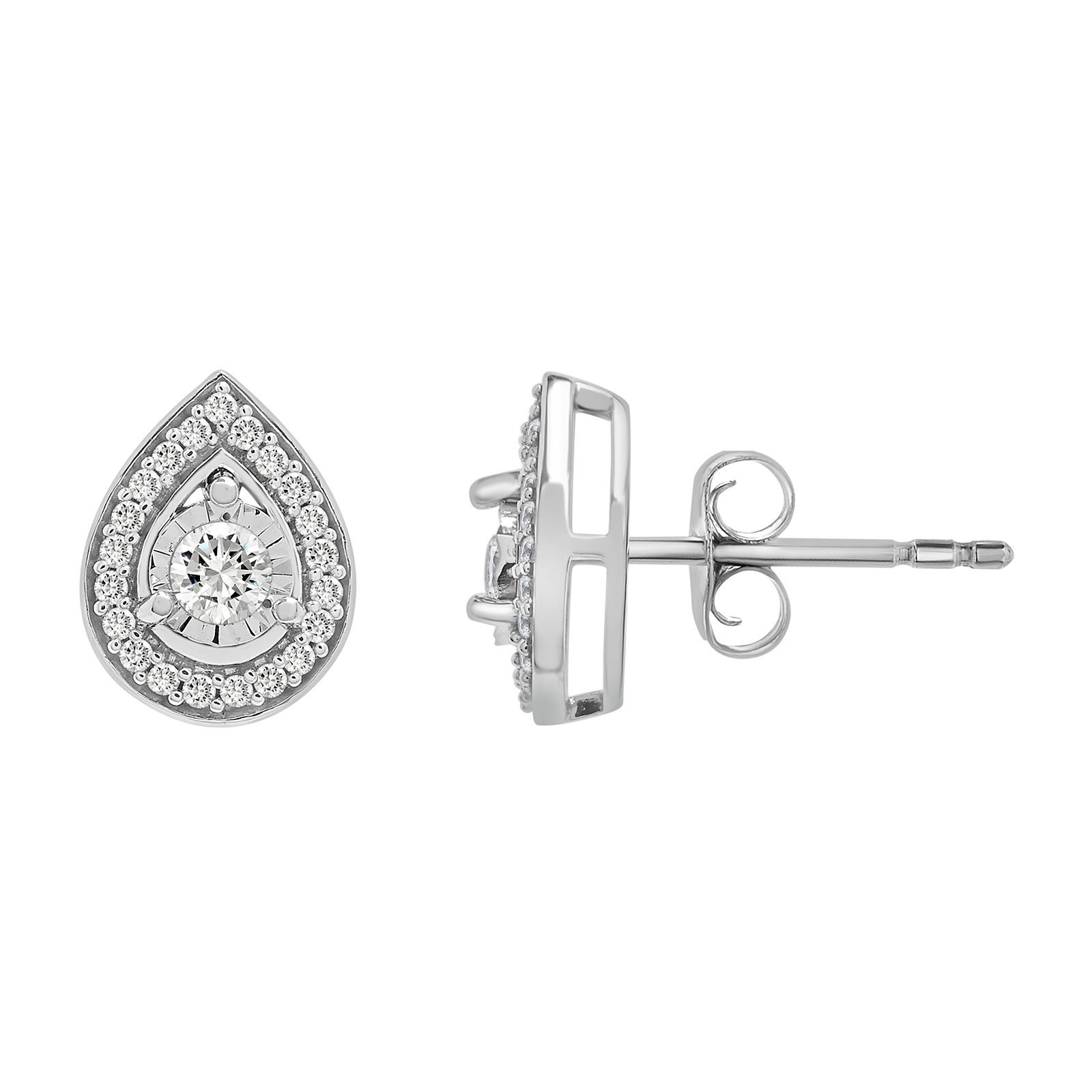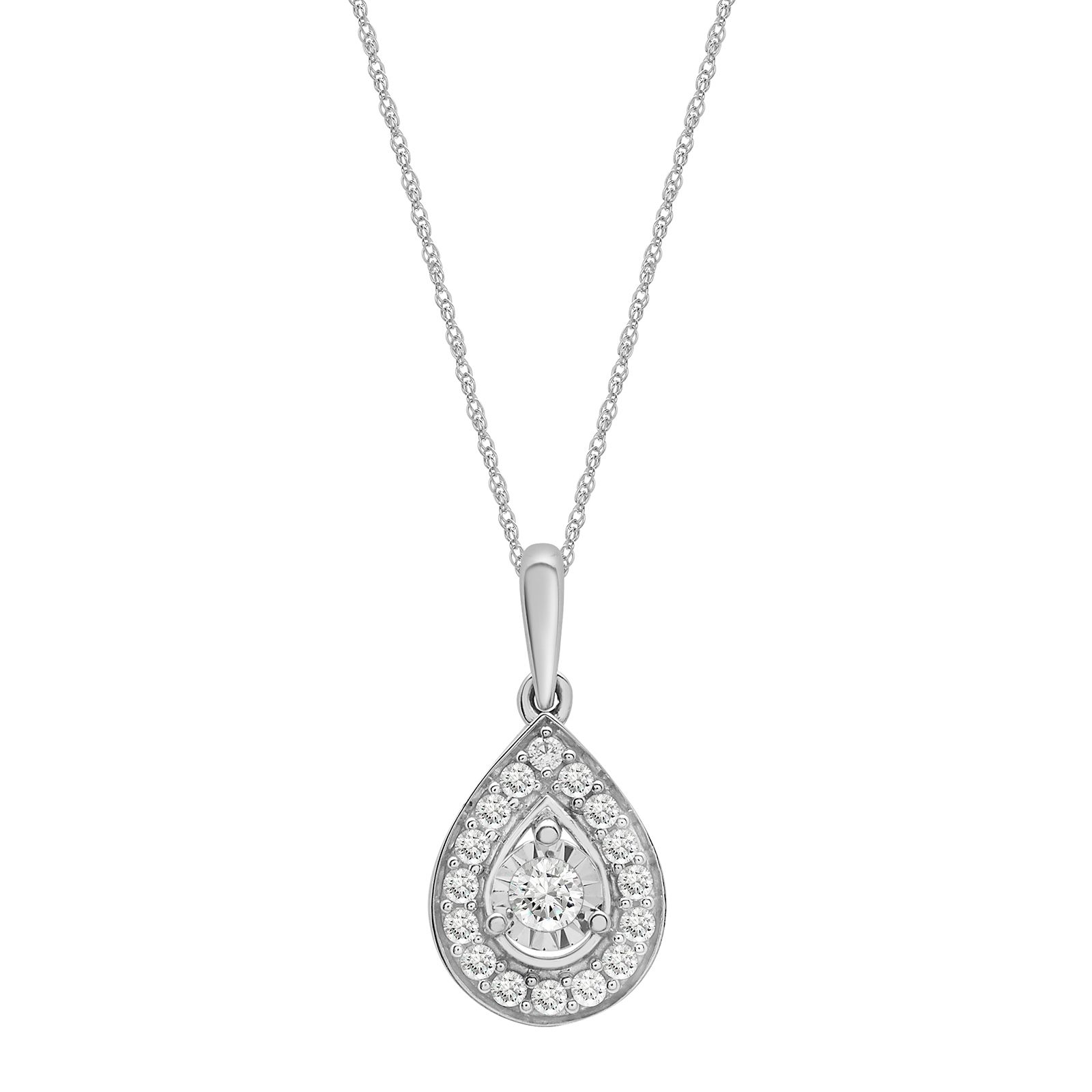 These stunning .25 ct. t.w. Diamond Miracle Plate Pear Shape Pendant Earrings in 10k White Gold feature a beautiful .25 ct. diamond. This pair is set in 10k white gold and set with round cut diamonds. These earrings make a great gift and are shipped in a beautiful jewelry box.