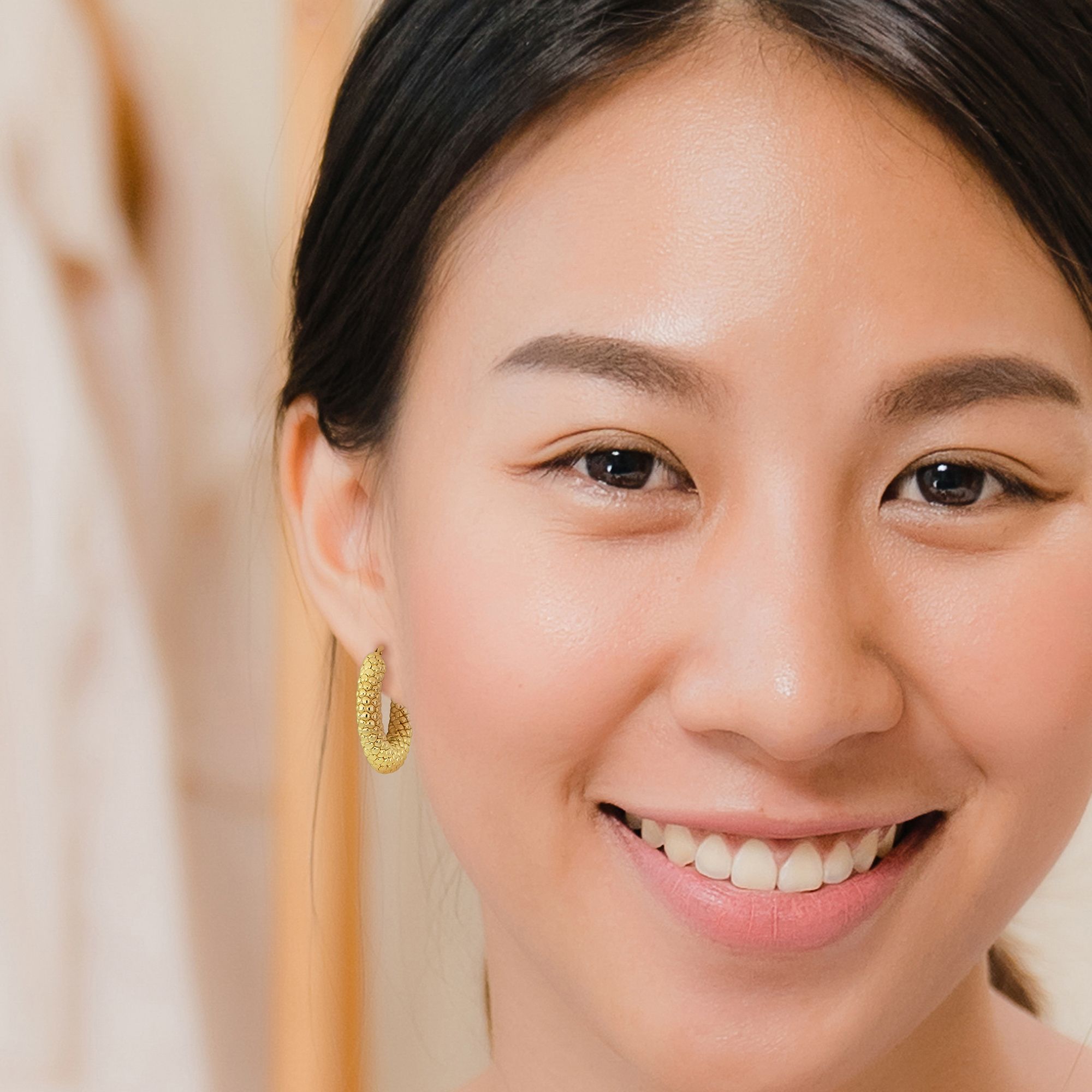These gorgeous beaded hoop earrings should be your go to choice for any occasion. Crafted in yellow plated sterling silver, they feature a beaded design all over the hoop. These beautiful earrings are easy to pair with simple bangles for a complete everyday look. Beautiful in its simplicity, the beaded look makes this piece of jewelry the perfect accessory. These earrings are secured with hinged back closures.
