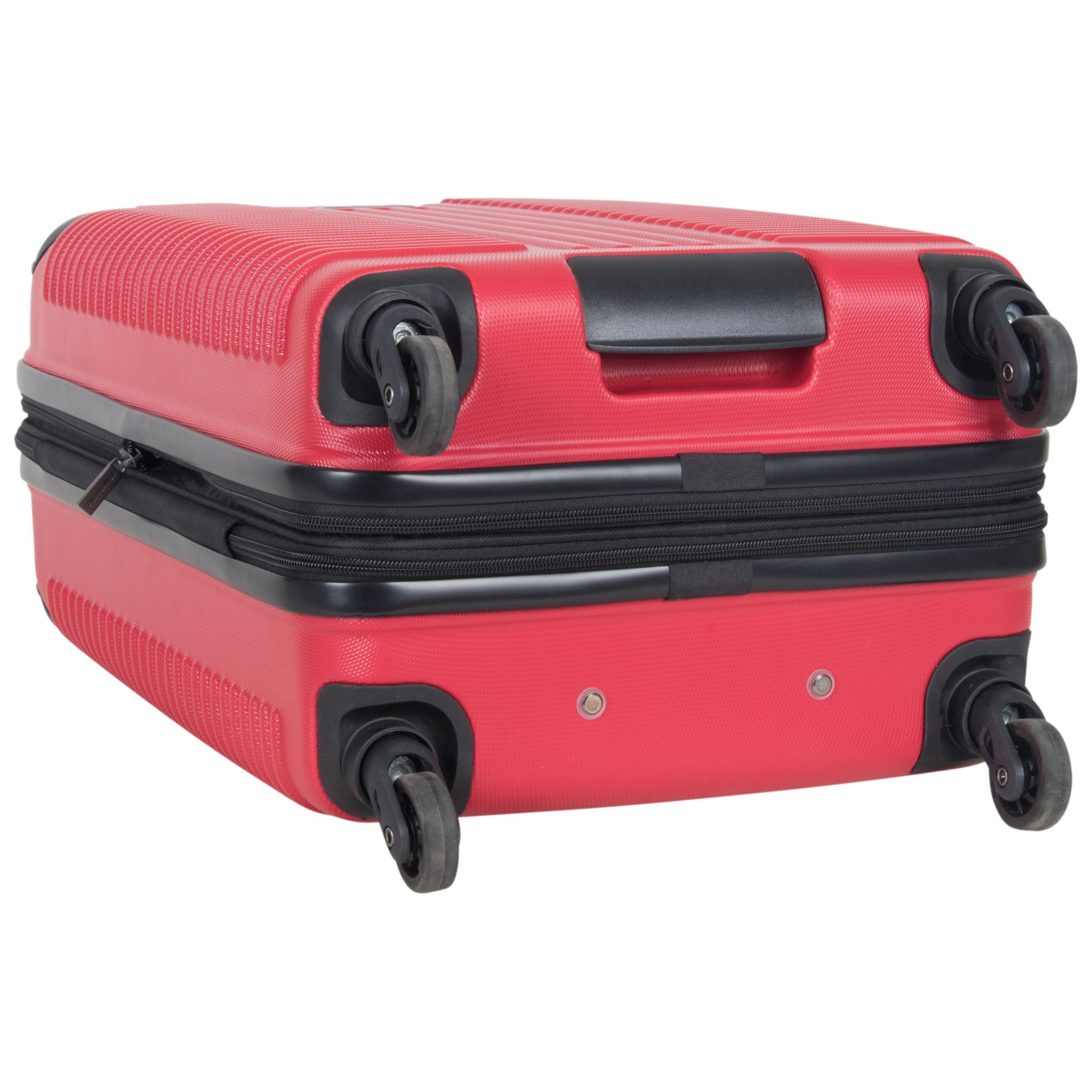 Lightweight high-strength ABS construction with reinforced corner guards 4-wheel spinners allow smooth 360° rotation Expandable 2" for added capacity Durable bottom grab handle and flexible top and side handles allows for easy lifting Molded feet allow for upright to stand on its side Locking sliders made with zipper pullers fit a TSA lock or pad lock for ultimate security Locking, retractable trolley handle has a convenient push button mechanism High-strength, hard-side ABS exterior with a tear-resistant, fully lined interior Main compartment interior includes a secure buckled garment panel flap with a hanging side zipper pocket to store smaller items Under the lid interior consists of a u-shaped zipper compartment and a full length ventilated mesh zipper pocket Includes 20" carry-on luggage and 28" check luggage Red Warranty: Yes. 10 years limited
