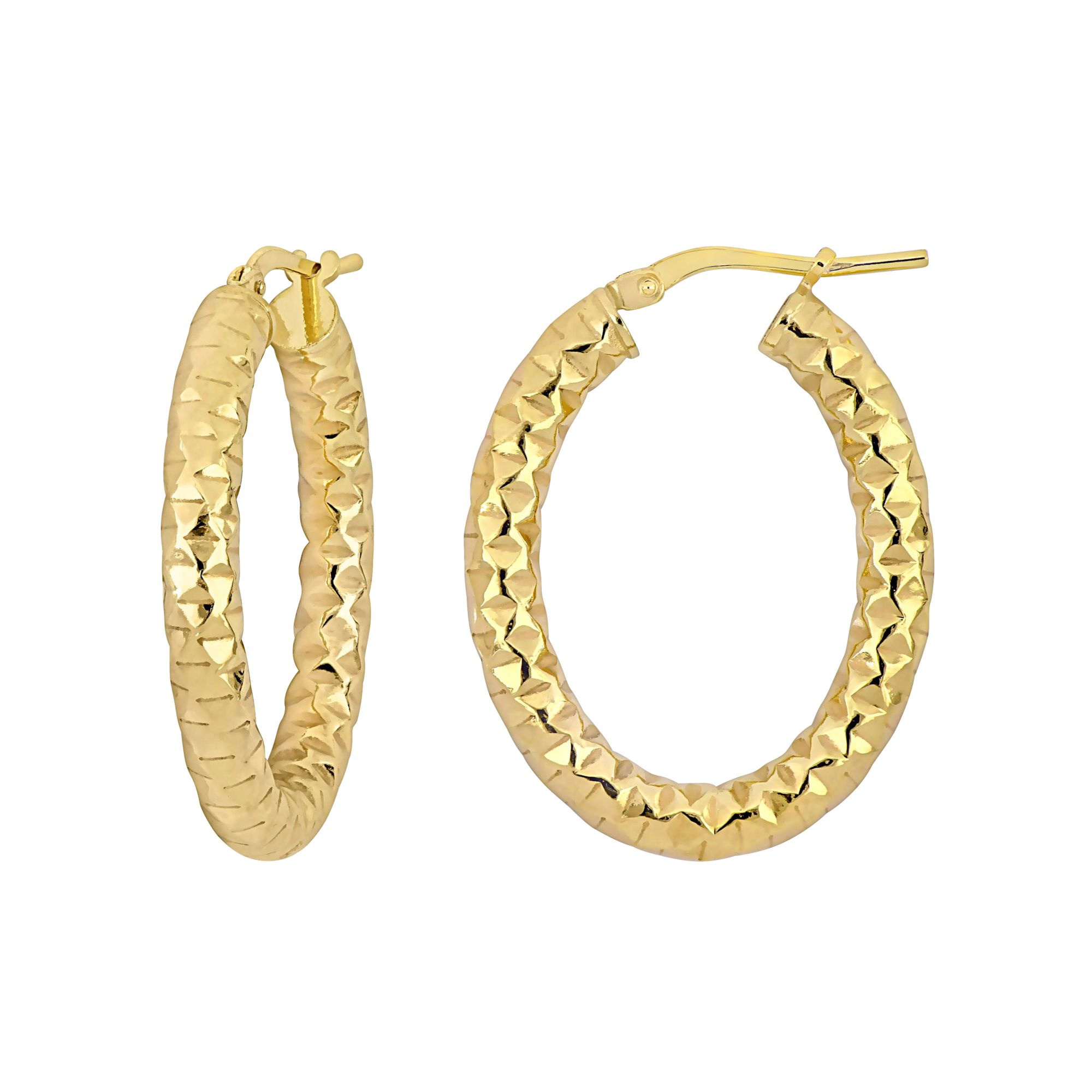These shimmering earrings are a wonder accessory. Crafted in lustrous yellow gold plated sterling silver, they feature a diamond-cut pattern on the hoops giving them a superb look. Polished to a brilliant shine, these exotic earrings secure with hinged-back closures and are a perfect addition to any jewelry collection. Step out with confidence with these lovely earrings.