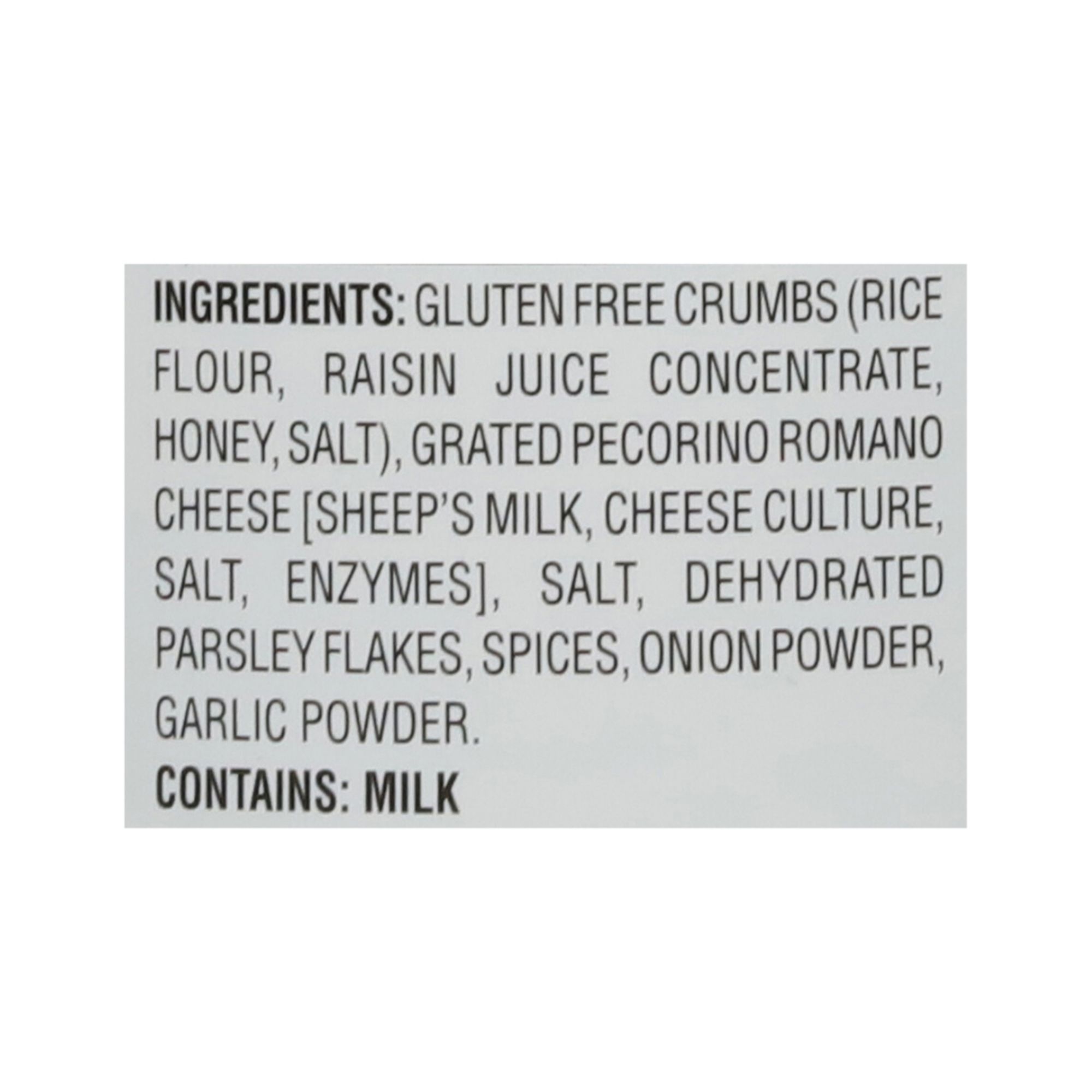 Ingredients: Gluten Free Crumbs (Rice Flour, Raisin Juice Concentrate, Honey, Salt, Grated Pecorino Romano Cheese [Pasteurized Sheep's Milk, Cheese Culture, Salt, Enzymes (Rennet)], Salt, Dehydrated Parsley Flakes, Spices, Onion Powder, Garlic Powder.