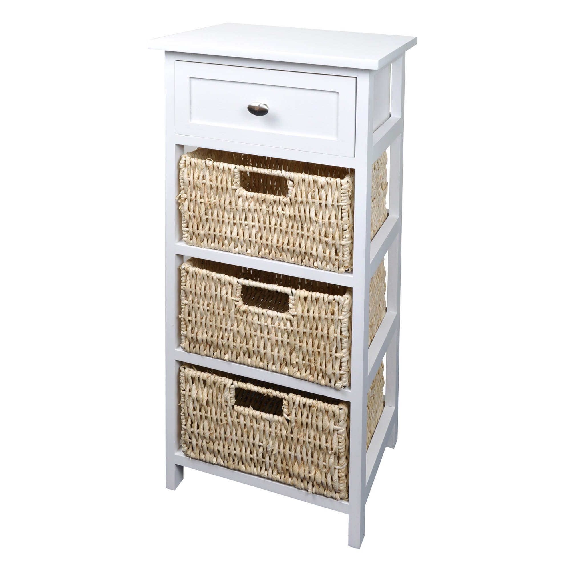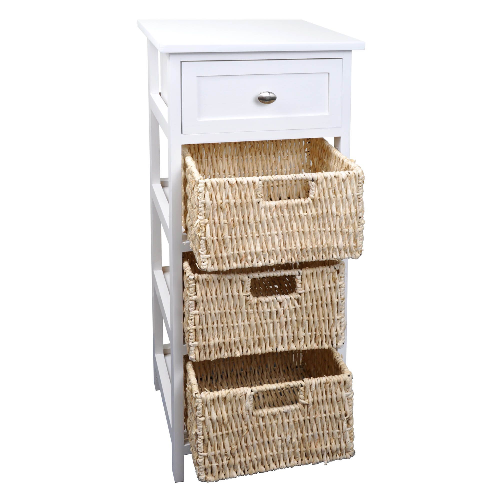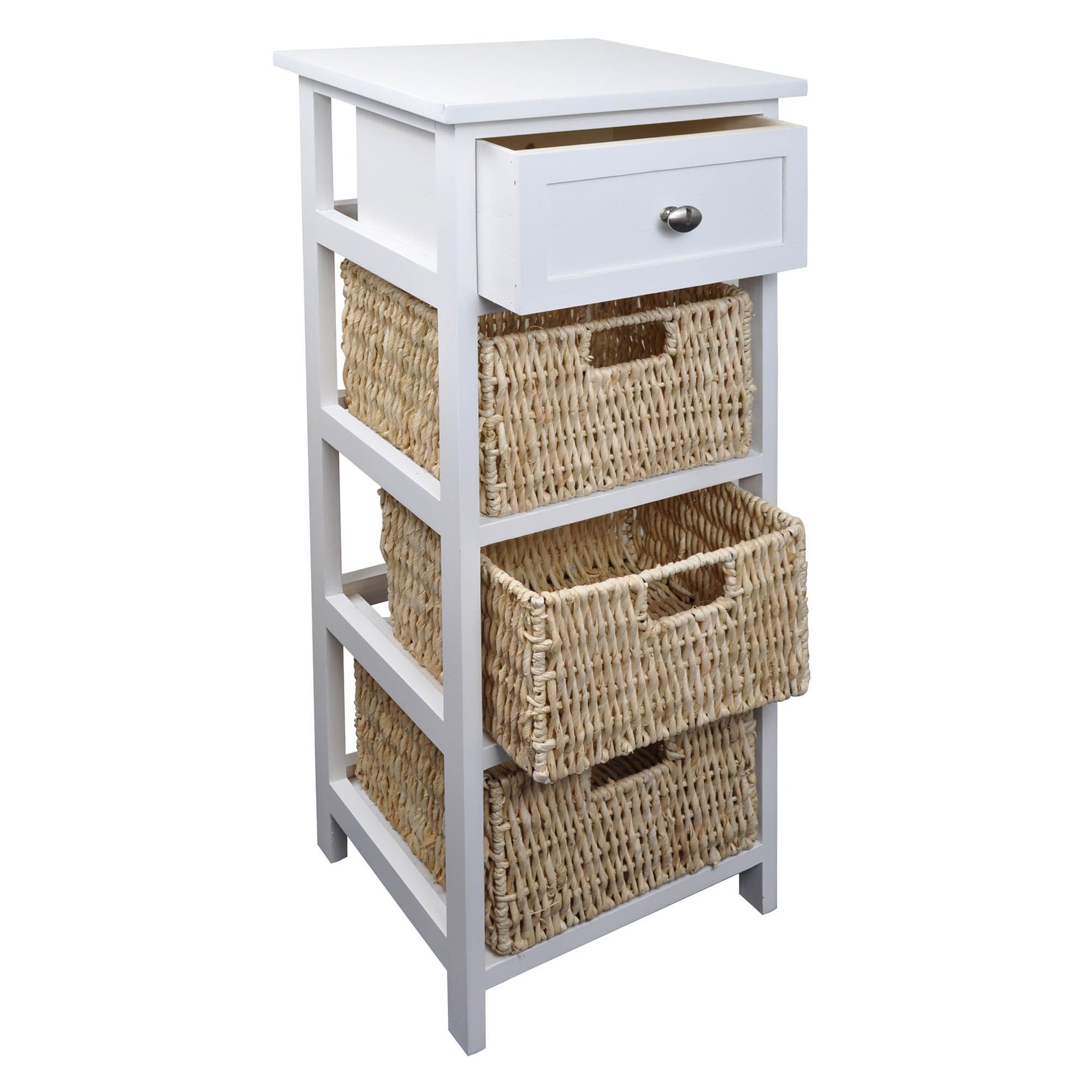 This 4-Tier Wood Storage Cabinet features adaptable storage thanks to its three basket drawers. The cabinet's square silhouette is finished in white, making it a stylish yet contemporary accent in any room. Its basket drawers are removable with built in handles, allowing you to accommodate space as needed.