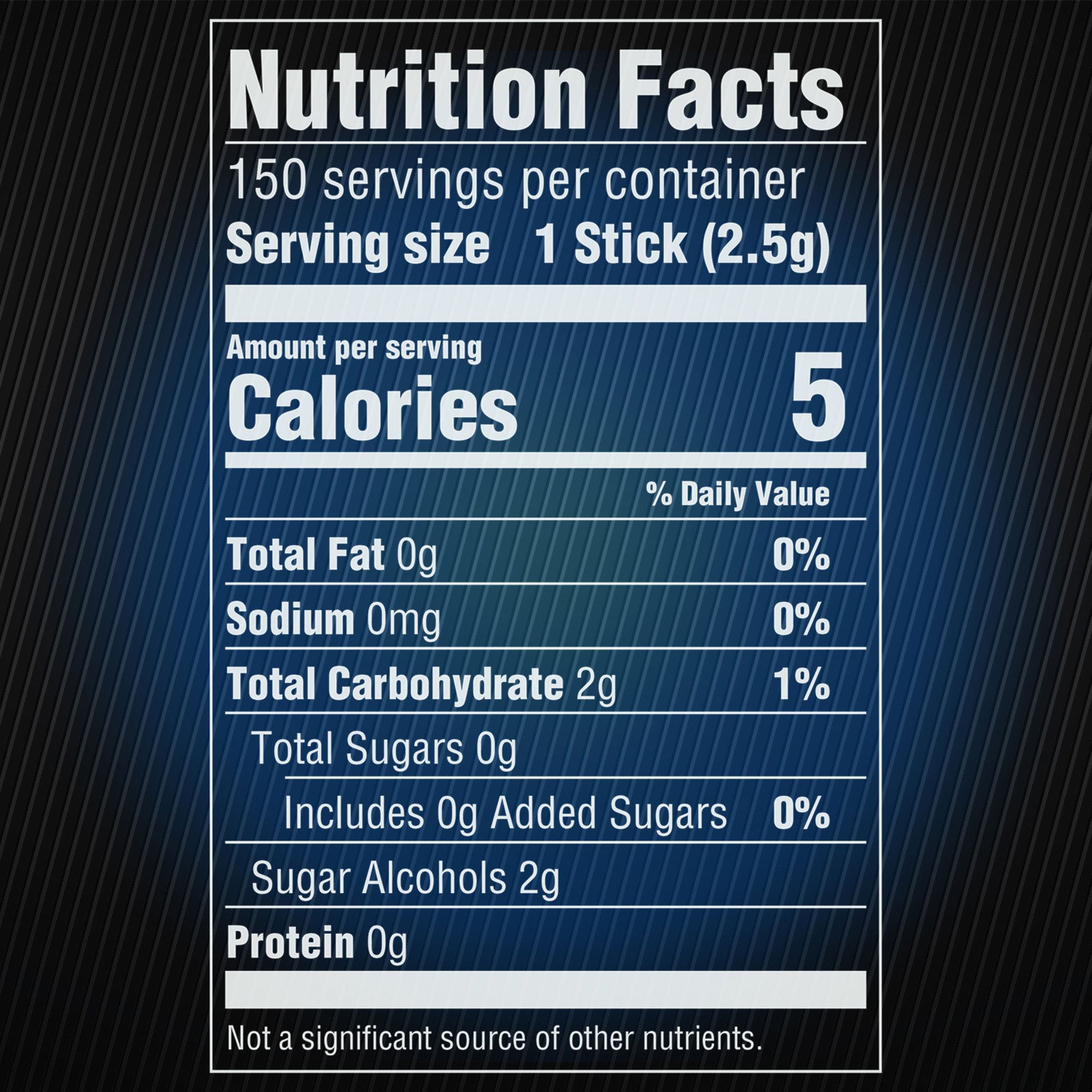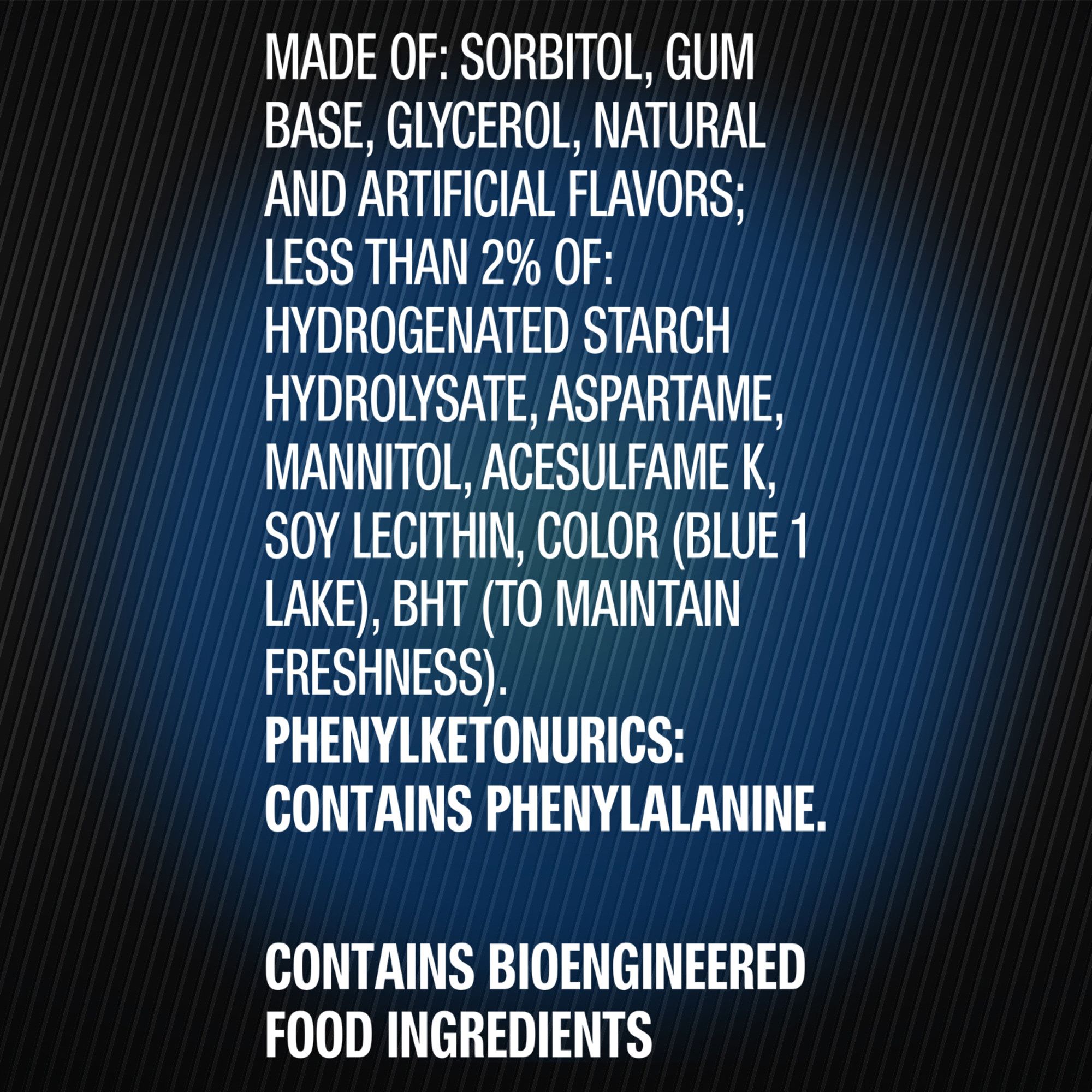 Ingredients: Sorbitol, Gum Base, Glycerol, Natural and Artificial Flavors; Less than 2% of: Hydrogenated Starch Hydrolysate, Aspartame, Mannitol, Acesulfame K, Soy Lecithin, Color (Blue 1 Lake), BHT (to Maintain Freshness).