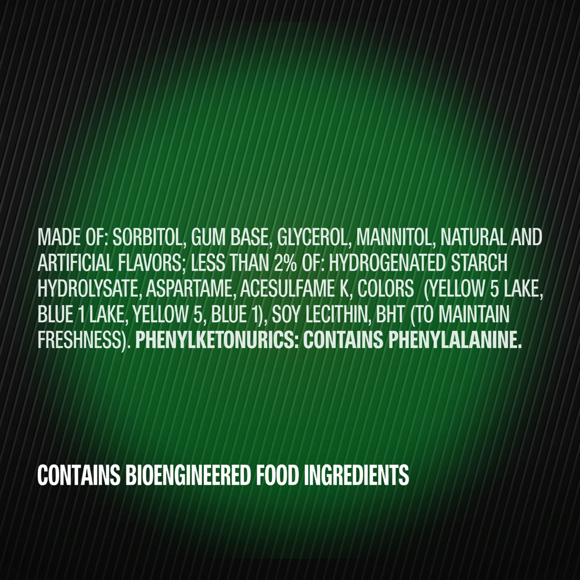 Ingredients: Sorbitol, Gum Base, Glycerol, Natural and Artificial Flavors; Less than 2% of: Hydrogenated Starch Hydrolysate, Aspartame, Mannitol, Acesulfame K, Soy Lecithin, Colors (Yellow 5 Lake, Blue 1 Lake), BHT (to Maintain Freshness).