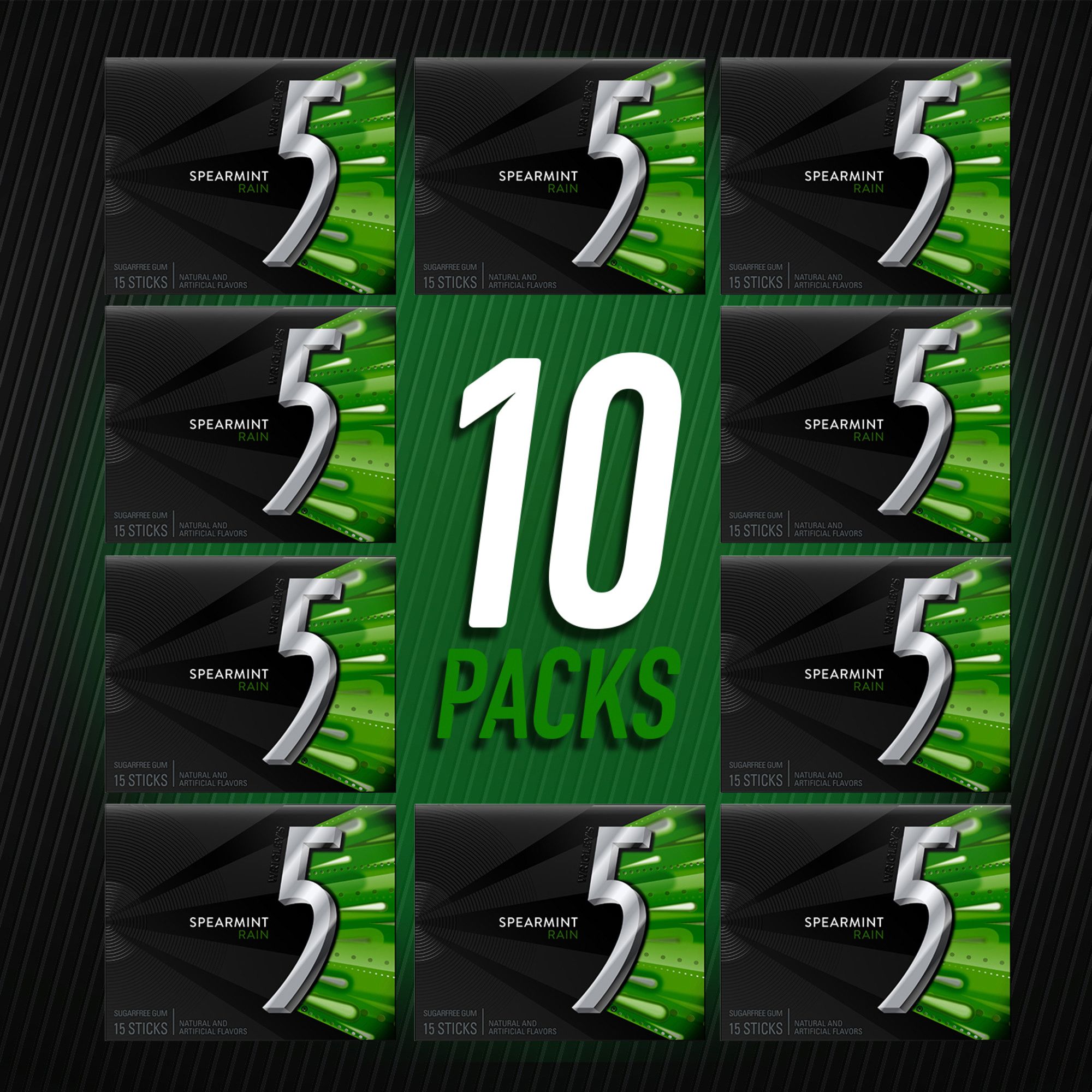 Contains ten (10) 15-stick packs of sugar free 5 Gum Spearmint Rain Chewing Gum