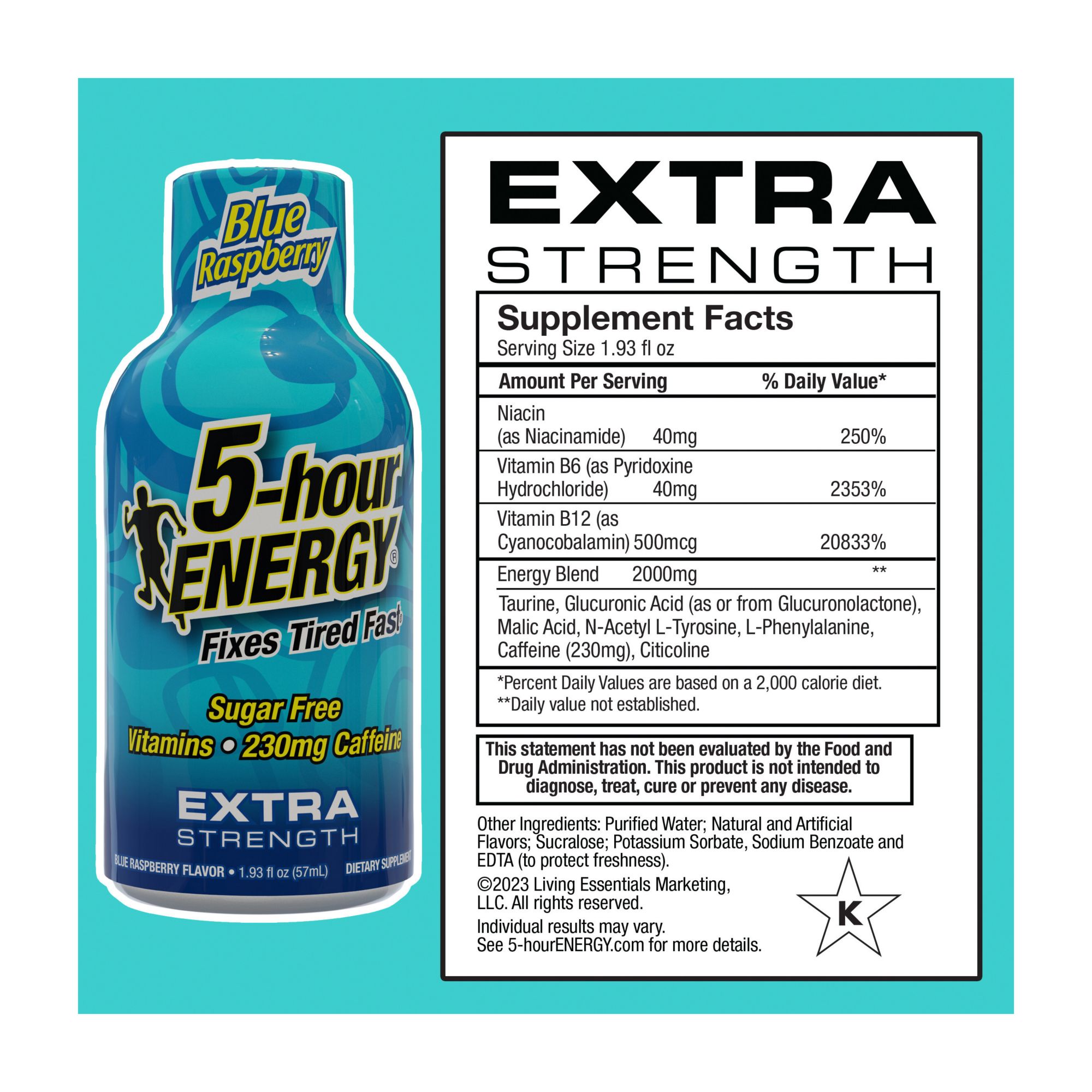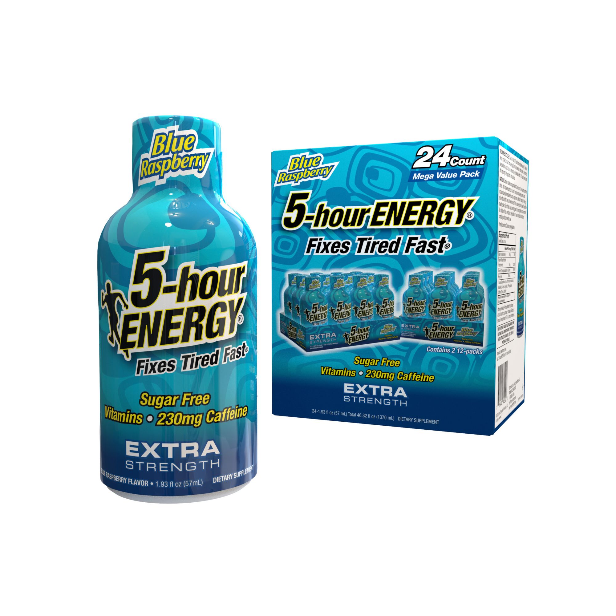 Includes extra strength energy shot multi-pack in blue raspberry flavor, 24 pk./1.93 oz.