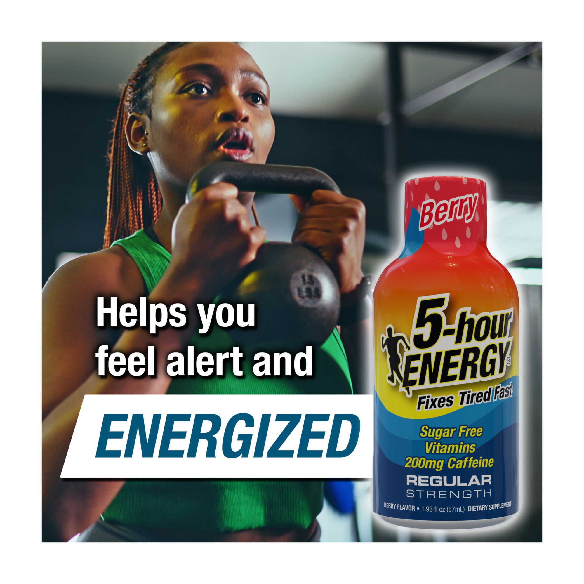 Includes regular strength energy shots multi-pack in berry flavor, 24 pk./1.93 oz.