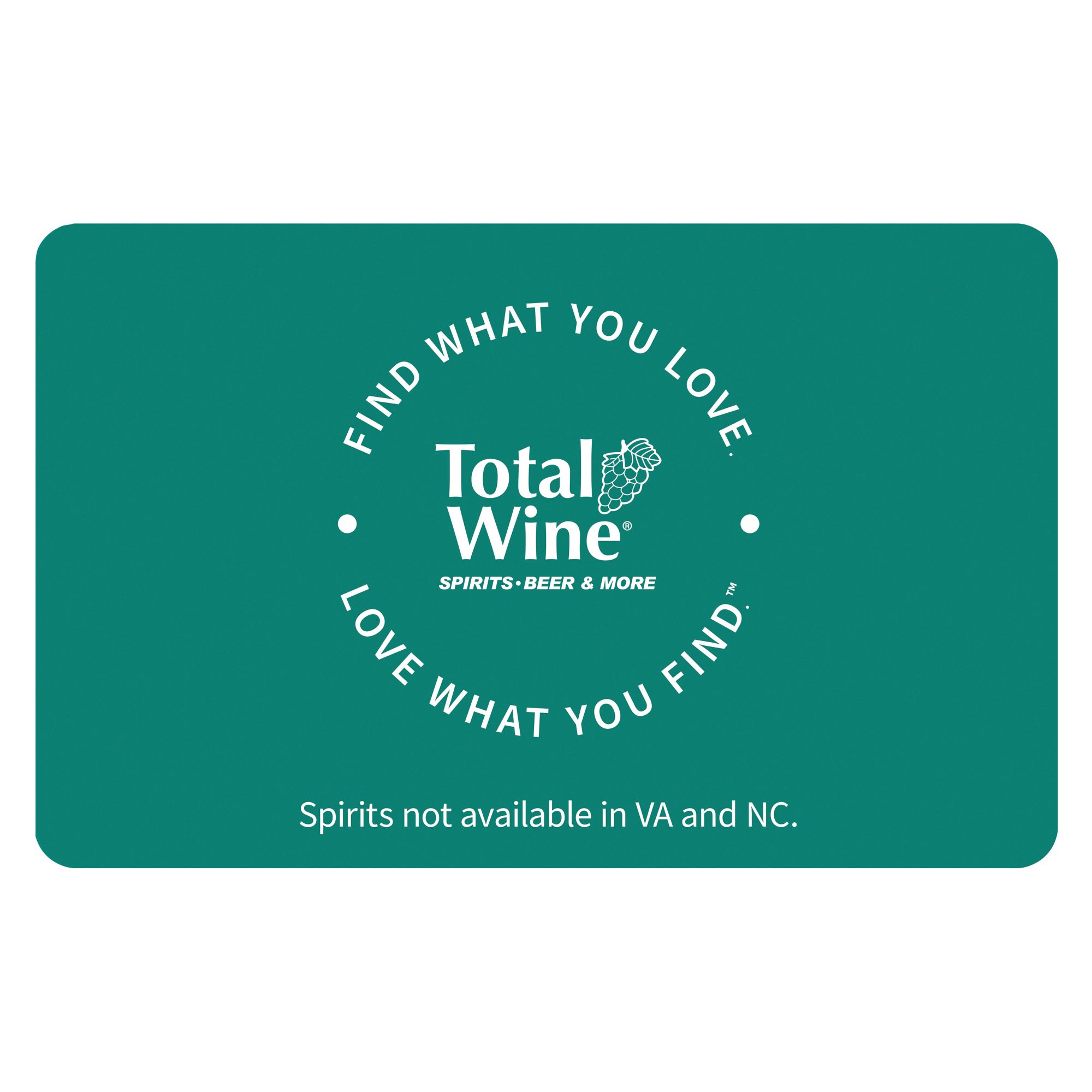 Disclaimers: Purchase, use or acceptance of this Gift Card constitutes acceptance of these terms and conditions. Gift Card is redeemable up to balance only to purchase goods or se rvices at participating Total Wine & More in -store and online locations in the United States . Gift Cards are not redeemable in Kansas or New York. Not a debit or credit card and no warranties apply. Not refundable or redeemable for cash except as required by law. Not reloadable. Does not expire and no fees apply. Safeguard this Gift Card, as it will not be replaced if lost, stolen, damaged or used without authorization. Gift Card is issued by and represents an obligation solely of Retail Services & Systems, Gift Card cannot be resold and is not valid and will not be honored, and Retail Services & Systems, Inc. will not be liable, if obtained from unauthorized sellers or resellers, including through Internet auction sites. For balance inquiries and for complete Gift Card terms and conditions (including arbitration agreement and class action waiver), which are subject to change, please visit Totalwine.com/gift-cards. Must be 21 or older to redeem gift cards with valid ID. Spirits available in select stores. To check your balance, call toll free 1-888-527-4590. Gift cards are redeemable in store and online.