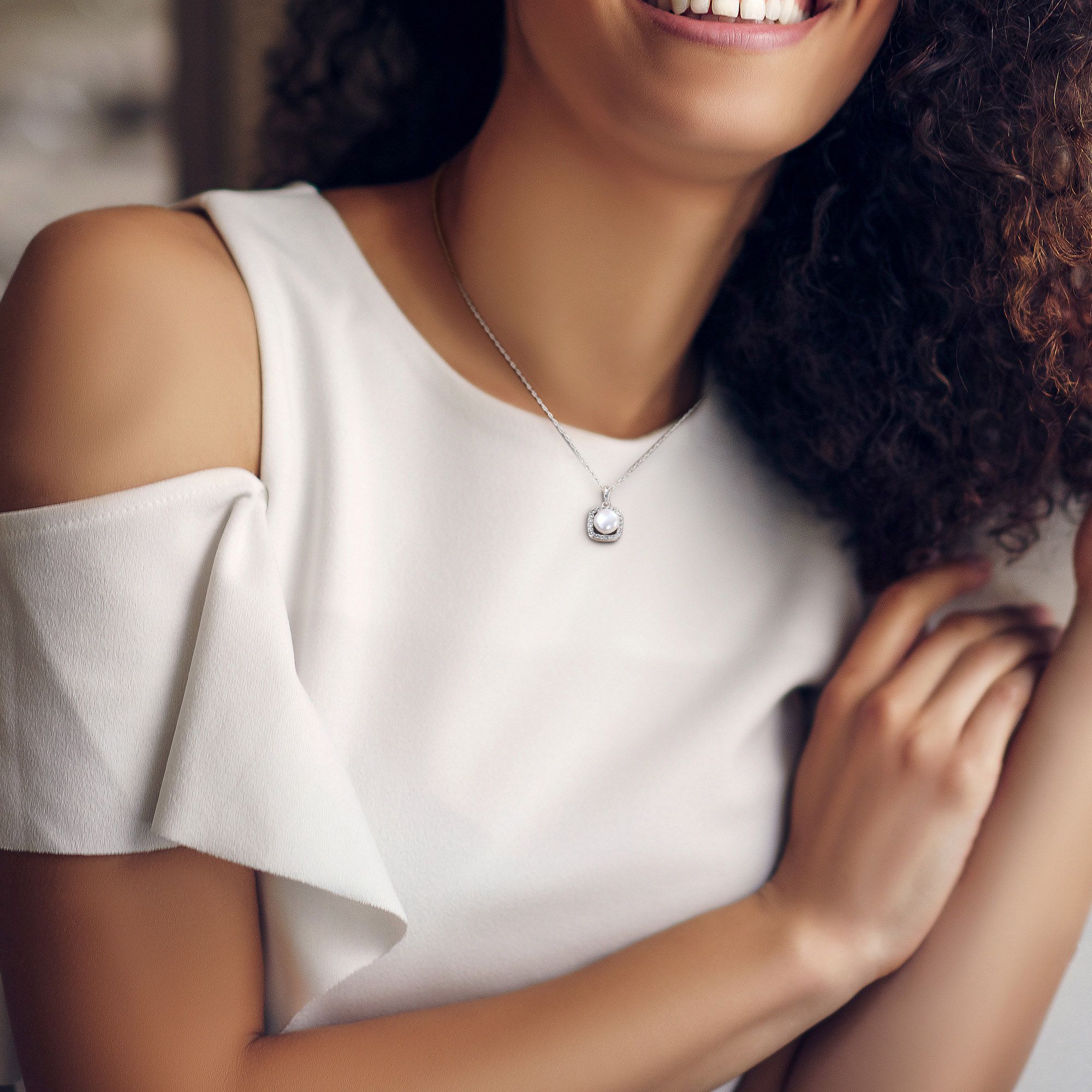 This alluring square halo necklace is crafted in 10k white gold. This pendant features a button-shaped, freshwater cultured pearl and round-shaped, created white sapphire gemstone in a shared-prong setting. Enhanced with a high polished finish, this pendant is hung on a rope chain and secured with a spring ring clasp.