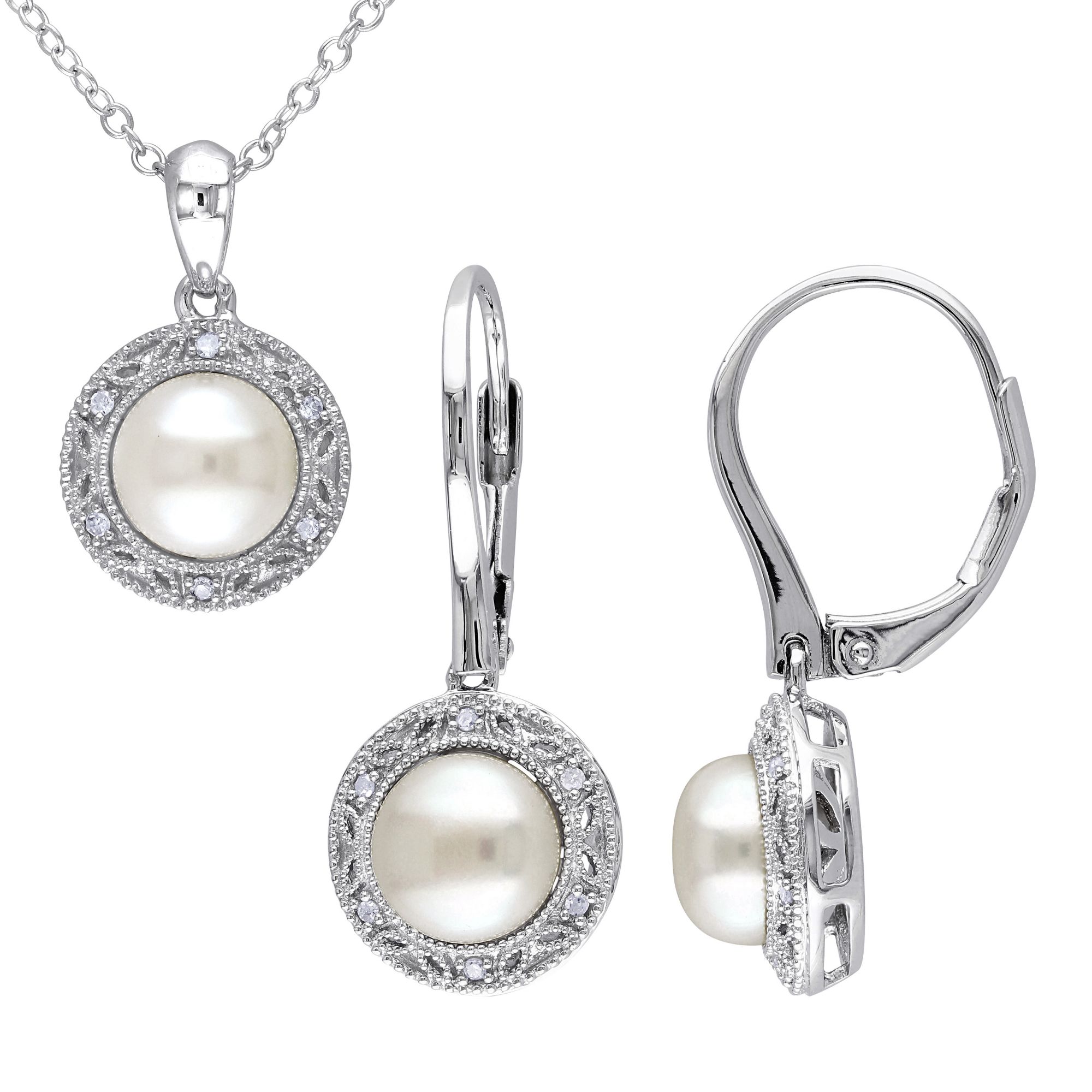 7.5-8mm Cultured Freshwater Pearl and .1 ct. t.w. Diamond Halo Earrings and Necklace 2 pc. Set in Sterling Silver
