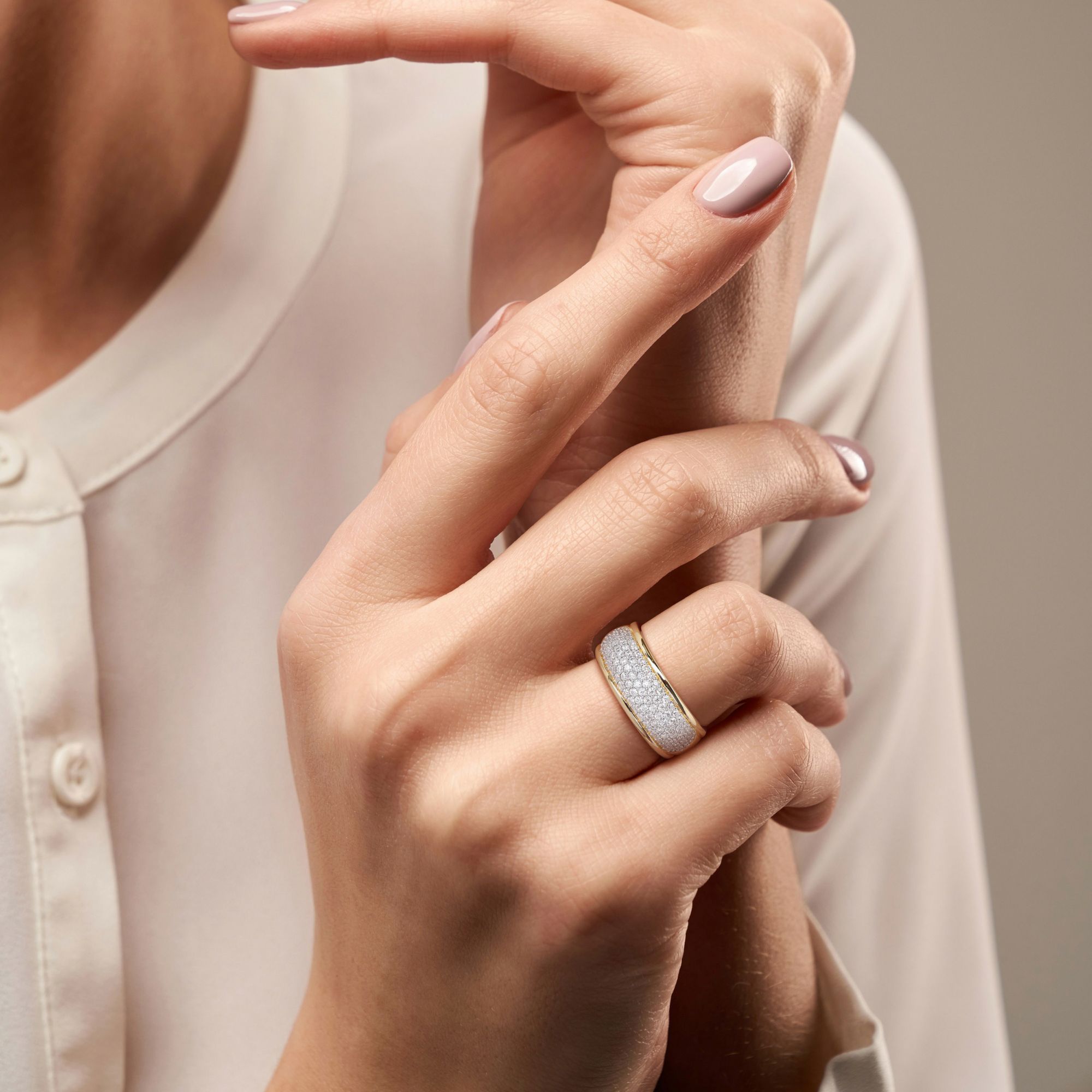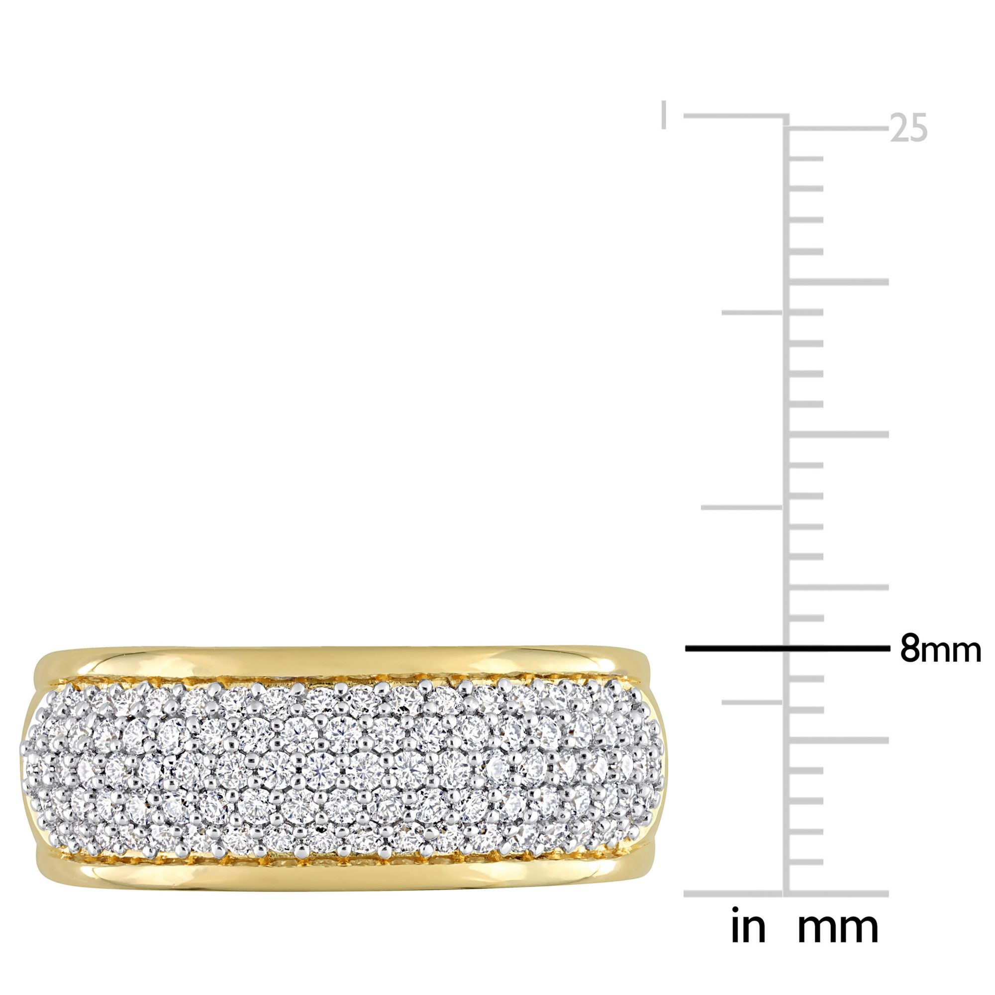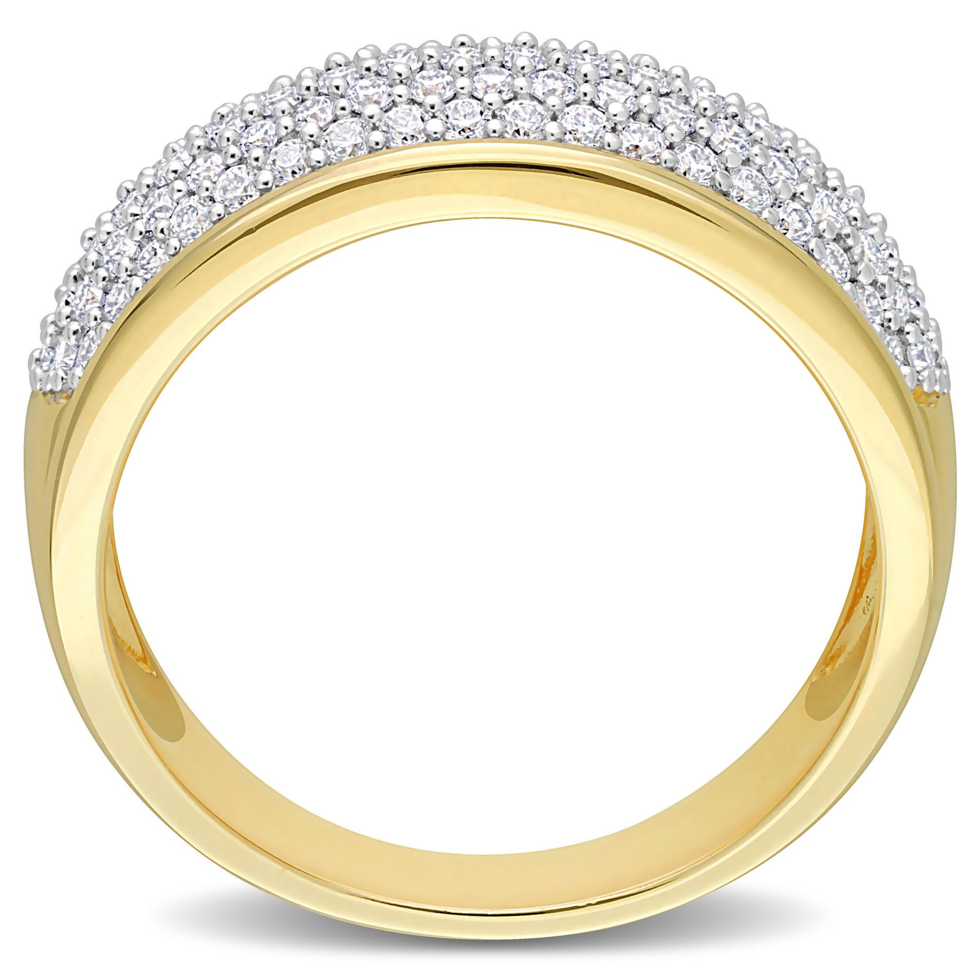 Give yourself a glamorous look with this Moissanite Semi-Eternity Ring. Crafted in yellow gold flash plated sterling silver, this band features round-cut, pave-set white created moissanite gemstones covering the band. Enhanced with polished finish, this gorgeous semi-eternity band is the perfect gift for your loved one. Watch her go teary eyed as you gift her this ring.
