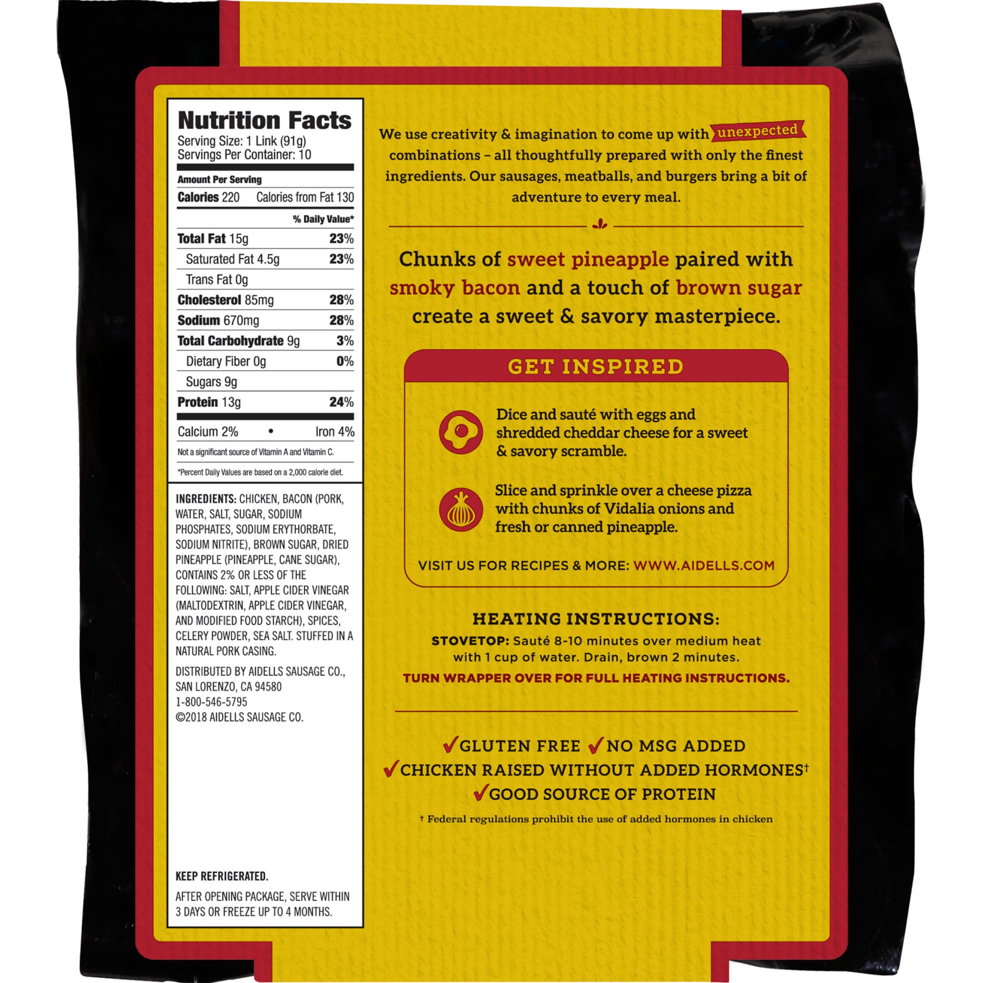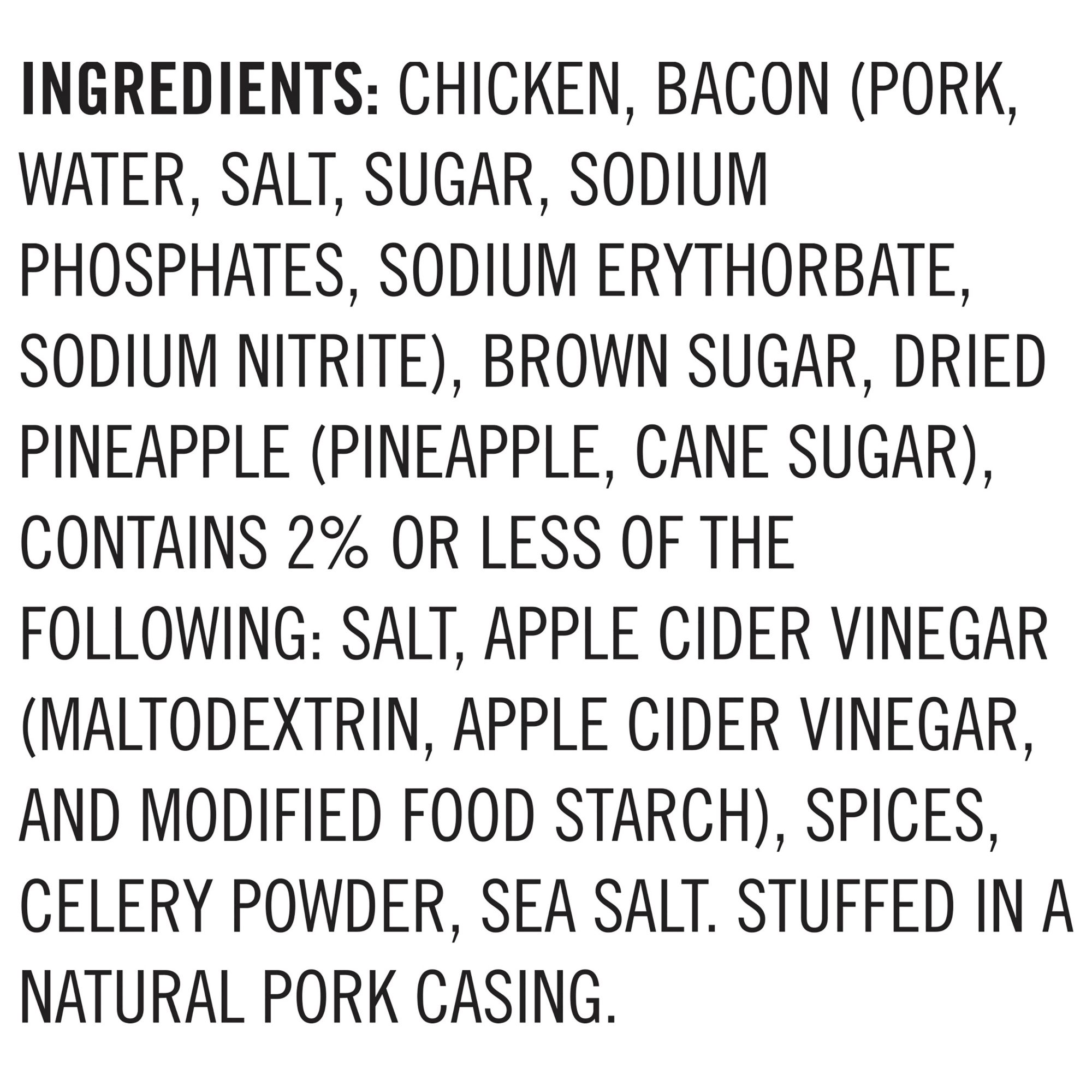 Made with real pineapple, naturally smoked bacon and a touch of brown sugar Hand-stuffed in natural casings and slow smoked over real hardwood chips All natural, minimally processed chicken with no artificial ingredients No fillers or binders Gluten-free Product of USA Includes 10 fully cooked links