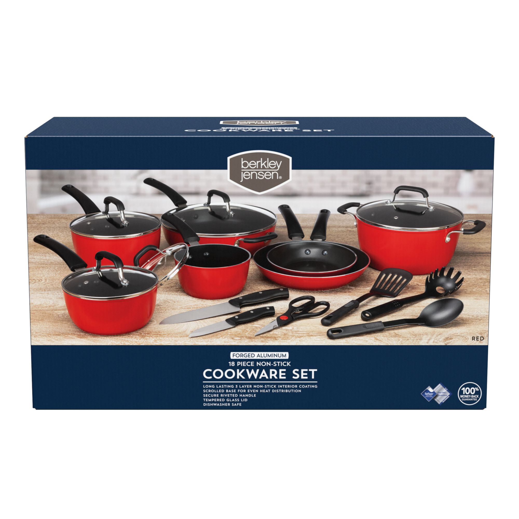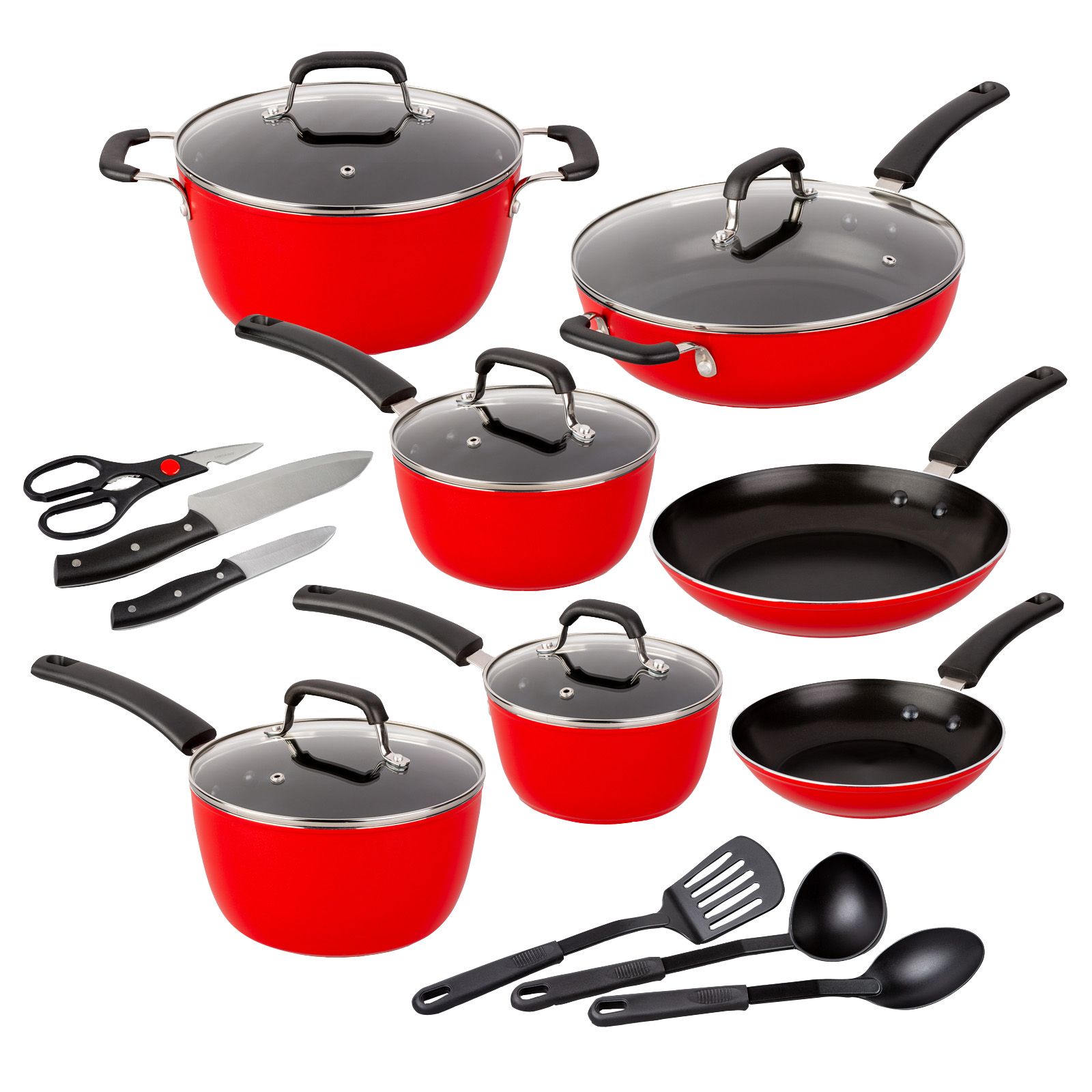 Includes 20cm frypan, 26cm frypan, 1.5qt saucepan, 2qt saucepan, 3qt saucepan, 5qt Dutch oven, 28 x 7.5cm saute pan with glass lid, 3pcs tools, 2pcs knives, 1pc kitchen scissor