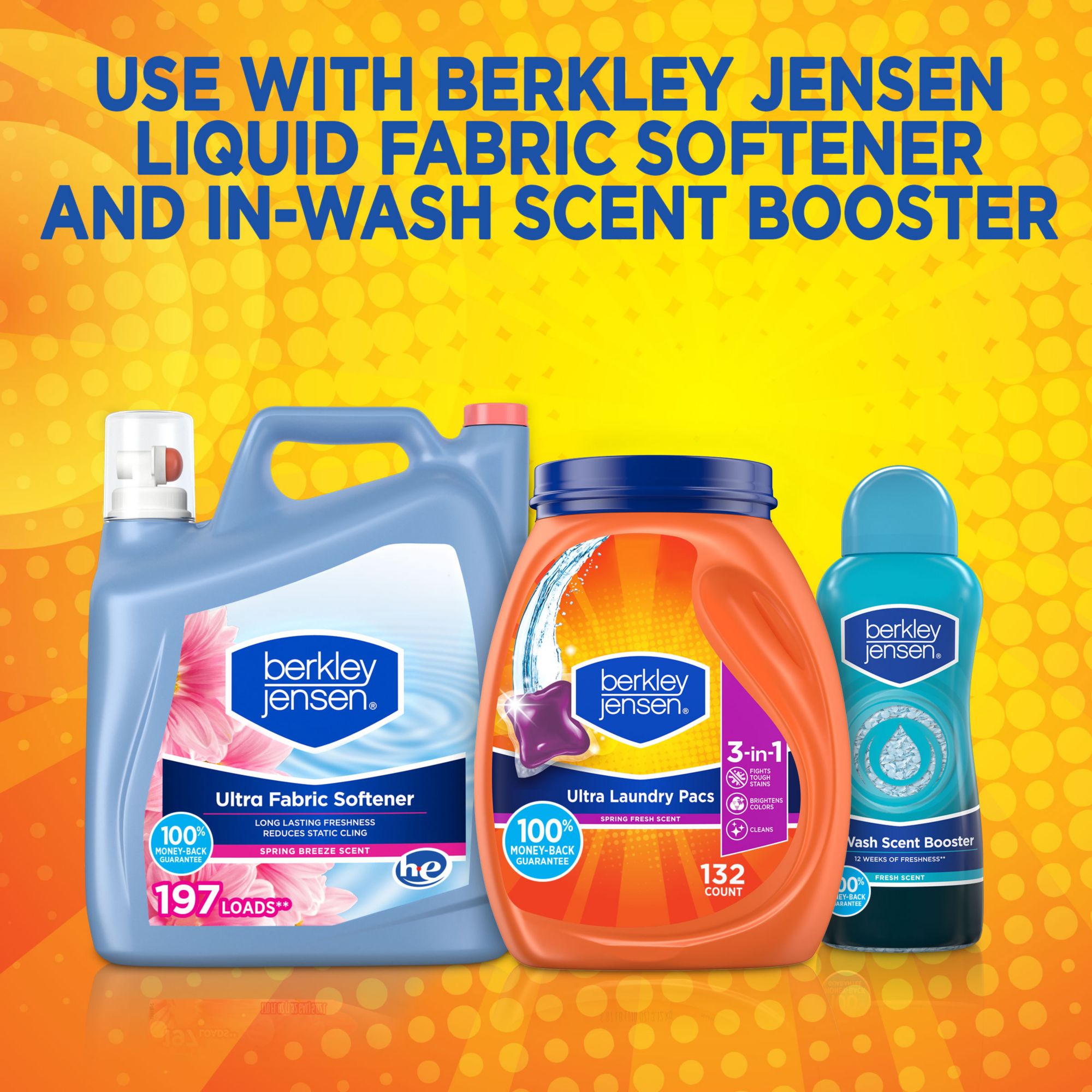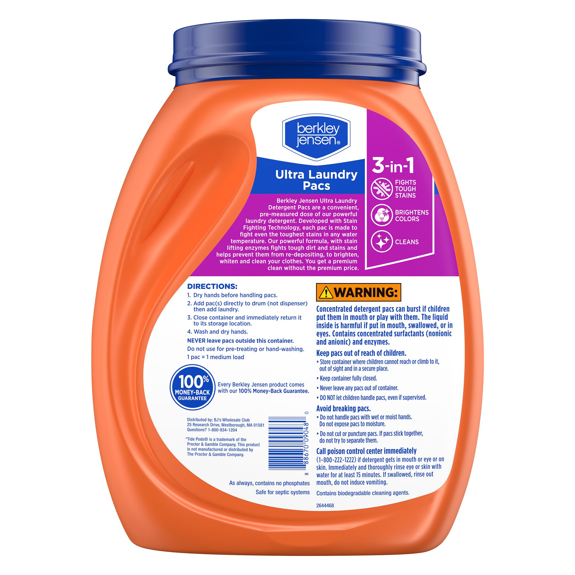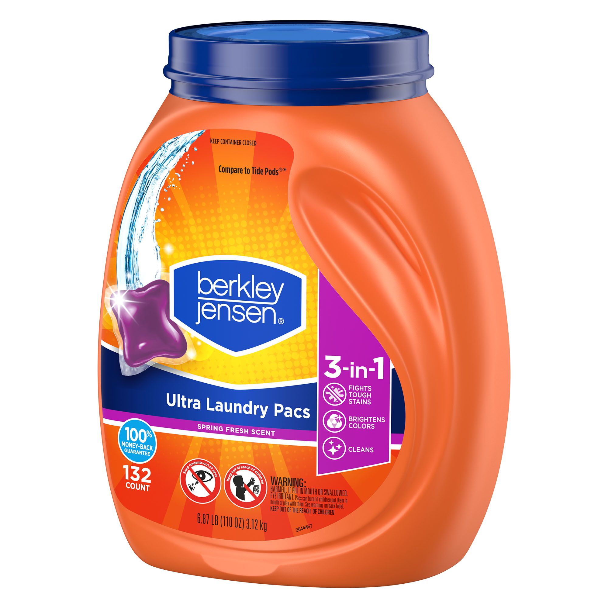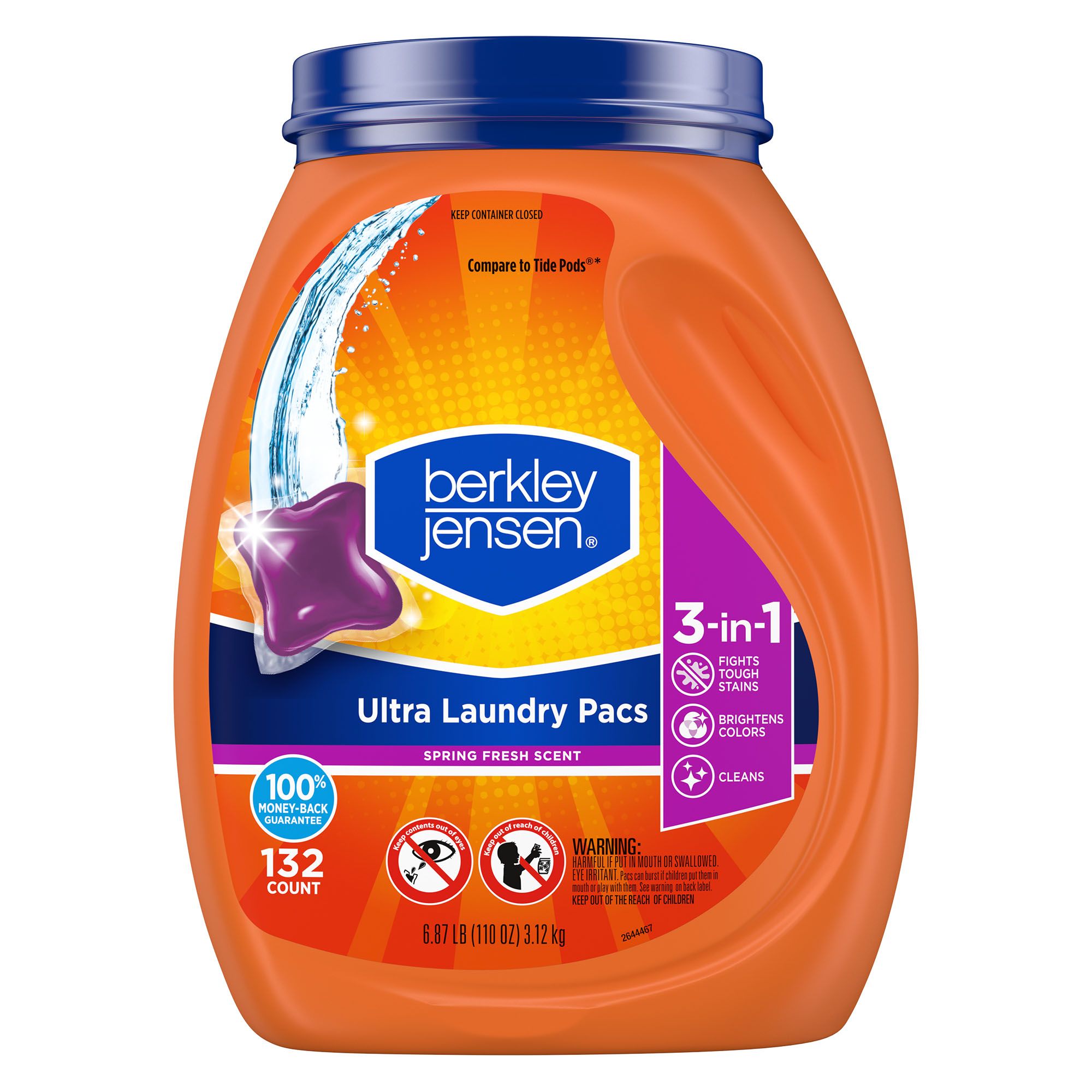 Berkley Jensen 3-in-1 Ultra Laundry Detergent Pacs are a convenient, pre-measured dose of powerful laundry detergent. Developed with Stain Fighting Technology, wash pac is made to fight even the toughest stains in any water temperature. Berkley Jensen's powerful formula, with stain lifting enzymes fights tough dirt and stains and helps prevent them from re-depositing, to brighten, whiten and clean your clothes. You get a premium clean without the premium price.