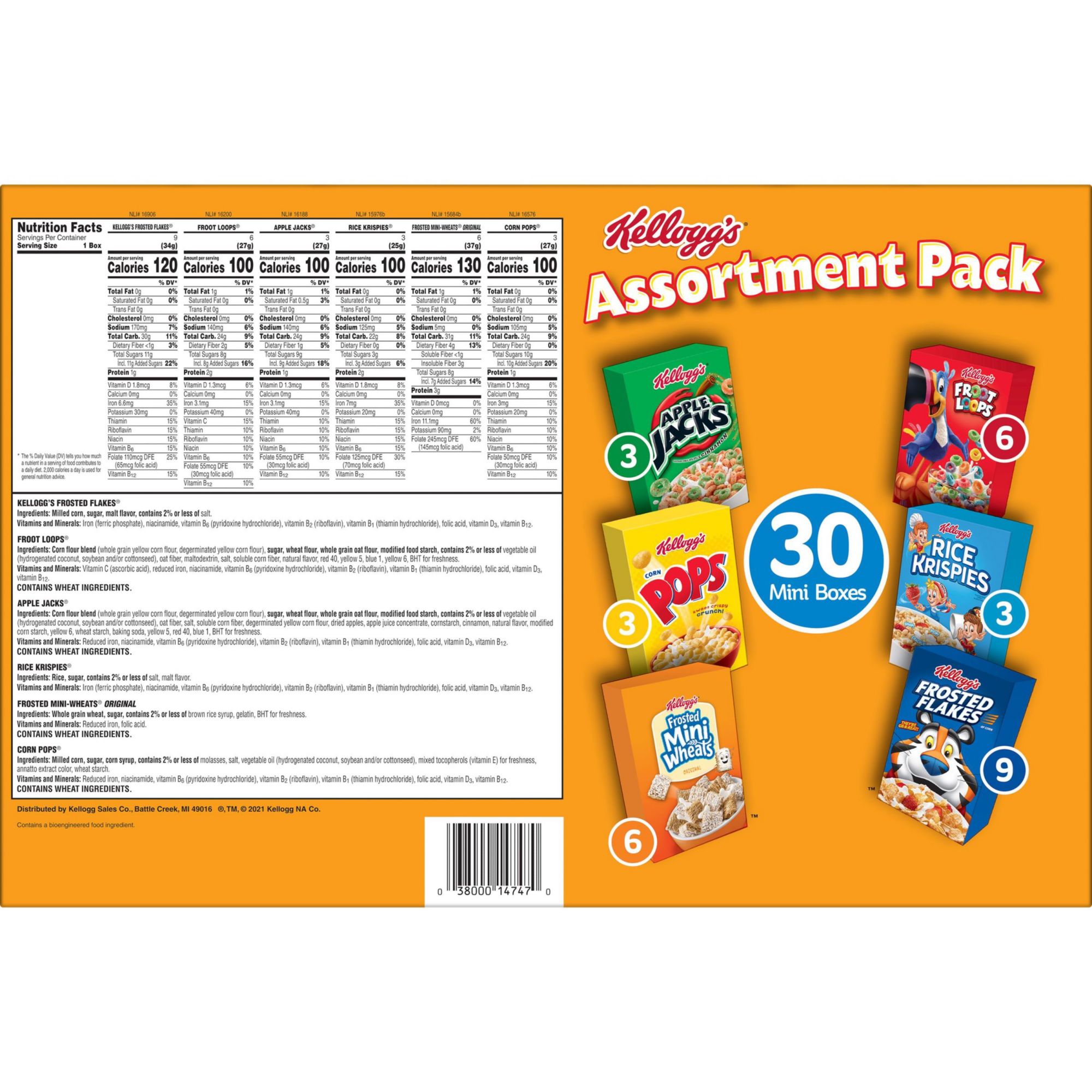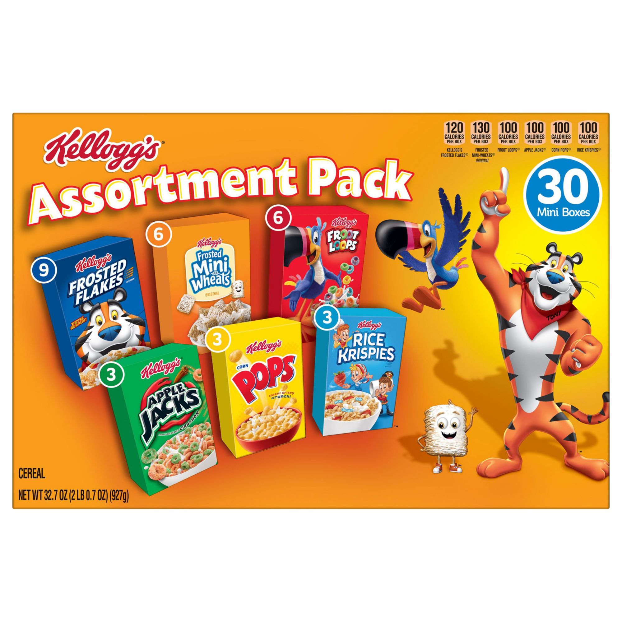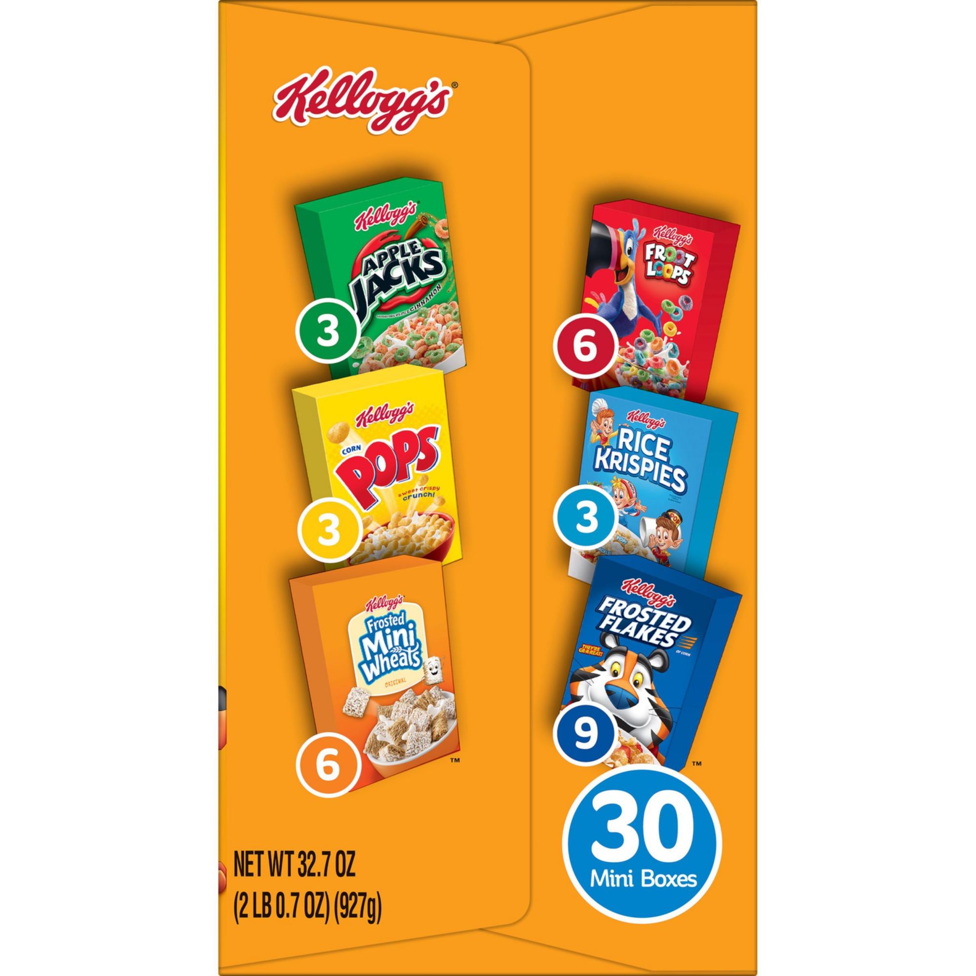 A breakfast cereal assortment containing Kellogg's favorites like Frosted Flakes, Frosted Mini-Wheats, Froot Loops, Apple Jacks, Corn Pops, and Rice Krispies Six family-favorite cereals that are perfect for kids and adults Made with whole grains Good source of fiber Includes 6 boxes of Apple Jacks, 4 boxes of Corn Pops, 3 boxes of Mini Wheats, 3 boxes of Rice Krispies, 6 boxes of Froot Loops and 8 boxes of Frosted Flakes