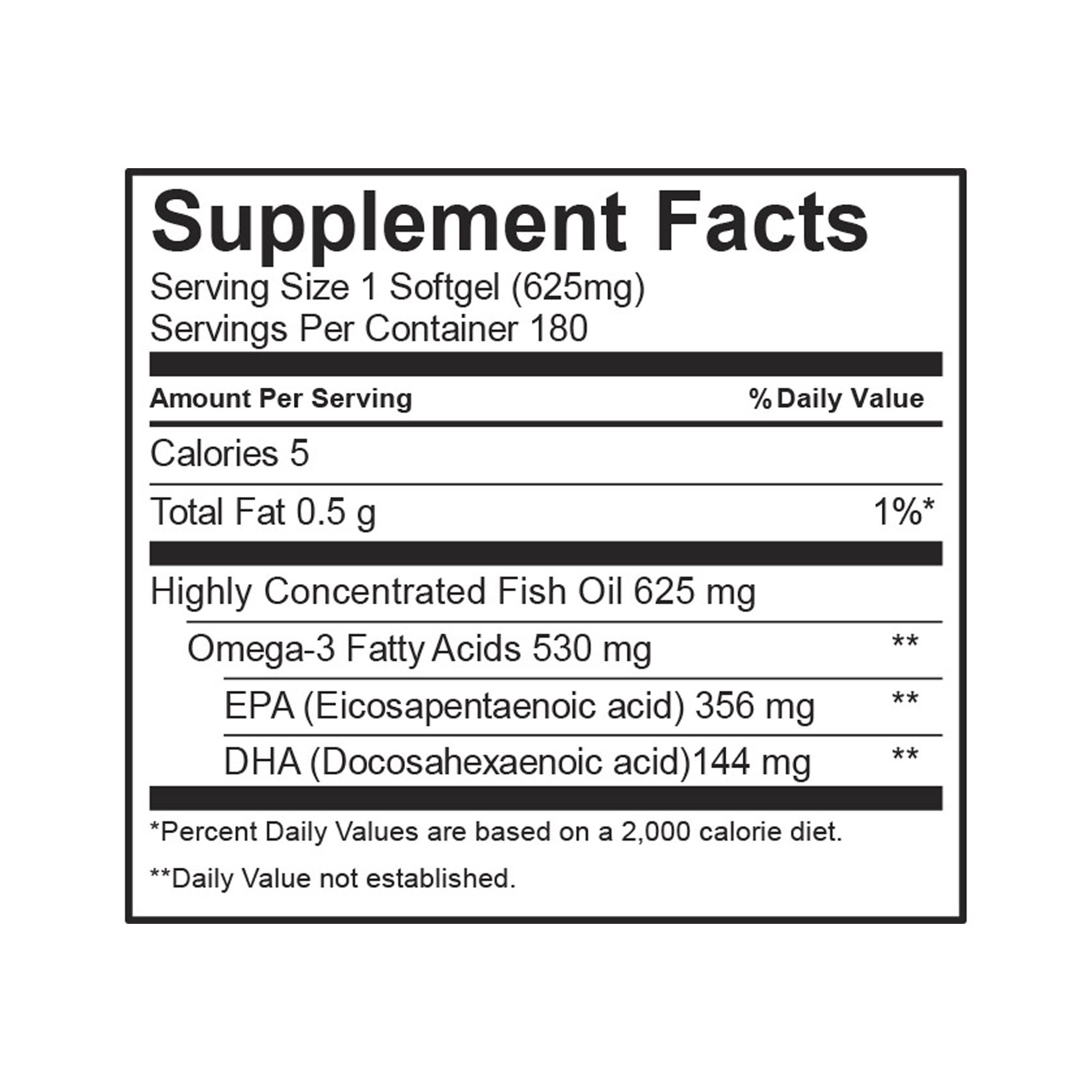 Our molecularly distilled fish oil offers an 85% Omega-3 concentration, with 80% being EPA and DHA. Each mini-softgel is filled with 625 mg of fish oil - 356 mg is EPA and 144 mg is DHA. That means you get 100% of what Mayo Clinic has stated is the combined target consumption level for EPA and DHA - 500 mg - in just one softgel.