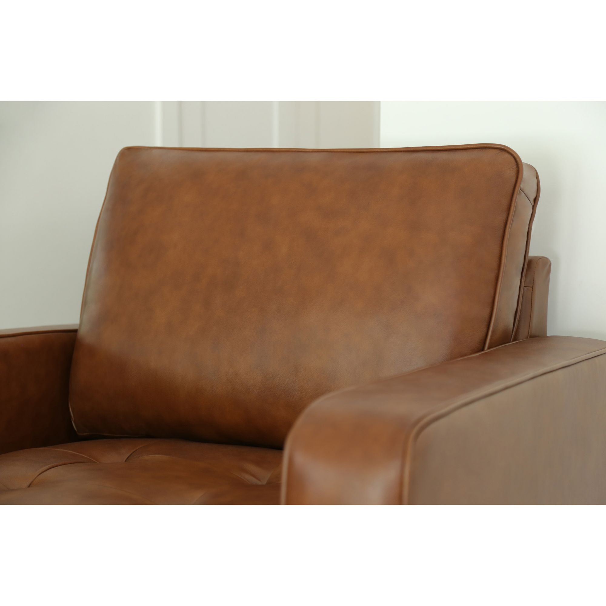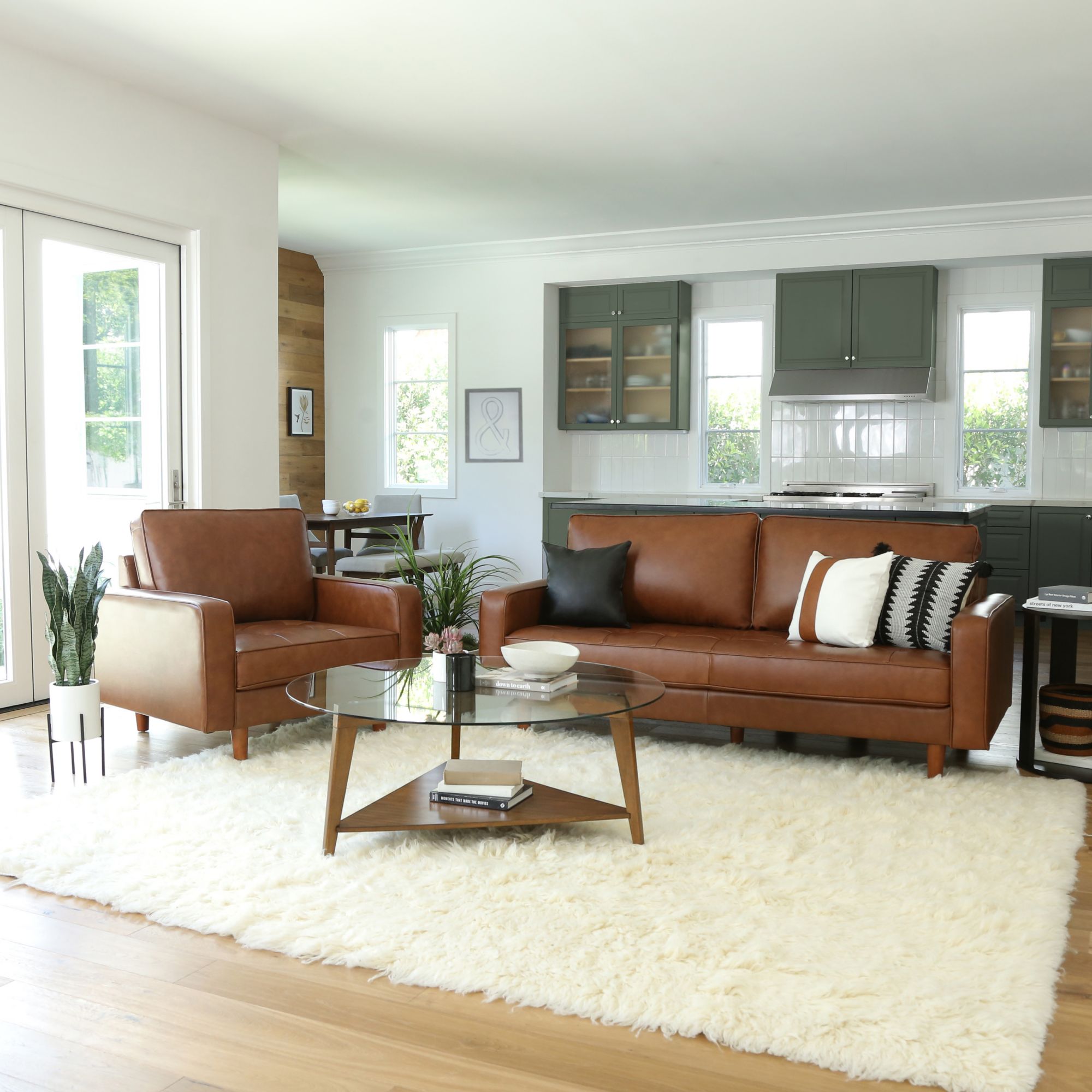 Capture modern mid-century style with Abbyson’s Haverly Leather Sofa and Armchair 2-piece Set. The Haverly features a rich camel 100% Top Grain Leather on all seating areas with high-quality leather match on side panels and back. With high-density button tufted foam seats, detachable back cushions and a solid wood frame you’ll be sure to have support, comfort and style for many years to come.