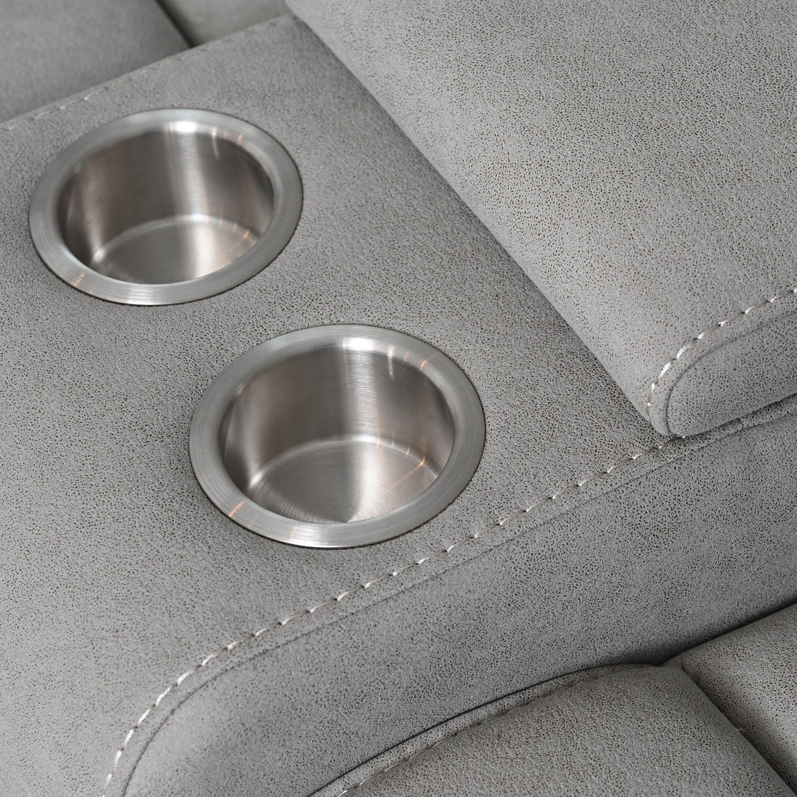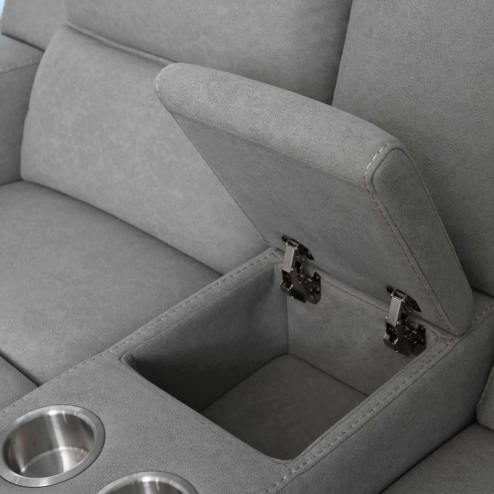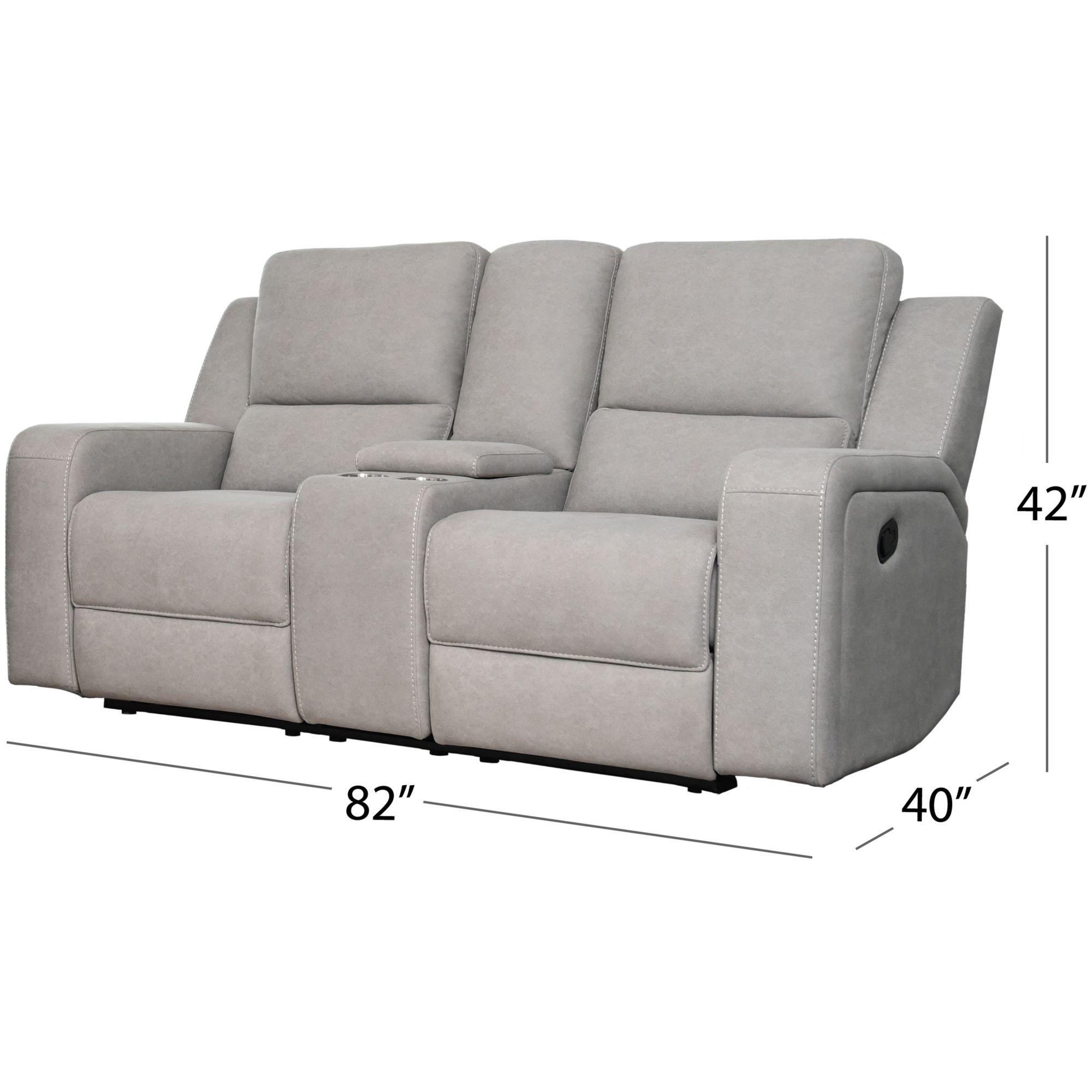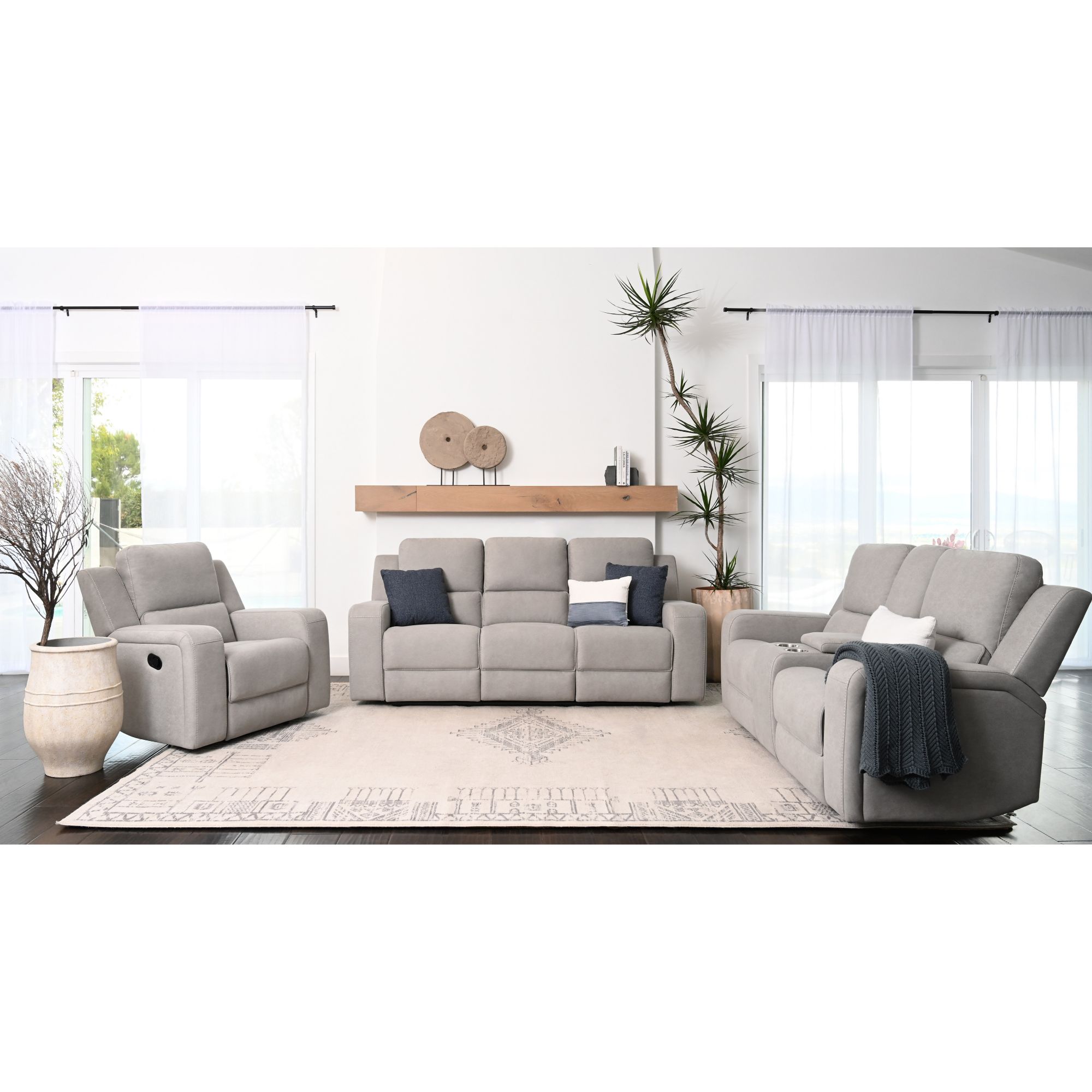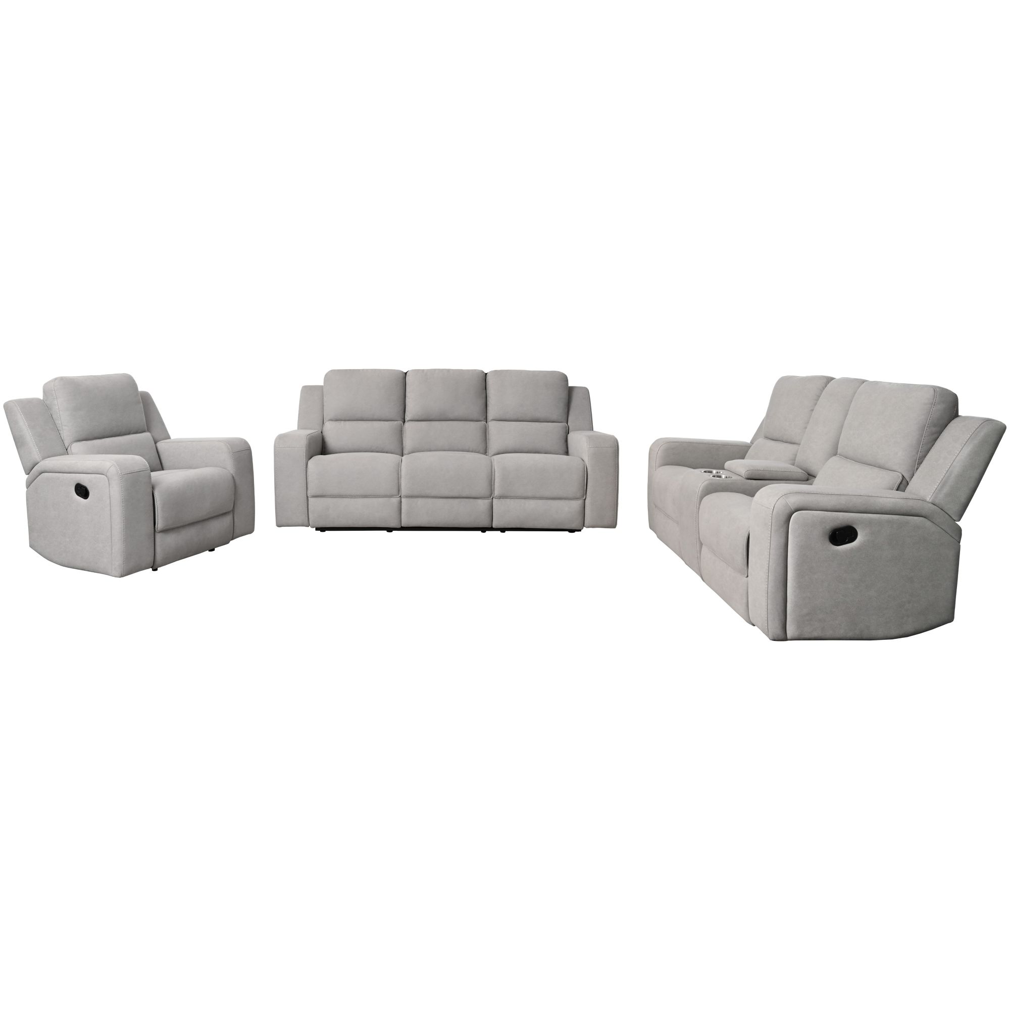 Fully upholstered in 100% polyester fabric Solid hardwood frame for everlasting support Minimal knock-assembly required Hidden drop-down console on sofa Manual reclining mechanism Includes one sofa, one loveseat and one recliner