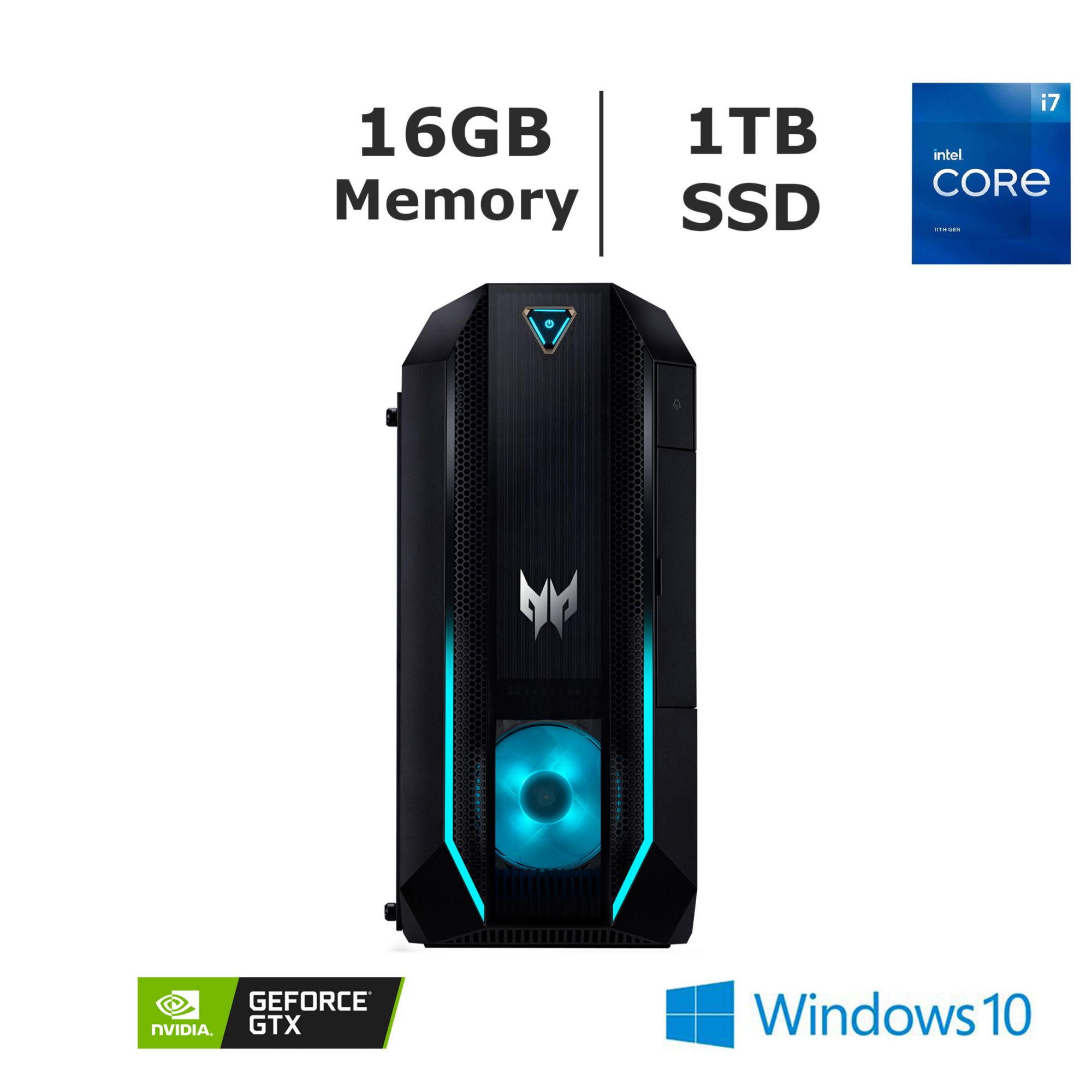 Operating System: Windows 10 Home Processor: 11th Generation Intel Core i7-11700F 8-Core processor (up to 4.9GHz) Hard Drive: 1TB NVMe M.2 SSD and 1TB 7200RPM SATA hard drive Memory: 16GB DDR4 2666MHz memory Graphics: NVIDIA GeForce RTX 3070 graphics with 8GB of GDDR6 video memory DTS X: Ultra Audio, USB 3.2 (Type C) Gen 2 port (Up to 10Gbps) (Front) and USB 3.2 Gen 2 port (Front) USB 3.2 (Type C) Gen 2x2 port (Up to 20Gbps) (rear) USB 3.2 Gen 1 Type-A ports (Rear), USB 2.0 Type-A ports (rear) Display ports and HDMI port Intel wireless Wi-Fi 6 AX201 802.11ax Dual-Band 2.4GHz and 5GHz featuring 2x2 MU-MIMO technology (max speed up to 2.4Gbps) Killer Ethernet E2600 10/100/1000 Gigabit Ethernet LAN Bluetooth 5.2 Predator RGB gaming keyboard and Predator RGB gaming mouse Includes desktop, Predator RGB gaming keyboard and Predator RGB gaming mouse, see through EMI-compliant tempered glass panel, and power cord Warranty: 1 year