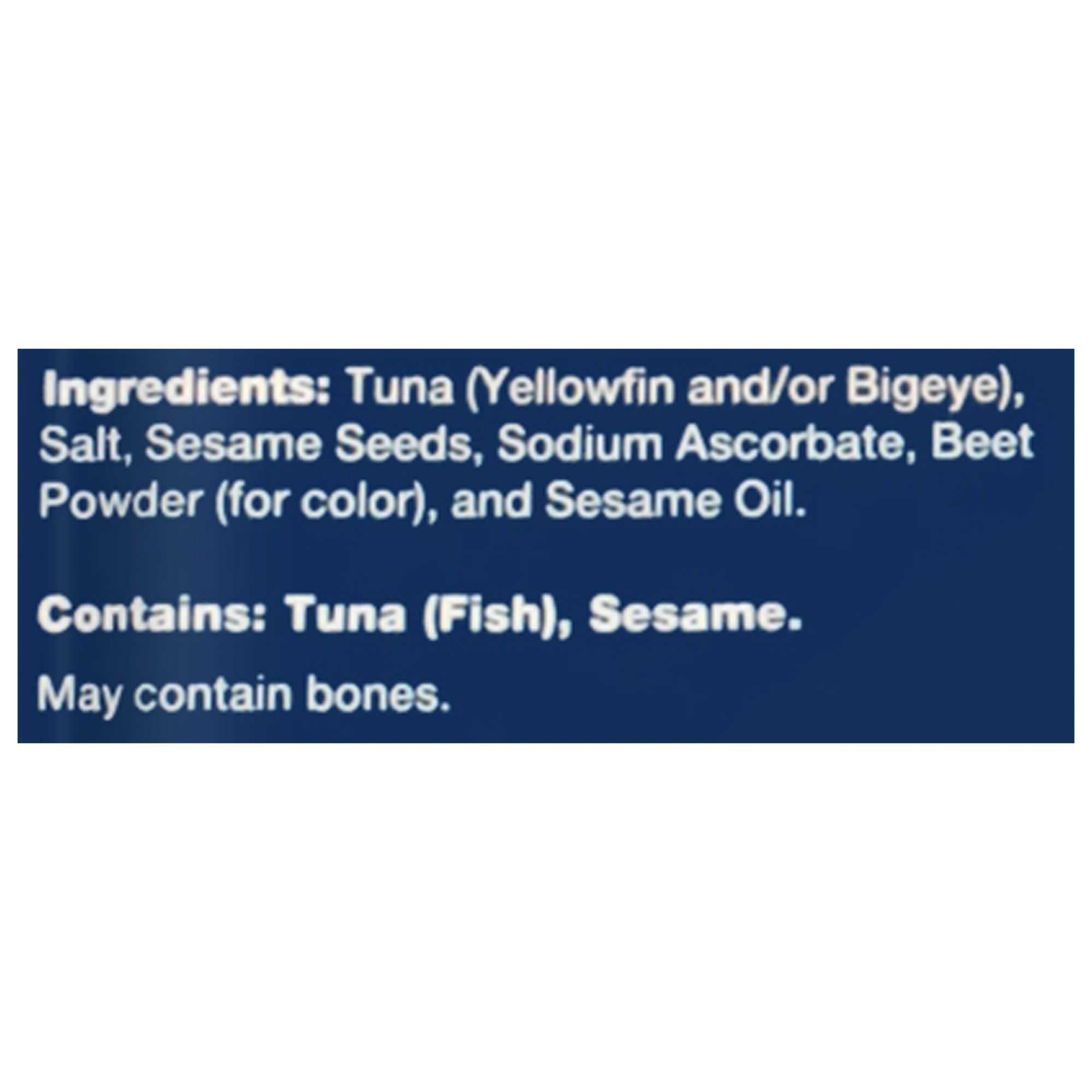 Ingredients: Tuna (Yellowfin and/or Bigeye), Salt, Sesame Seeds, Sodium Ascorbate, Beet Powder (for Color), and Sesame Oil.