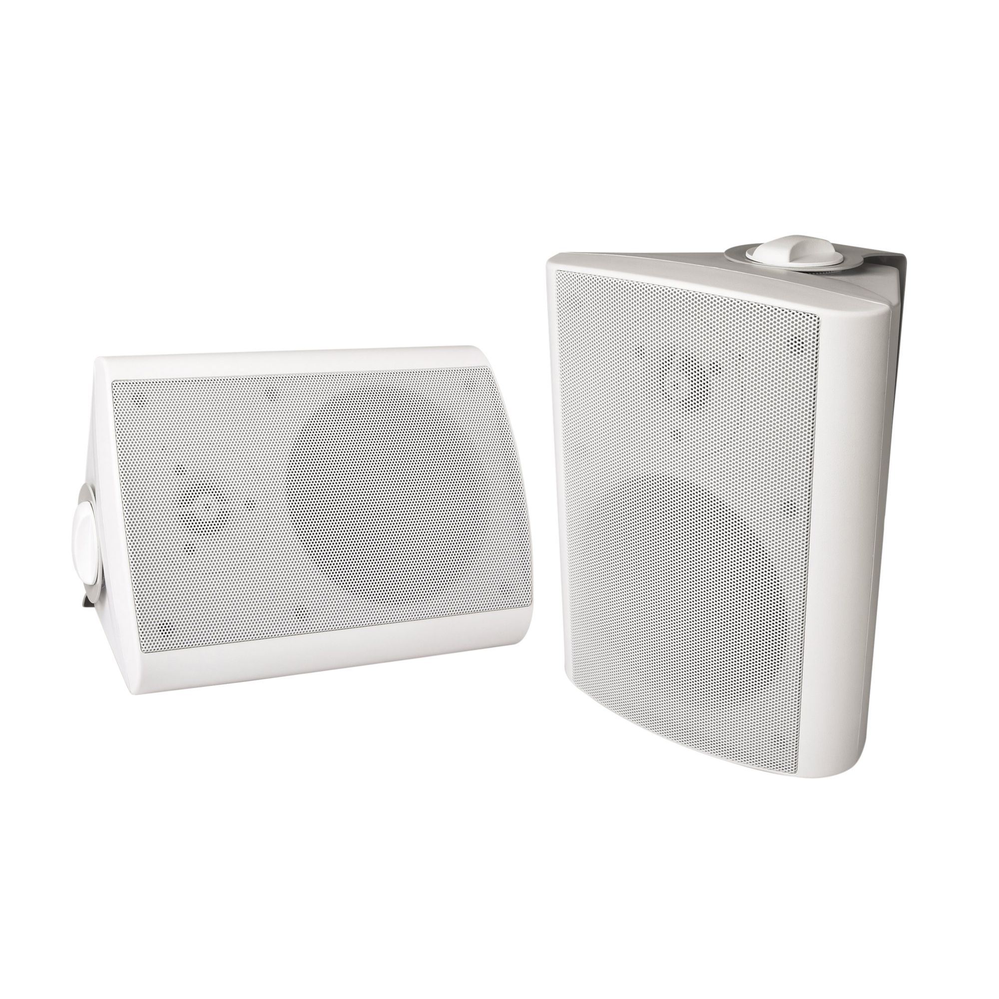 Durable for all weather types 18 hours of playtime Pair to your device via Bluetooth Can be painted to match your decor Easy to mount with adjustable swivel brackets Rechargeable: extra long power cables and extension cables included for convenient charging 60W of power Includes two mountable wireless speakers with brackets attached, two power adapters (5' cables), two power extension cables (6'), QSG Warranty: 1 year limited