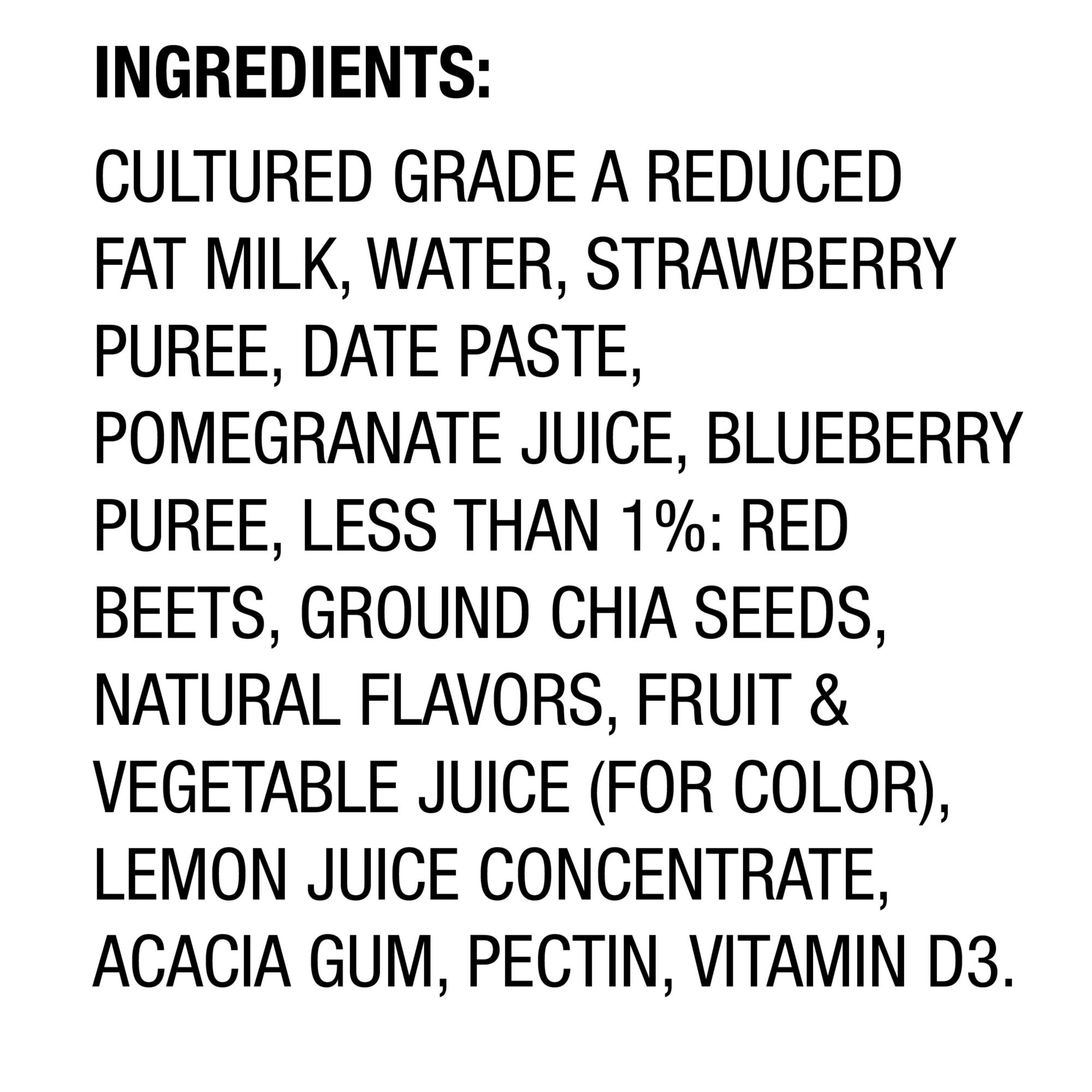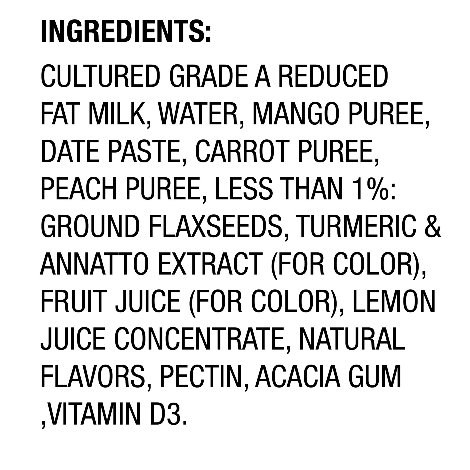 Ingredients: Cultured Grade A Reduced Fat Milk, Water, Mango Puree, Date Paste, Carrot Puree, Peach Puree, Less than 1%: Ground Flaxseeds, Turmeric & Annatto Extract (for Color), Fruit Juice (for Color), Lemon Juice Concentrate, Natural Flavors, Pectin, Acacia Gum, Vitamin D3.