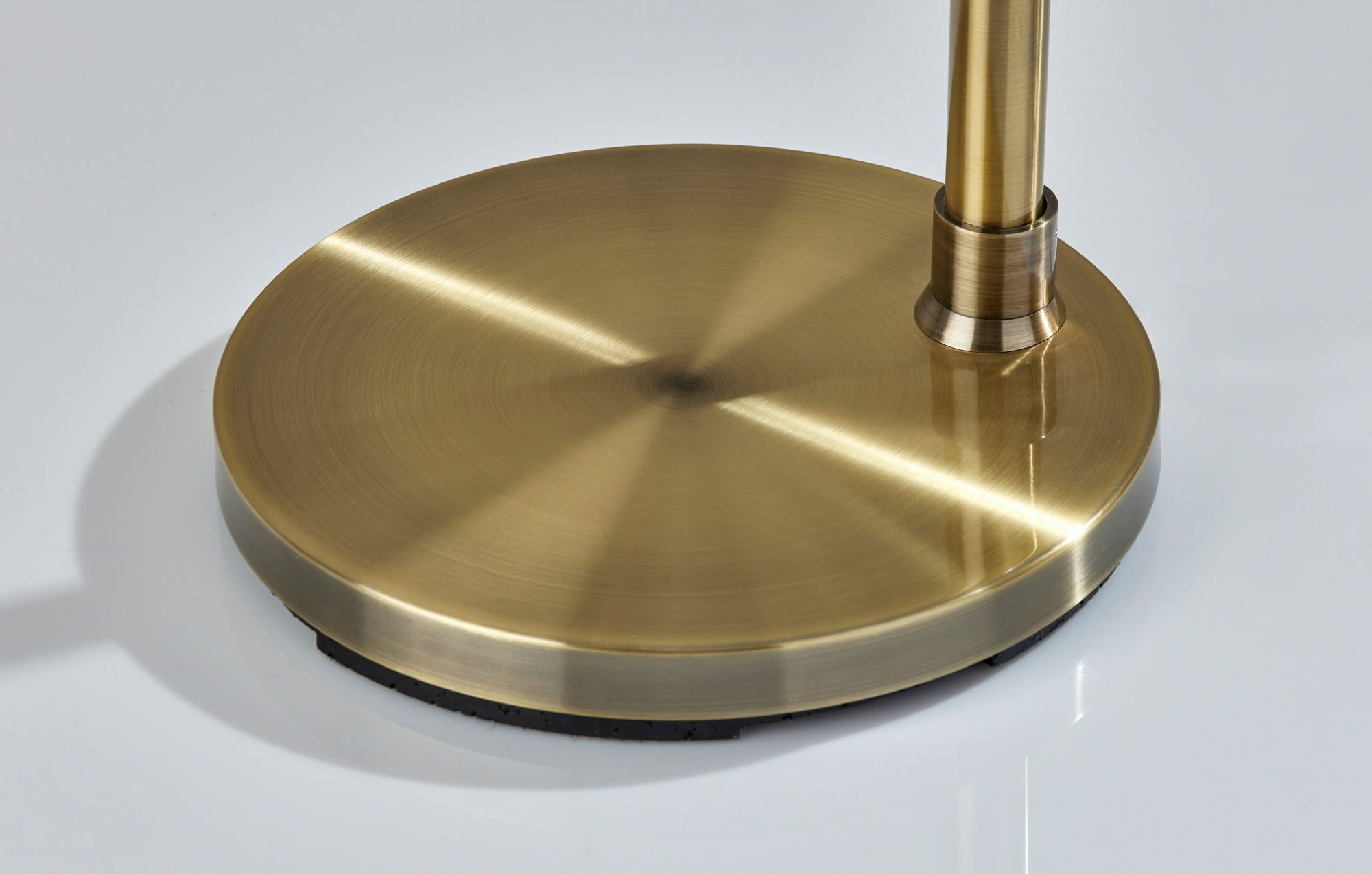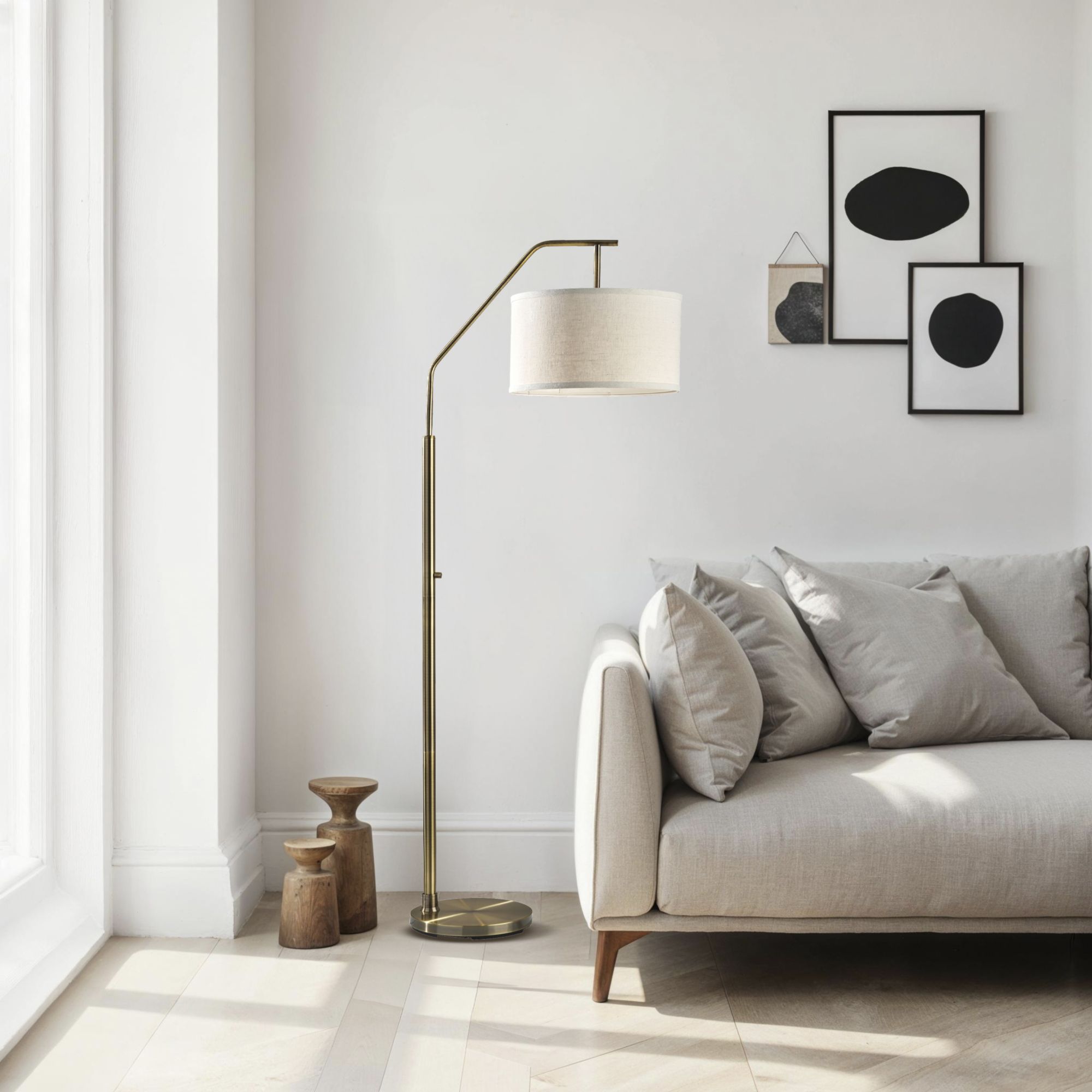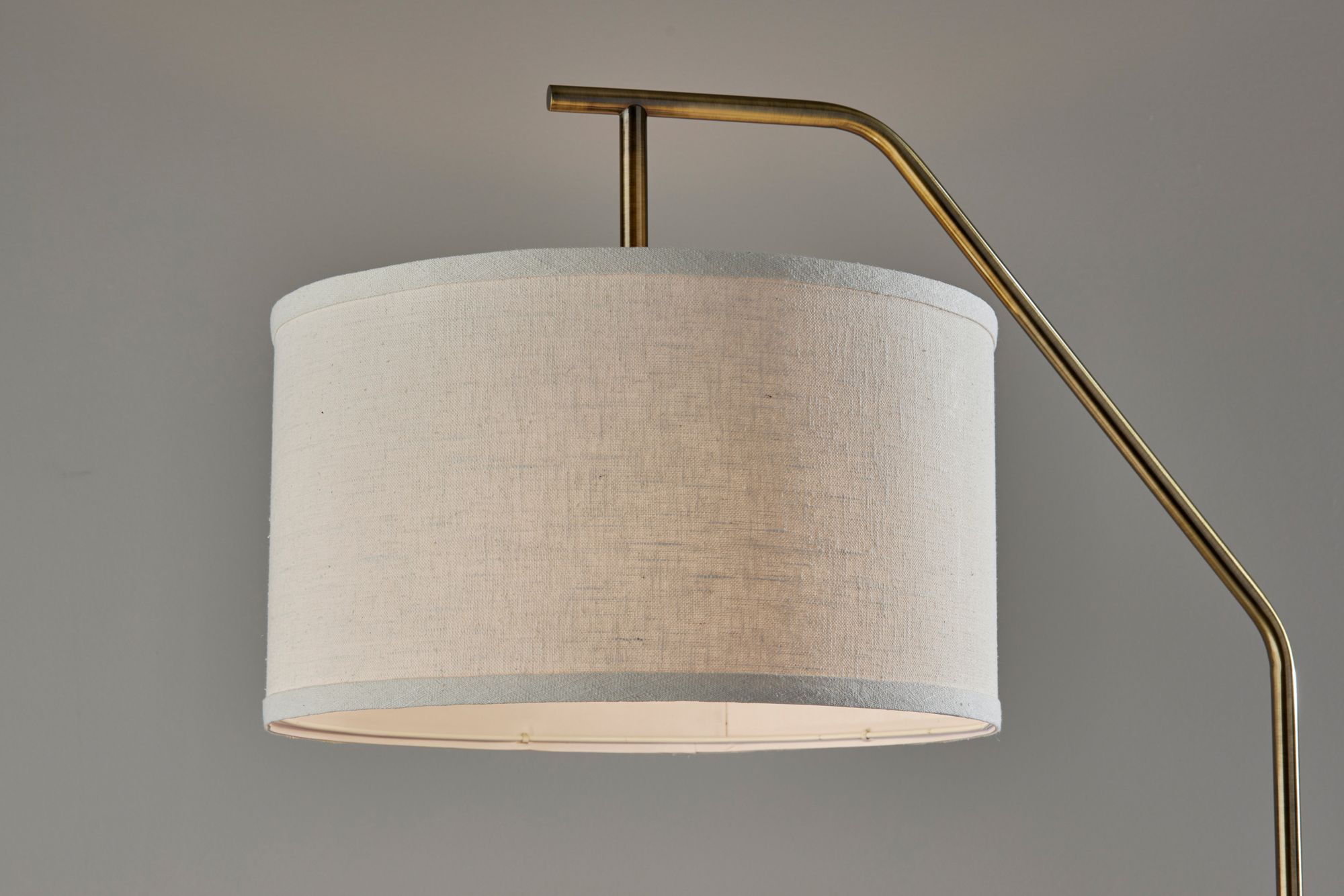 The Max Floor Lamp by Adesso pairs simplicity, clean lines and modern styling to create an essential part of your home décor when placed beside sofas or chairs. Crafted with an antique brass finish, the lamp is anchored by a 12' diameter round base supporting a tall, slim pole. A matching arm with softened angles holds a short drum shade. The off-white fabric shade has elegant trim along the top and bottom and delicate texturing for a soft, diffused glow. The task or decorative lighting the 100-Watt bulb is easily turned on and off with a rotary switch conveniently located on the pole. Height is 66".