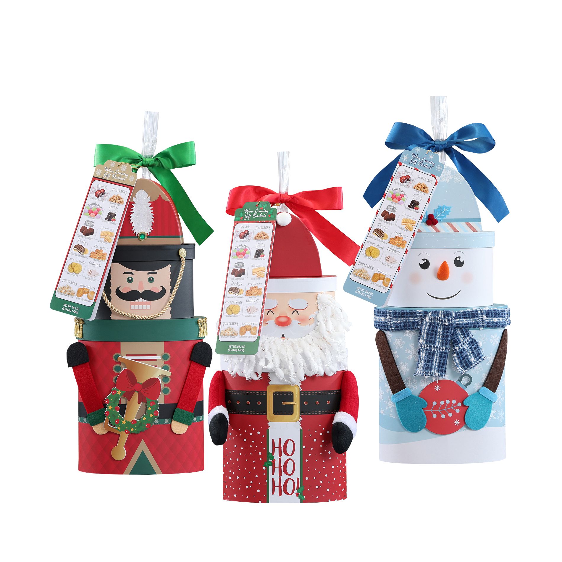 These charming characters are filled to the brim with an abundance of delicious sweets making them a perfect gift for someone special or a treat to share with a group. Each tower is filled with a variety of goodies including caramel corn, kettle corn, sweet butterscotch candy, spice drops, indulgent Truffettes de France, smooth Lindt Lindor chocolates and a soft souffle cake. The tower can also be used as a centerpiece or holiday decoration.