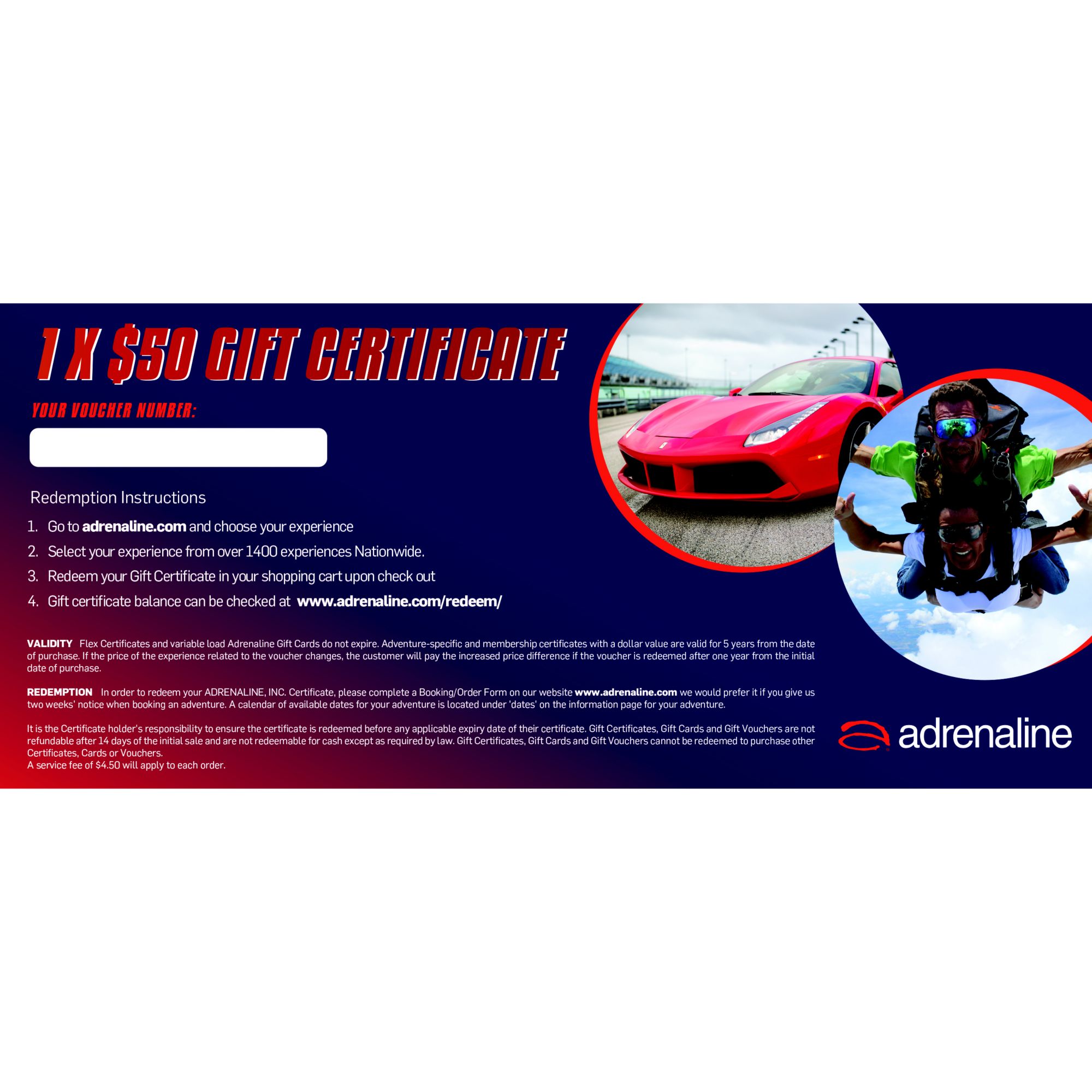 Give the gift of Adrenaline Pick from over 1,400 Flying & Driving Experiences, Land Adventures, and Water Excursions Lowest-price guaranteed Fully transferrable and does not expire Includes two $50 gift cards