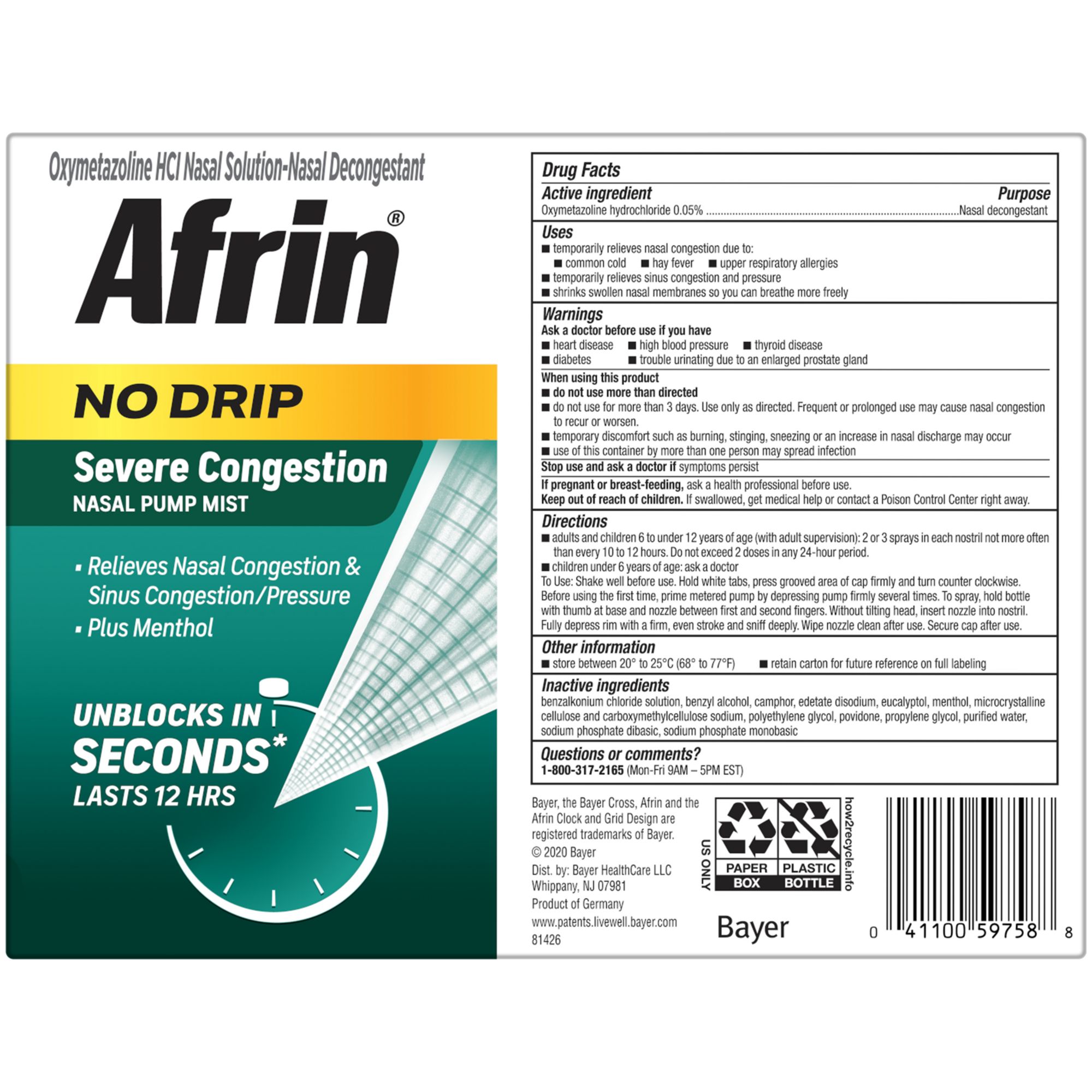 3 20mL bottles Delivers nasal congestion relief for up to 12 hours Fast, powerful congestion relief in seconds Patented Afrin No Drip nasal spray formula won't drip down nose or throat Provides maximum nasal congestion relief plus soothing menthol #1 Doctor & Pharmacist recommended Nasal Spray Brand