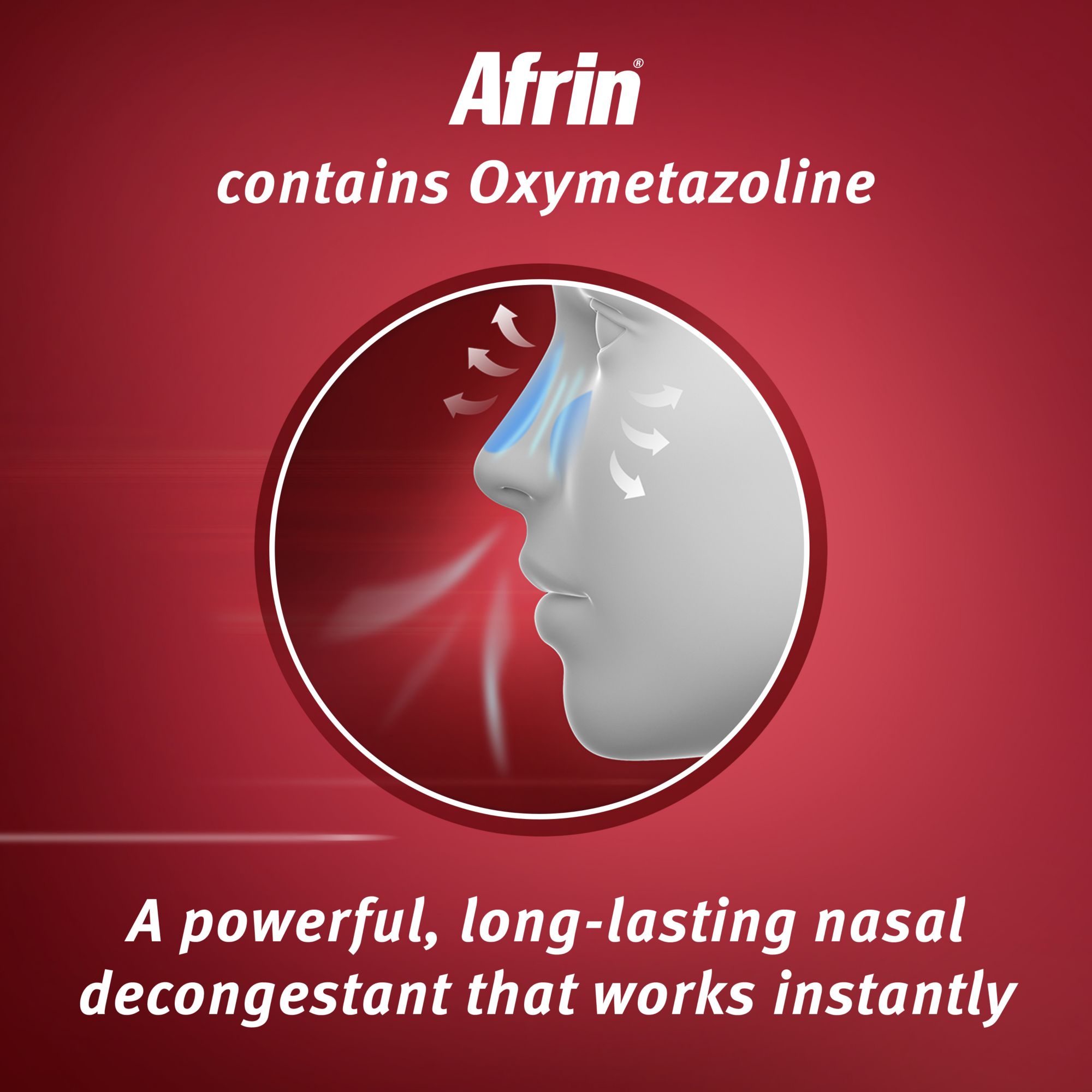 Afrin contains Oxymetazoline - a powerful, long-lasting nasal decongestant that works instantly.