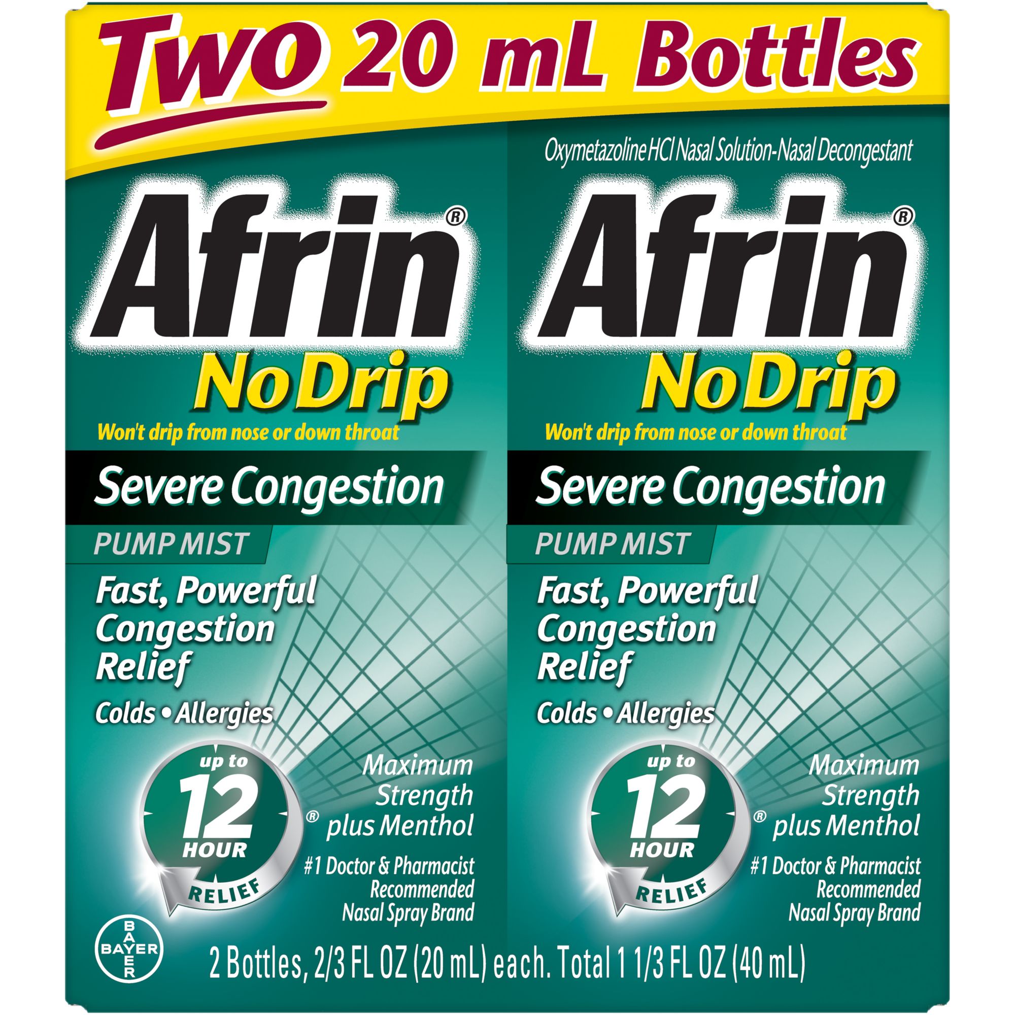 Temporarily relieves nasal congestion due to the common cold, hay fever and upper respiratory allergies Temporarily relieves sinus congestion and pressure and shrinks swollen nasal membranes to promote easier breathing Formulated with aromatic menthol to help clear nasal passages Starts to work in seconds and lasts for up to 12 hours Provides relief without causing drowsiness for safe use No-drip pump mist is designed not to drip from the nose or down the throat Adults and children 6 to under 12 years of age (with adult supervision): 2 or 3 sprays in each nostril not more often than every 10 ' 12 hours; do not exceed 2 doses in any 24-hour period Children under 6 years of age: ask a doctor Contains oxymetazoline hydrochloride