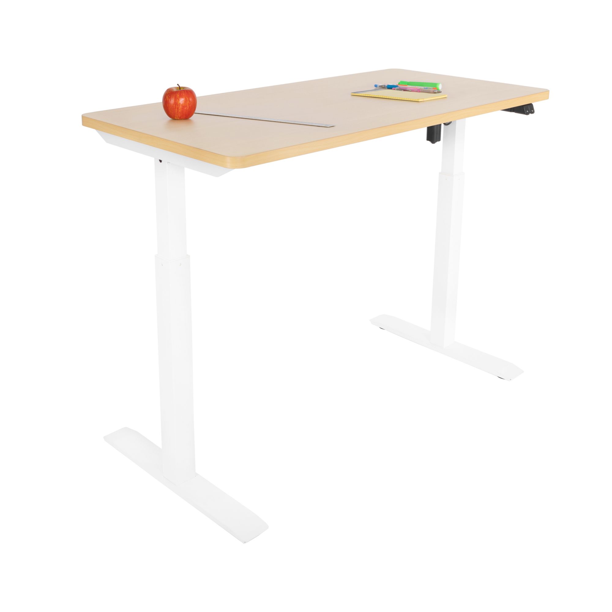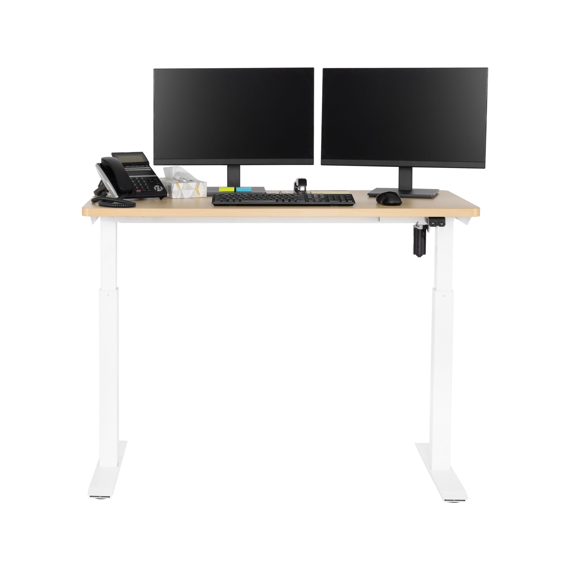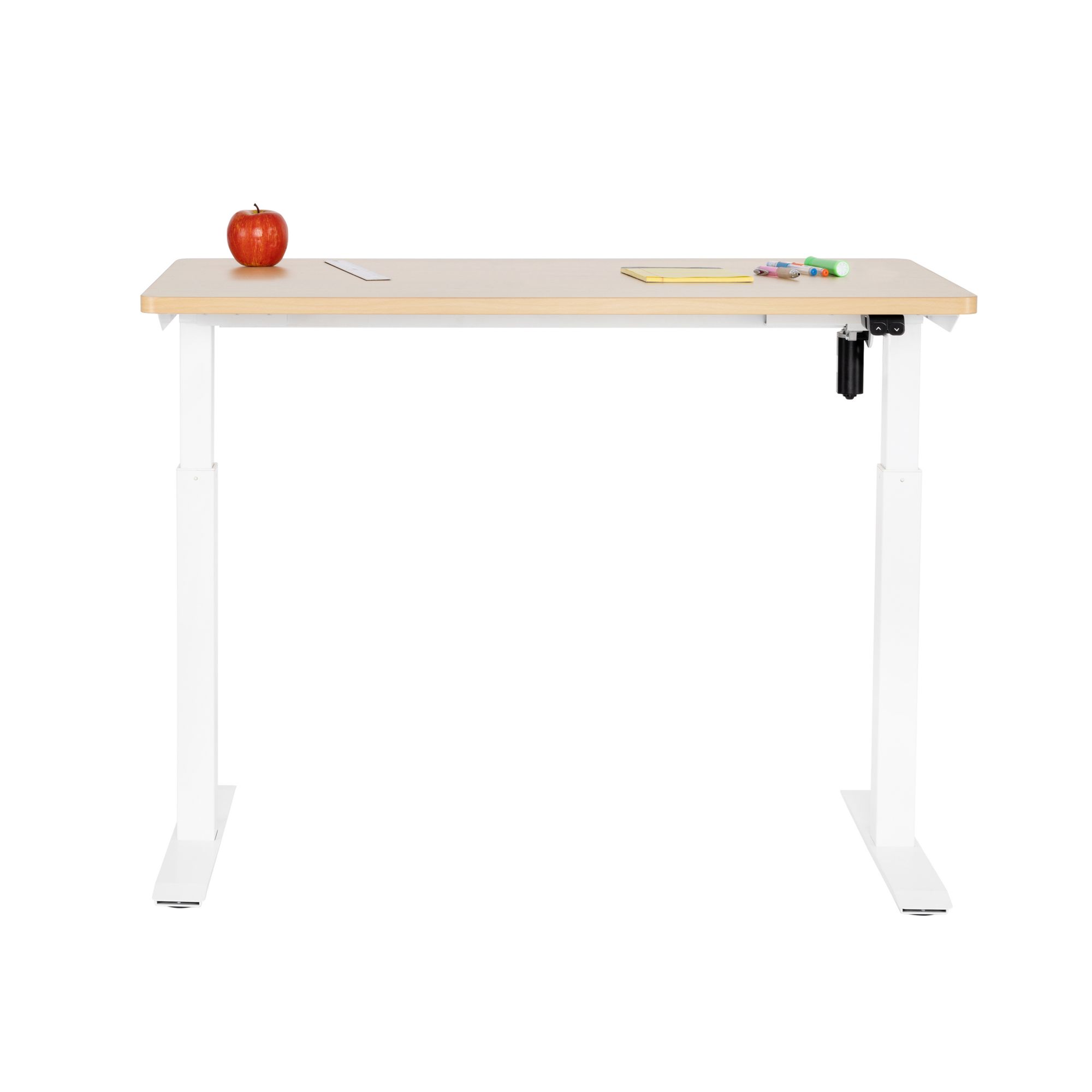 Includes MDF desk-top, leg set, support bracket, two feet, power adapter, controller, power cord, two cable ties, screw packet
