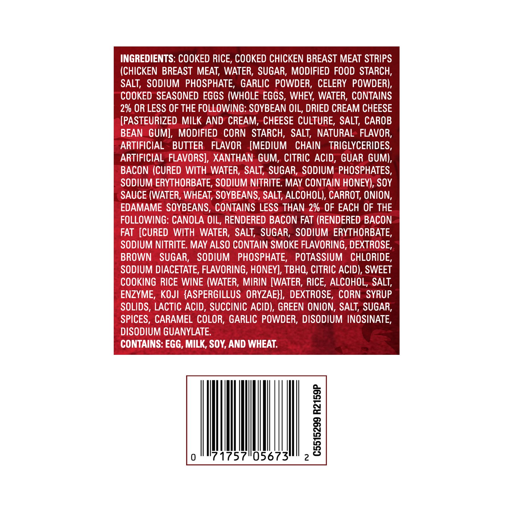 Ingredients: Cooked Rice, Cooked Chicken Breast Meat-Strips (Chicken Breast Meat, Water, Sugar, Modified Food Starch, Salt, Sodium Phosphate, Garlic Powder, Celery Powder), Cooked Seasoned Eggs (Whole Eggs, Whey, Water, Contains, 2% or Less of the Following: Soybean Oil, Dried Cream Cheese [Pasteurized Milk and Cream, Cheese Culture, Salt, Carob Bean Gum], Modified Corn Starch, Salt, Natural Flavor, Artificial Butter Flavor [Medium Chain Triglycerides, Artificial Flavors), Xanthan Gum, Citric Acid, Guar Gum), Bacon (Cured with Water, Salt, Sugar, Sodium Phosphates, Sodium Erythorbate, Sodium Nitrite, May Contain Honey), Soy Sauce (Water, Wheat, Soybeans, Salt, Alcohol), Carrot, Onion, Edamame Soybeans, Contains Less than 2% of Each of the Following: Canola Oil, Rendered Bacon Fat (Rendered Bacon Fat (Cured with Water, Salt, Sugar, Sodium Erythorbate, Sodium Nitrite, May Also Contain Smoke Flavoring, Dextrose, Brown Sugar, Sodium Phosphate, Potassium Chloride, Sodium Diacetate, Flavoring, Honey], TBHQ, Citric Acid), Sweet Cooking Rice Wine (Water, Mirin [Water, Rice, Alcohol, Salt, Enzyme, Koji {Aspergillus Oryzae}], Dextrose, Corn Syrup Solids, Lactic Acid, Succinic Acid), Green Onion, Salt, Sugar, Spices, Caramel Color, Garlic Powder, Disodium Inosinate, Disodium Guanylate.