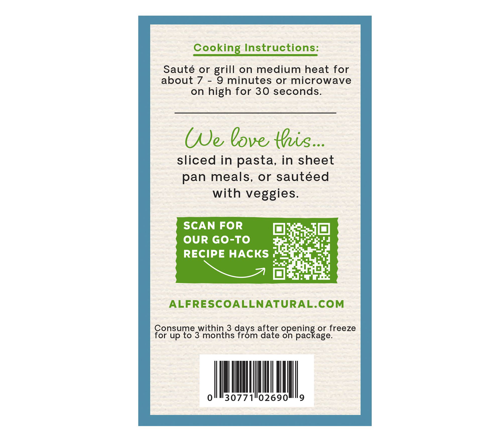 Al Fresco's all-natural* Roasted Pepper & Asiago Fully Cooked Chicken Sausage is made with chicken raised in the U.S.A. and real ingredients you can see and taste. It’s a smoky, savory flavor that is balanced with the creamy richness of melted Asiago. With honest to goodness flavor you can turn your go-to dishes into everyday ta-das! We love our Roasted Pepper & Asiago Fully Cooked Chicken Sausage sliced in pasta, stir fried with veggies, or added to soups. *No Artificial Ingredients, Minimally Processed.
